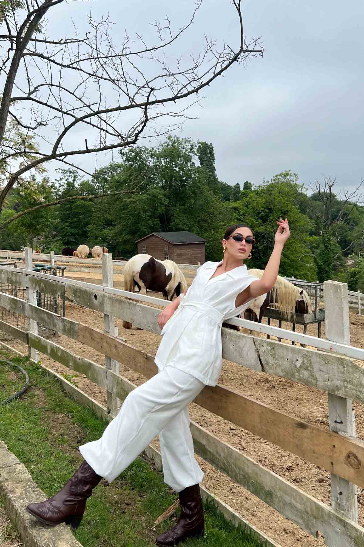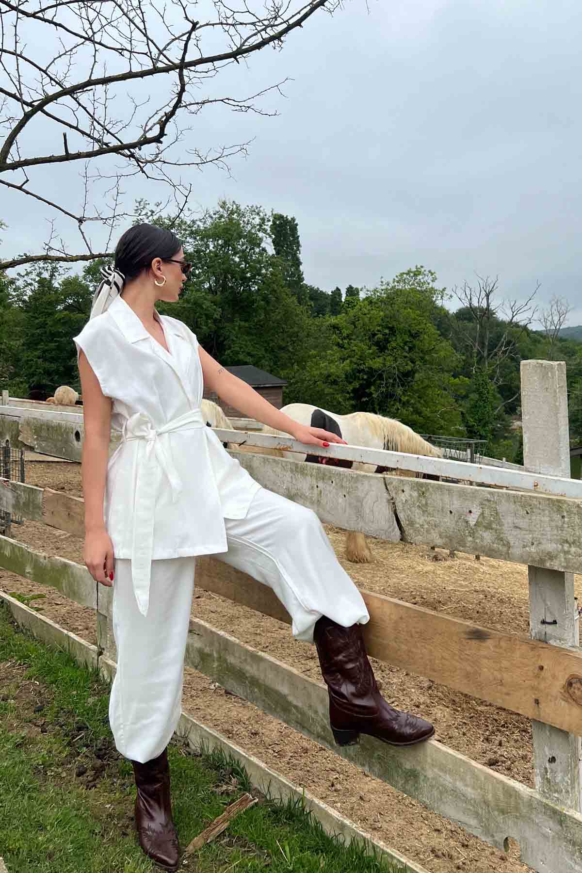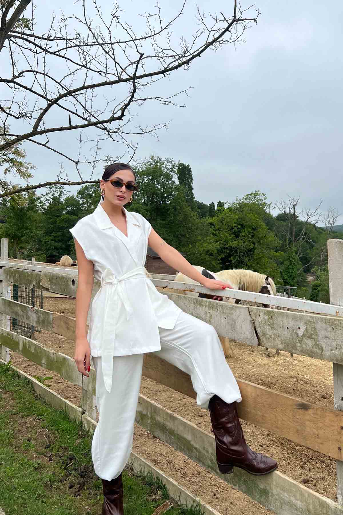 Ekru Şal Yaka Kemerli Yelek Pantolon Takım SY-2101-Ekru