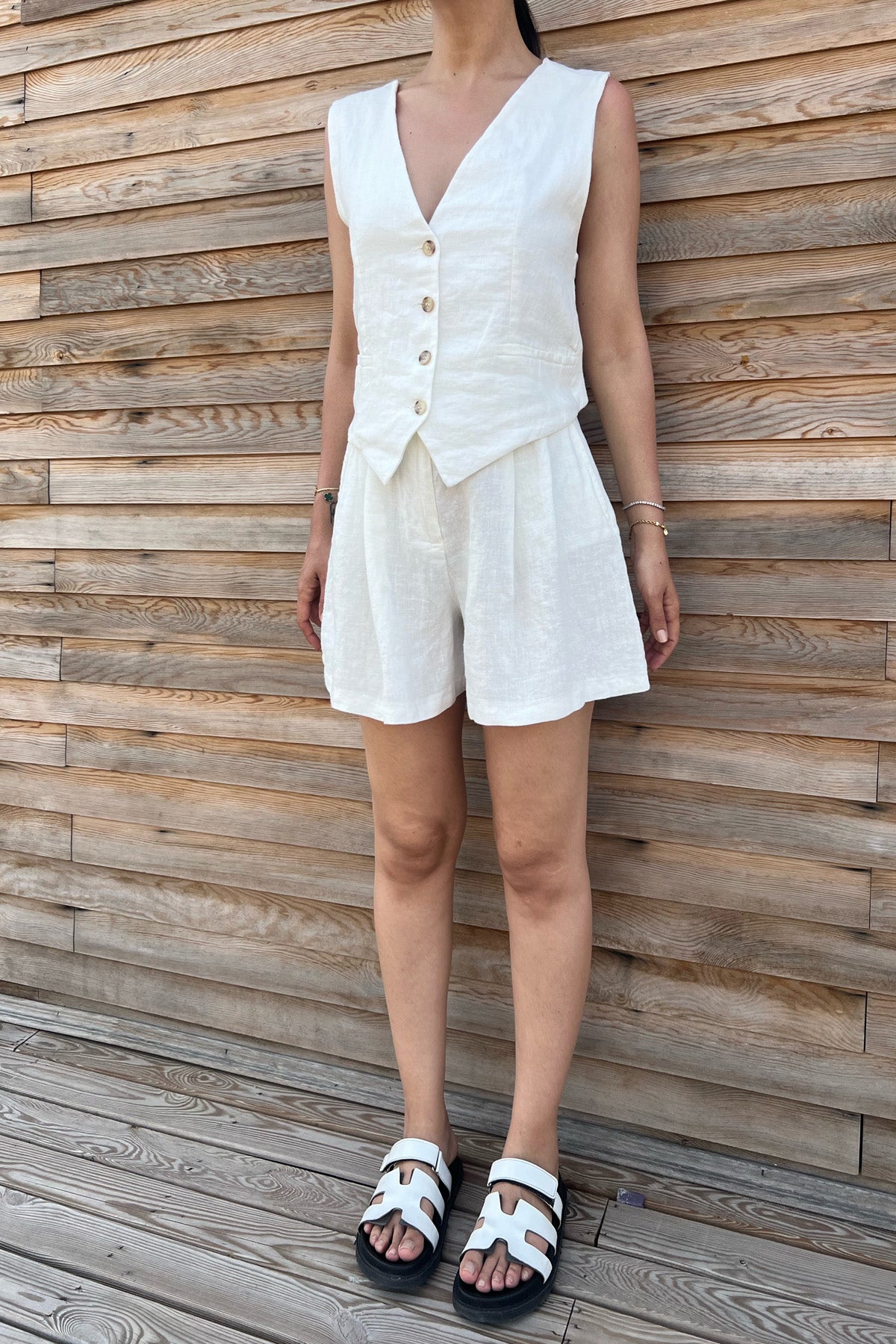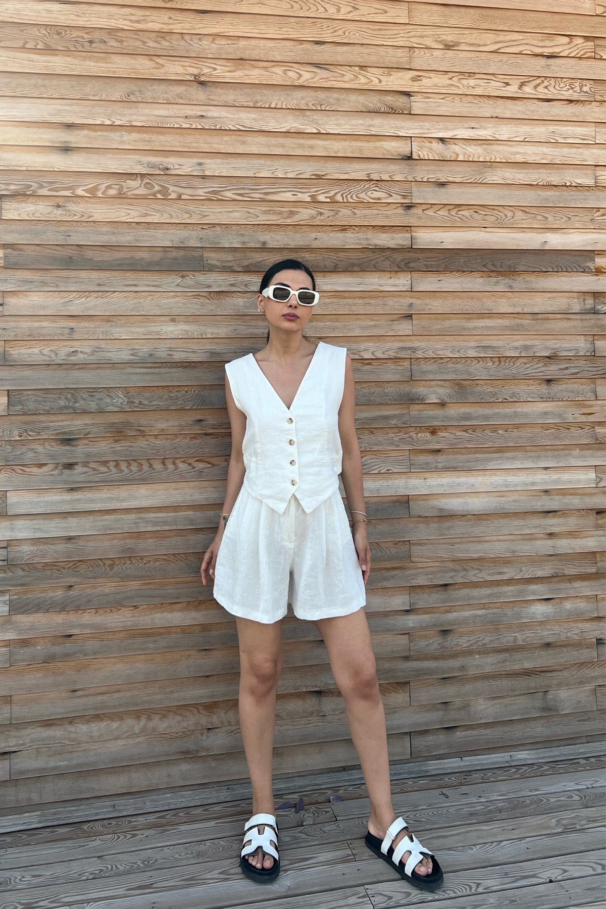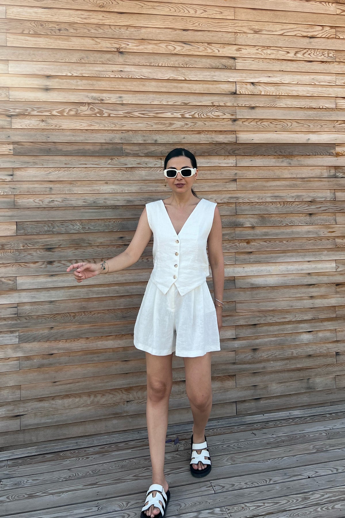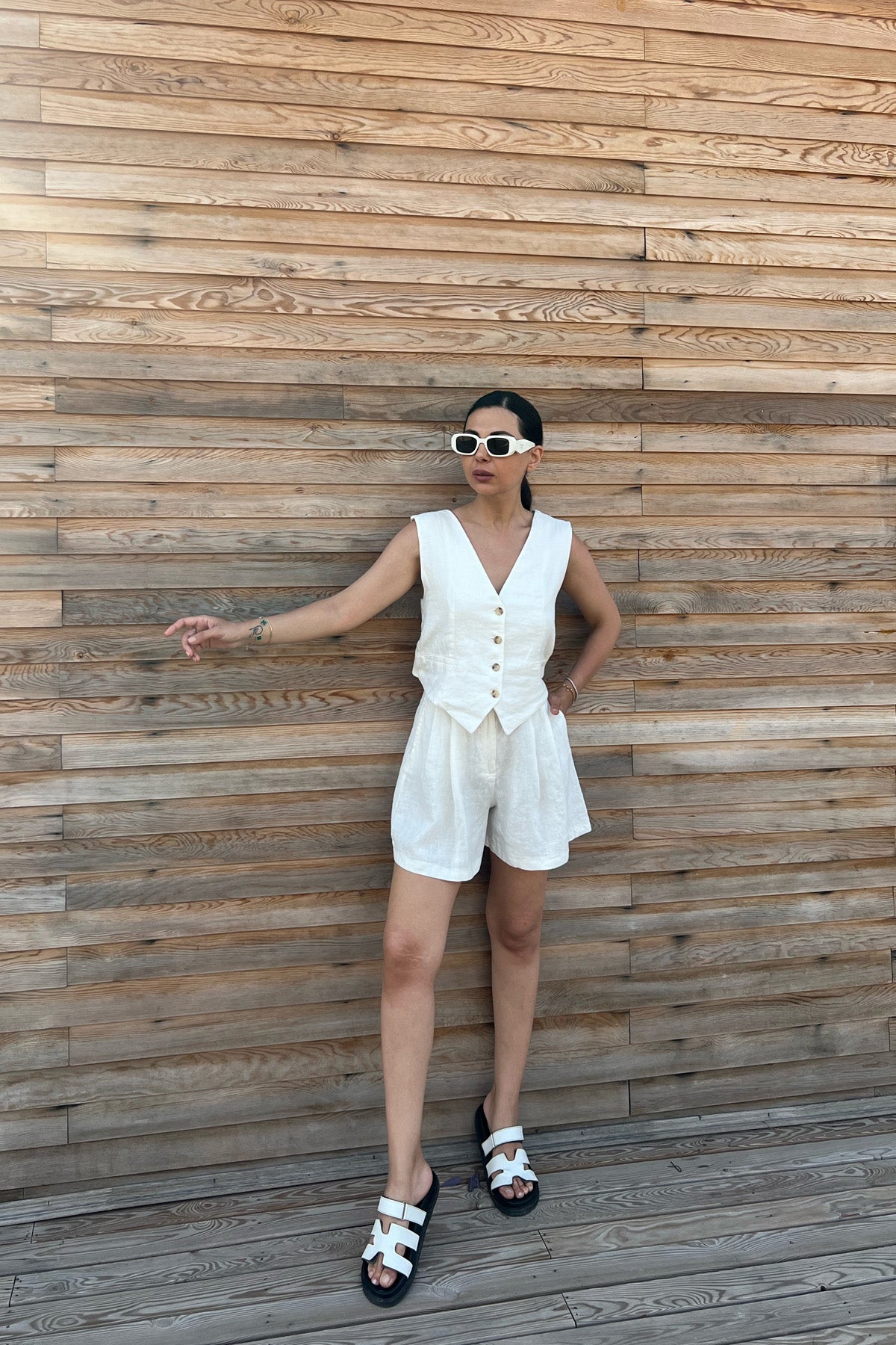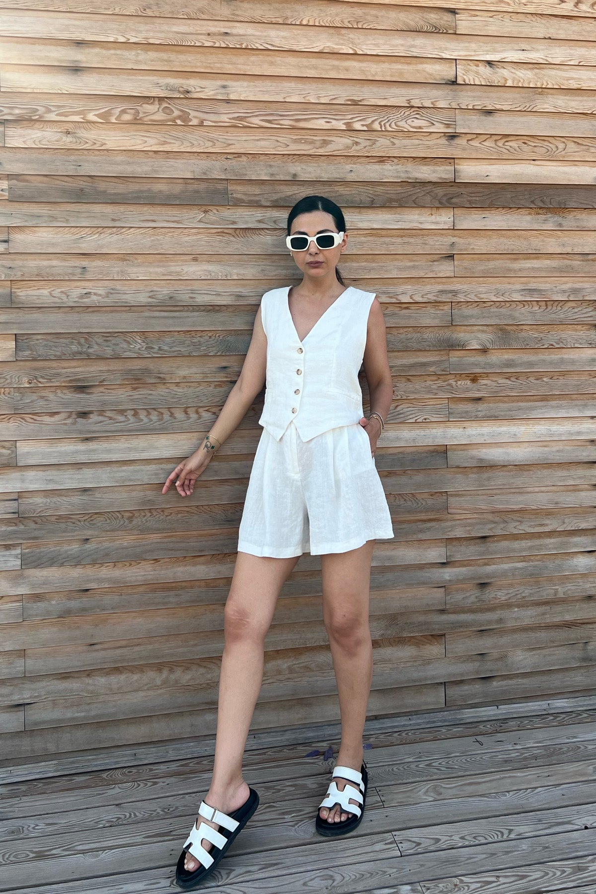 Ekru Sırt Detaylı Yelek Şort Keten Takım SY-2186-Ekru