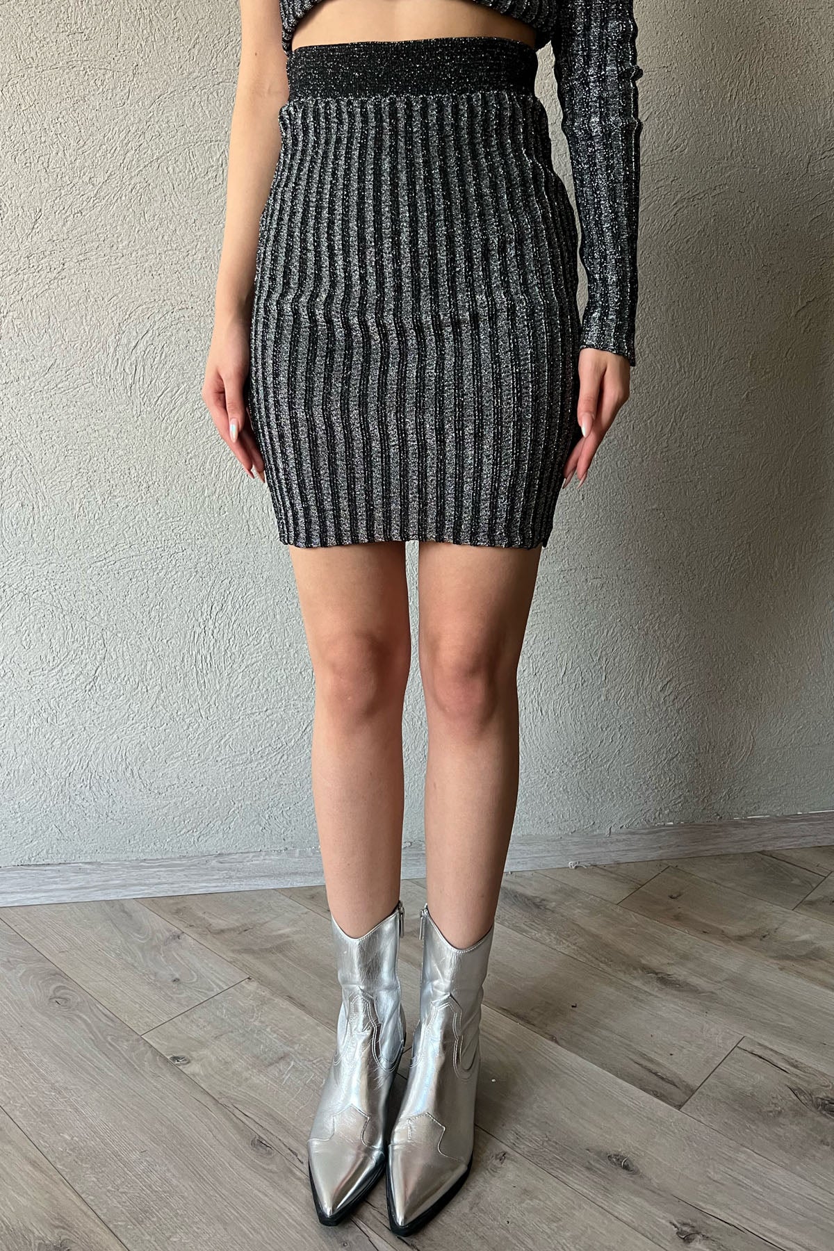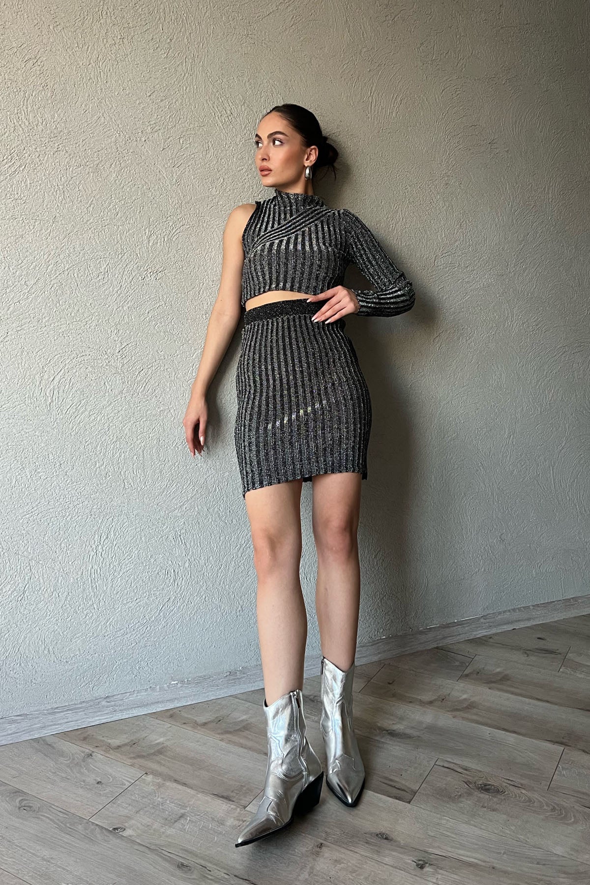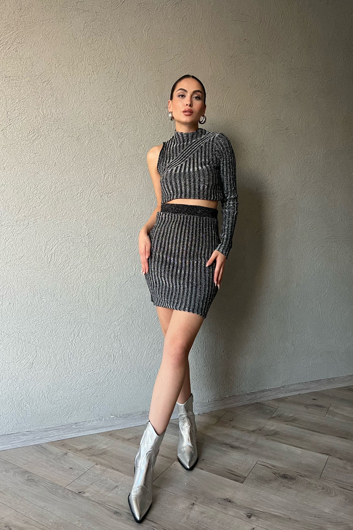 Gri Pırıltılı Tek Kollu Crop Üst ve Belden Lastikli Etek Takım SY-1283-Gri