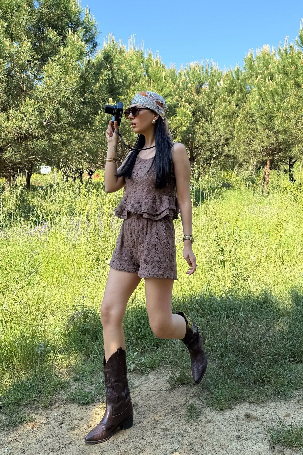 Kahve Askılı Şortlu Kroşe Takım SY-3184-Kahve