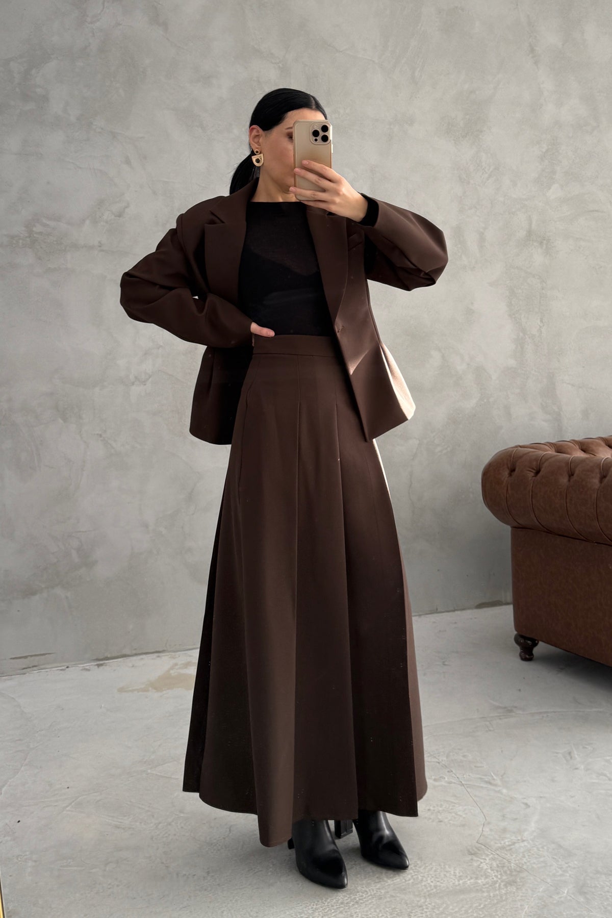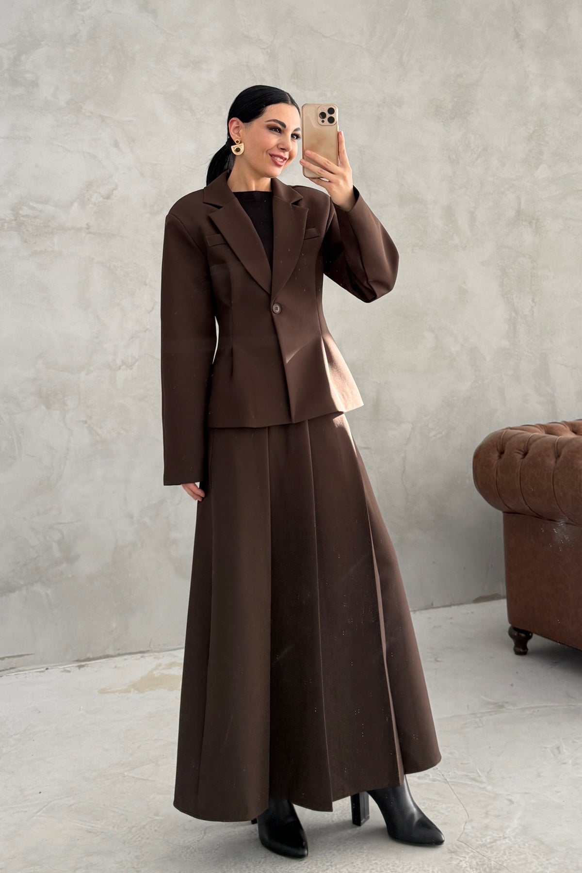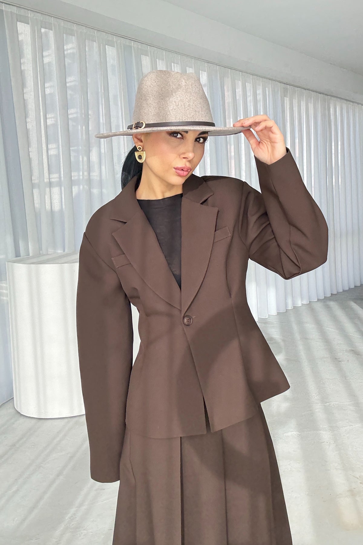 Ürün Detayları:Kahverengi Pli Detaylı Ceket Etek Takım