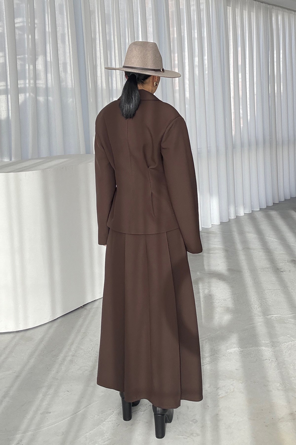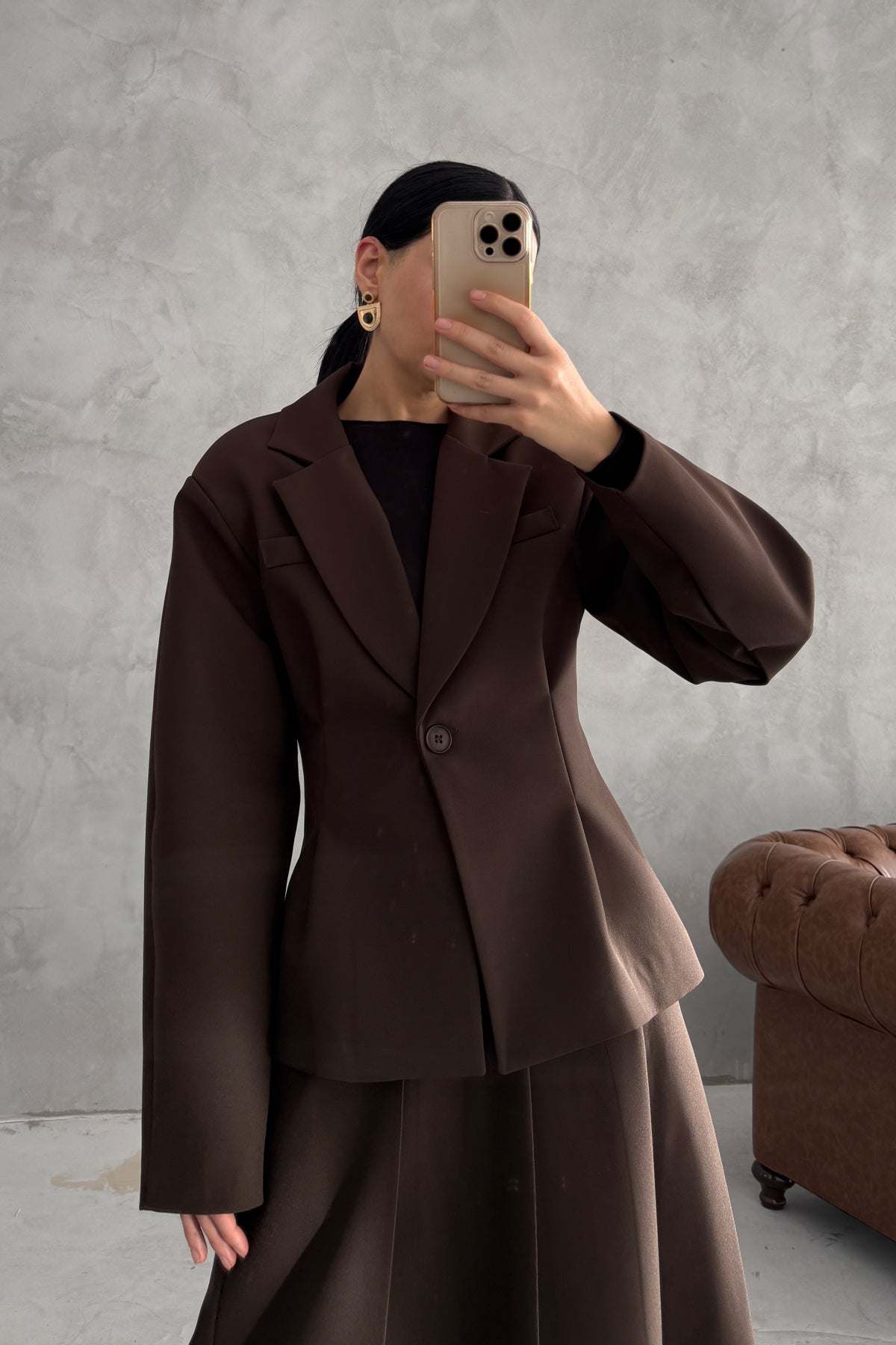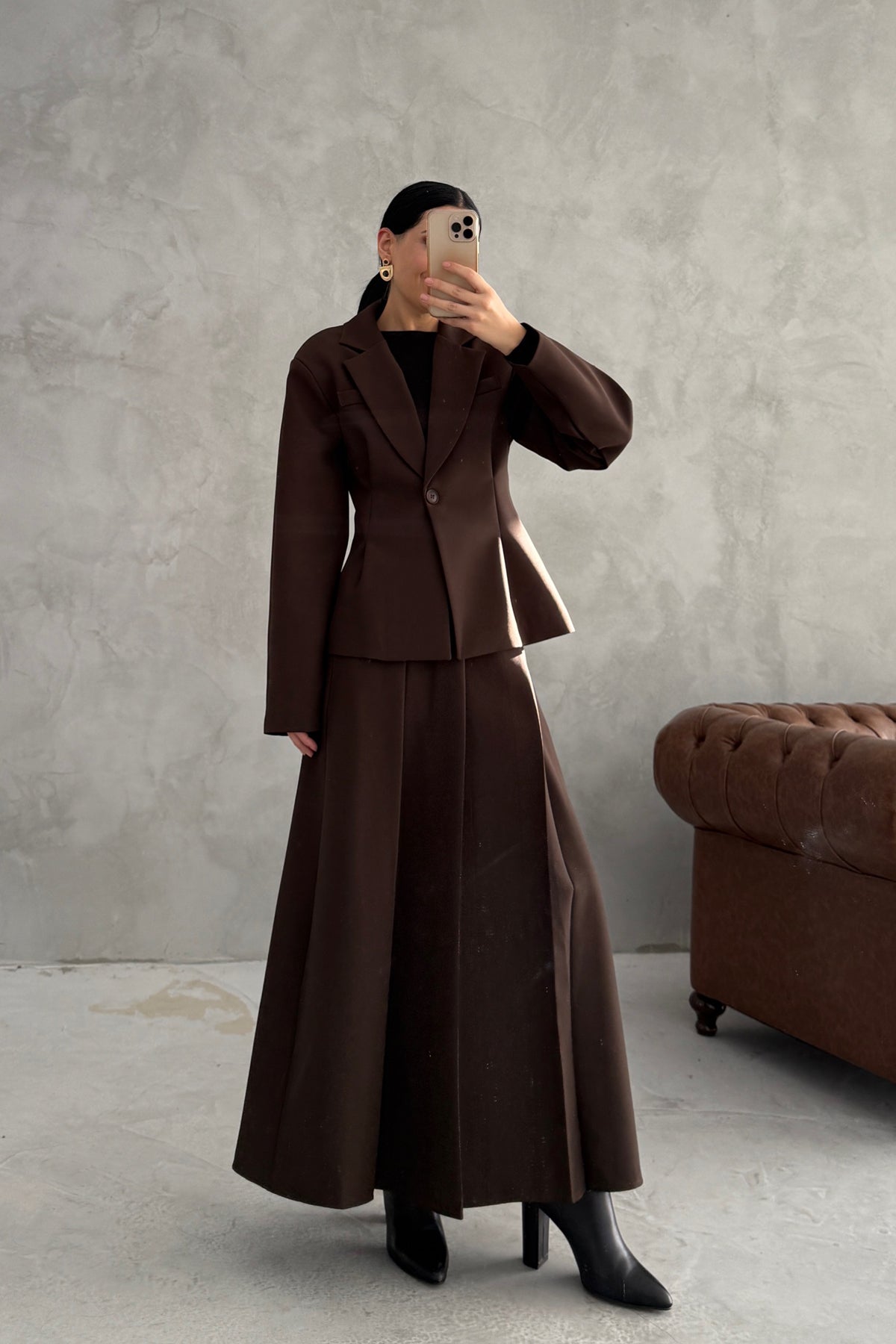 Ürün Detayları:Kahverengi Pli Detaylı Ceket Etek Takım
