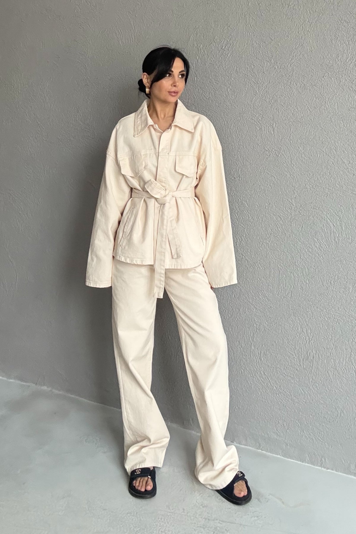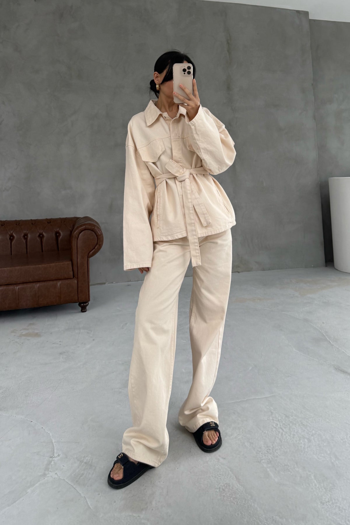 Krem Beli Bağlamalı Denim Ceket Pantolon Takım SY-2884-Krem