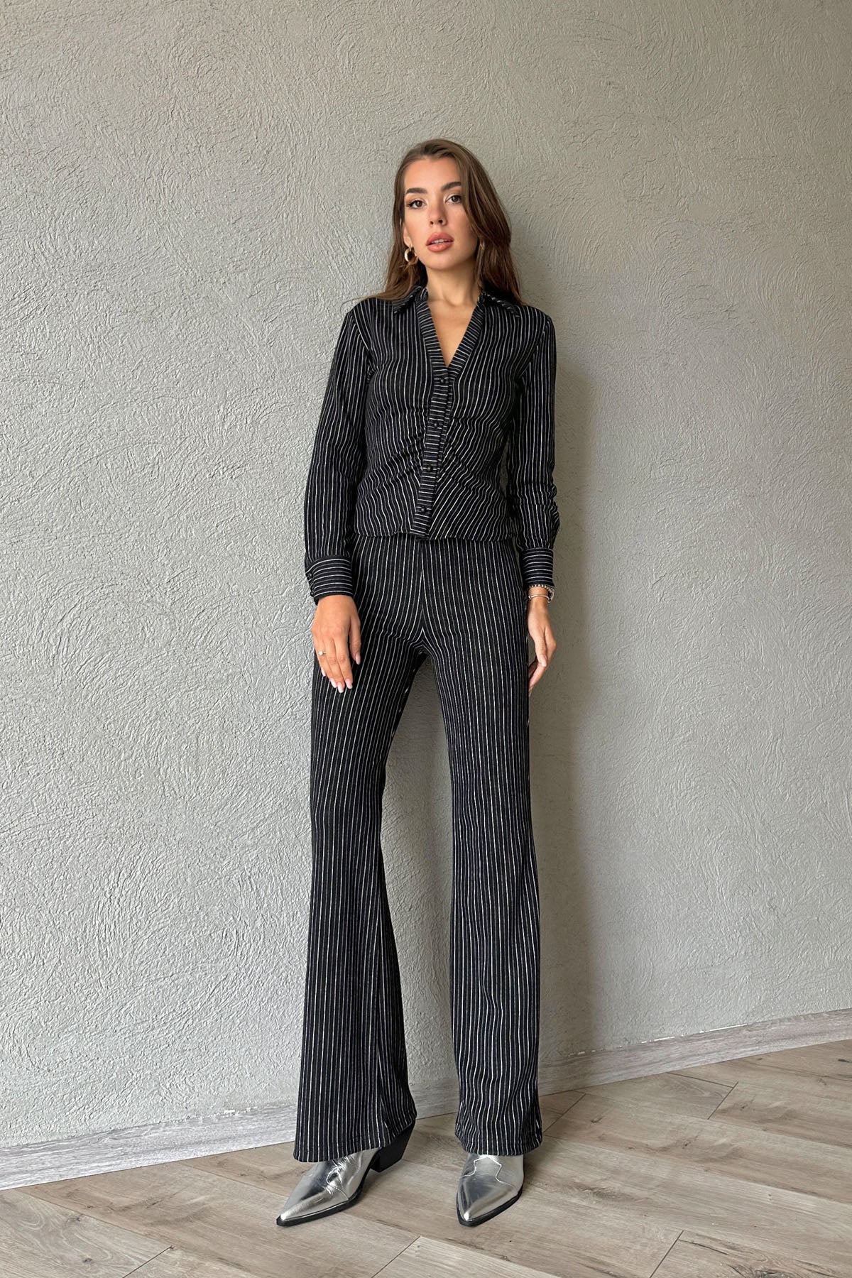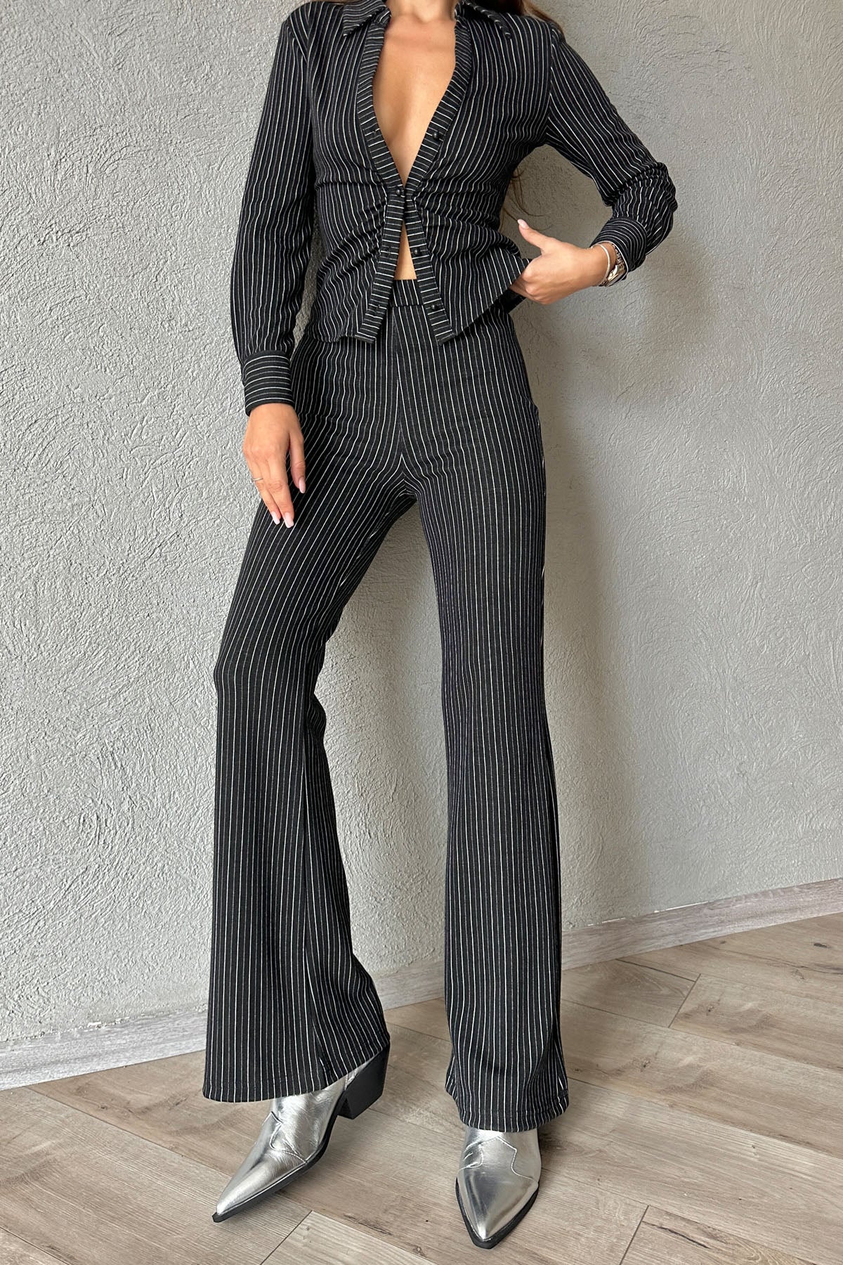 Ürün Detayları : Üst düğmeli çizgili, altı esnek pantolon takım.