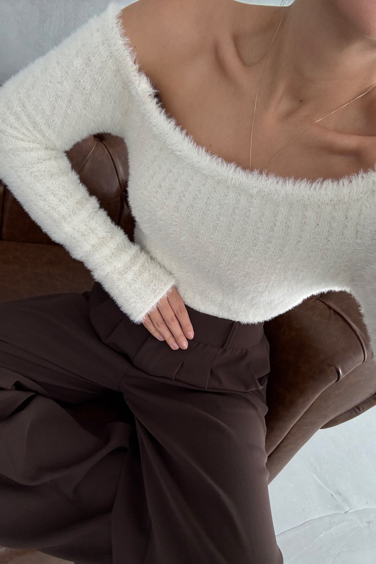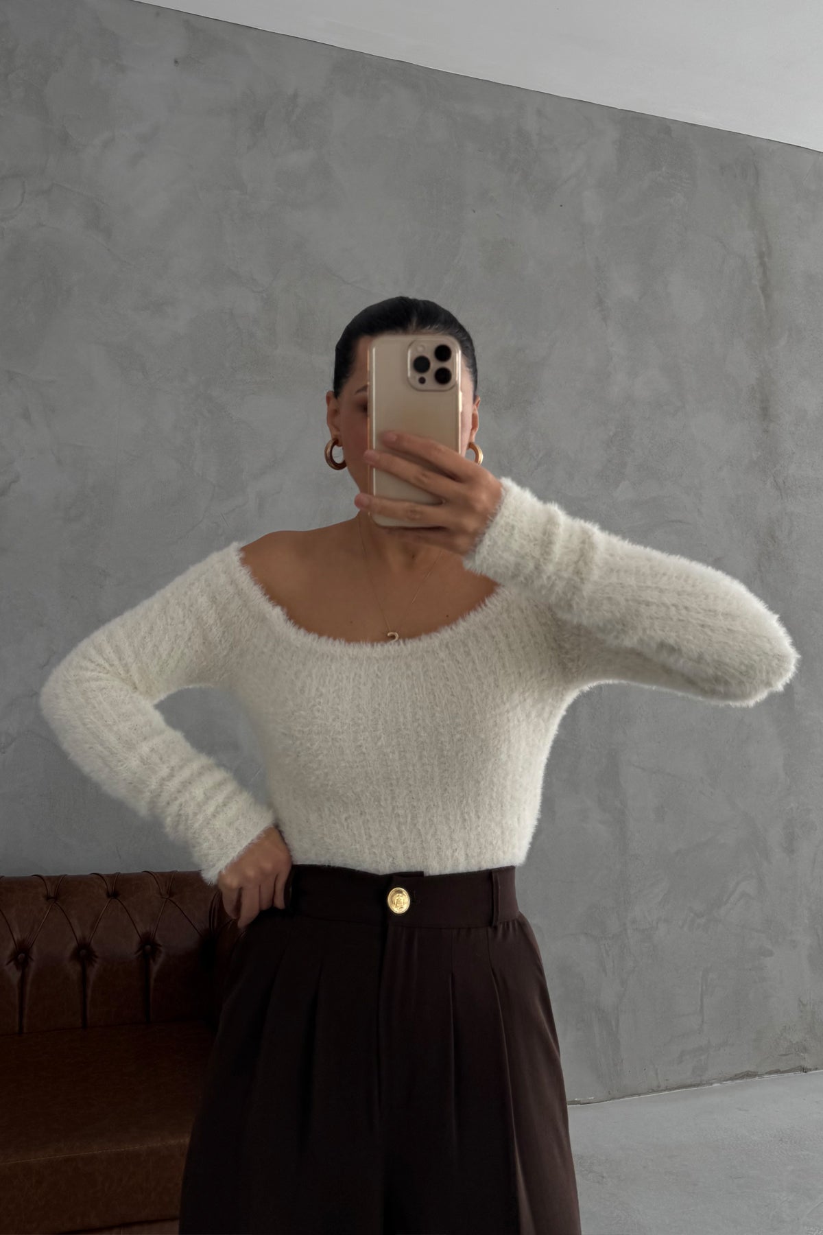Ürün Detayları :Ekru Sakallı Kayık Yaka Triko Kazak