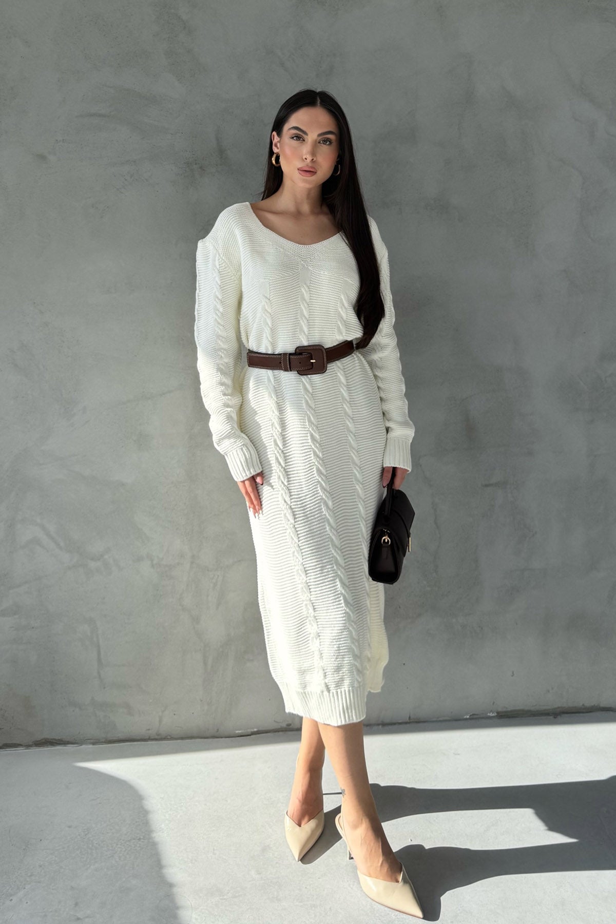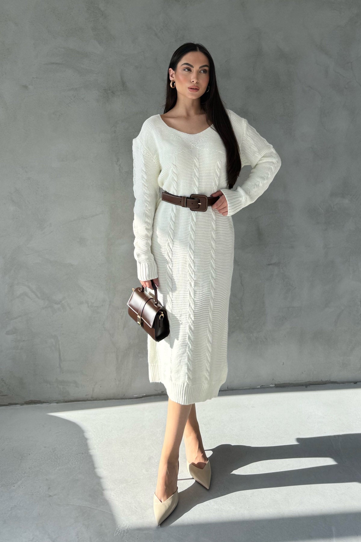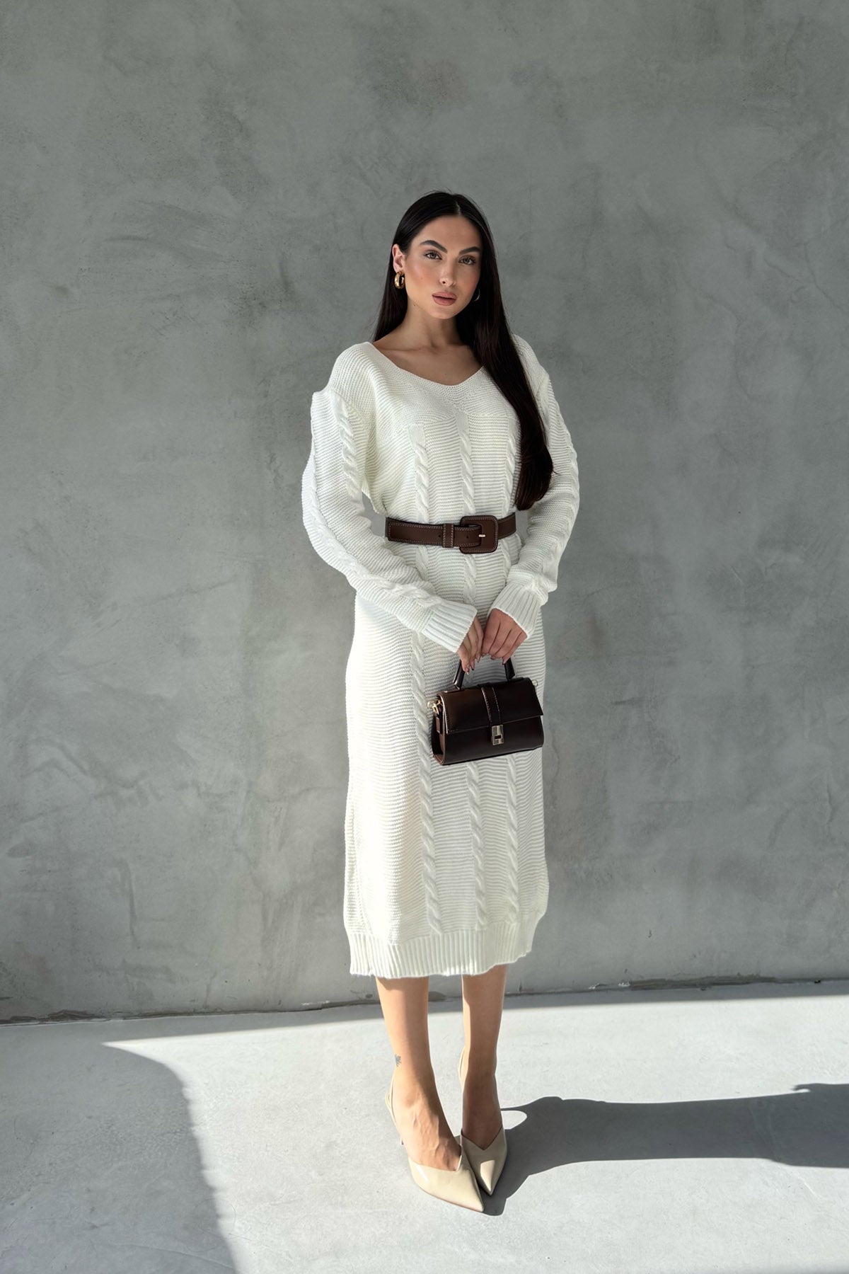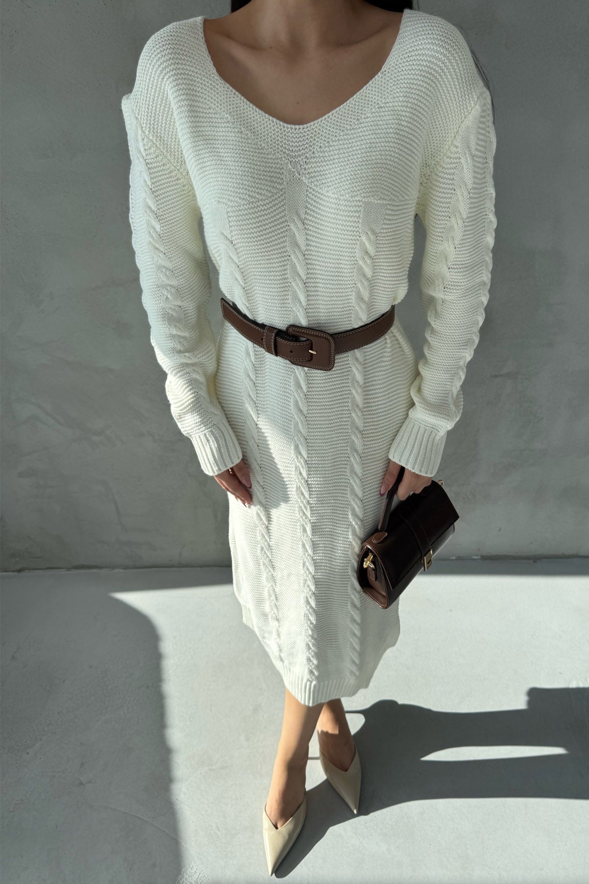 Ekru V Yaka Örgü Triko Elbise SY-2833-Ekru