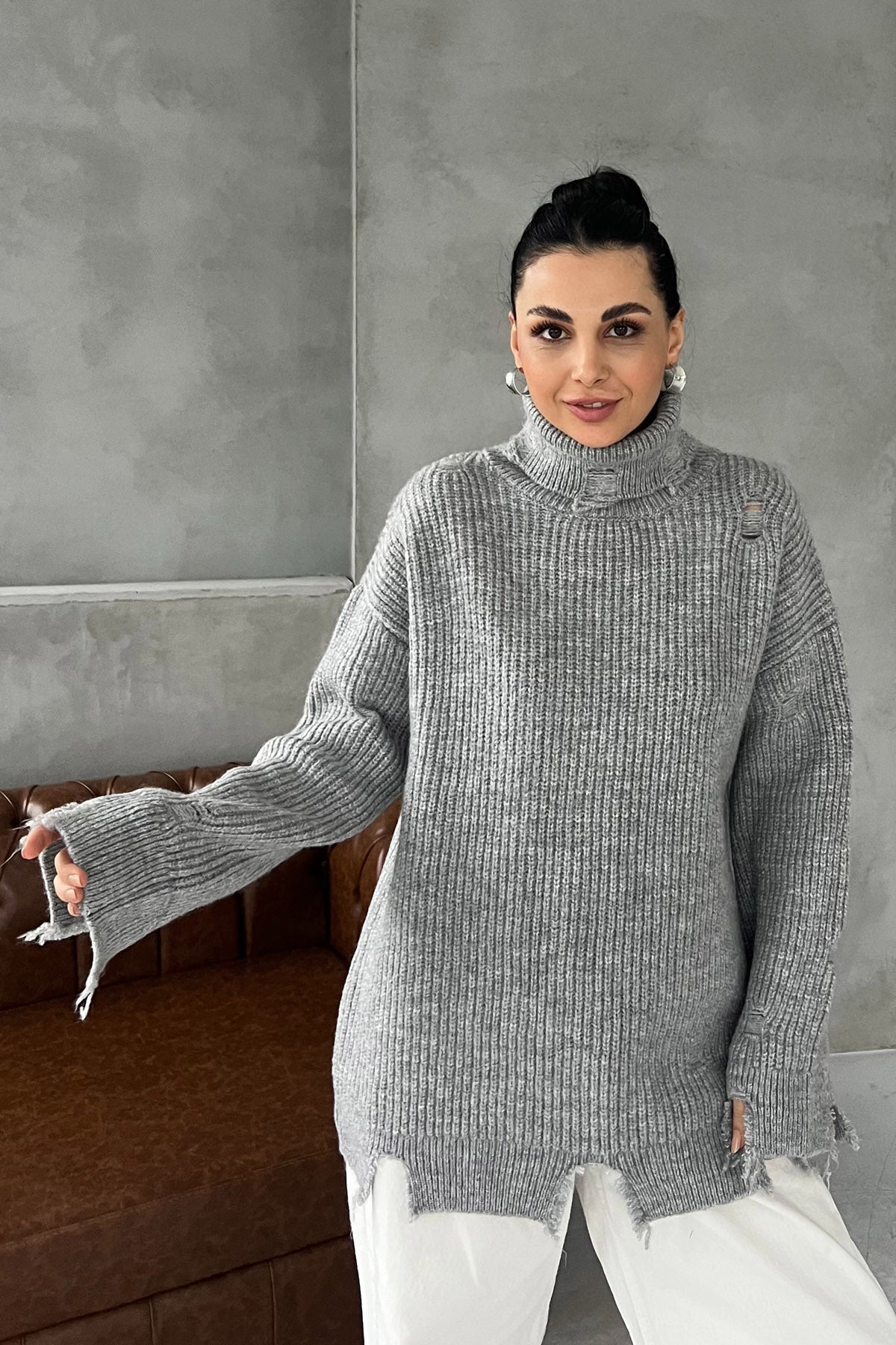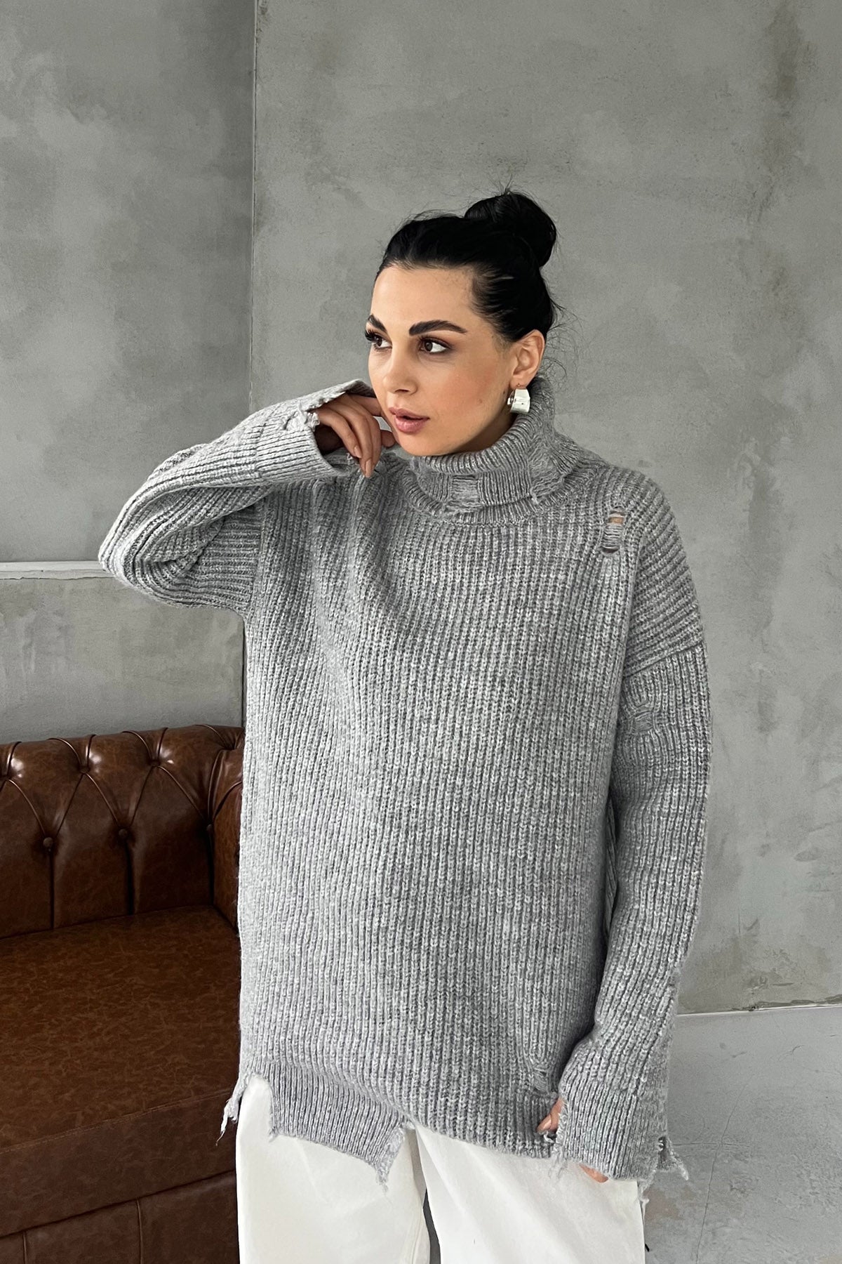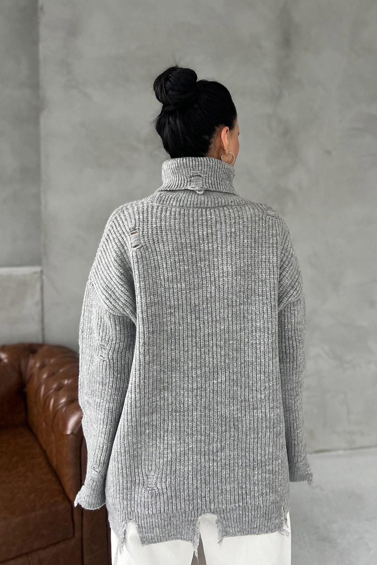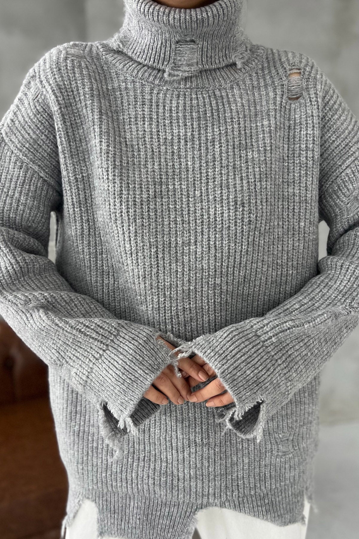 Gri Yırtık Detaylı Boğazlı Triko Kazak SY-2840-Gri