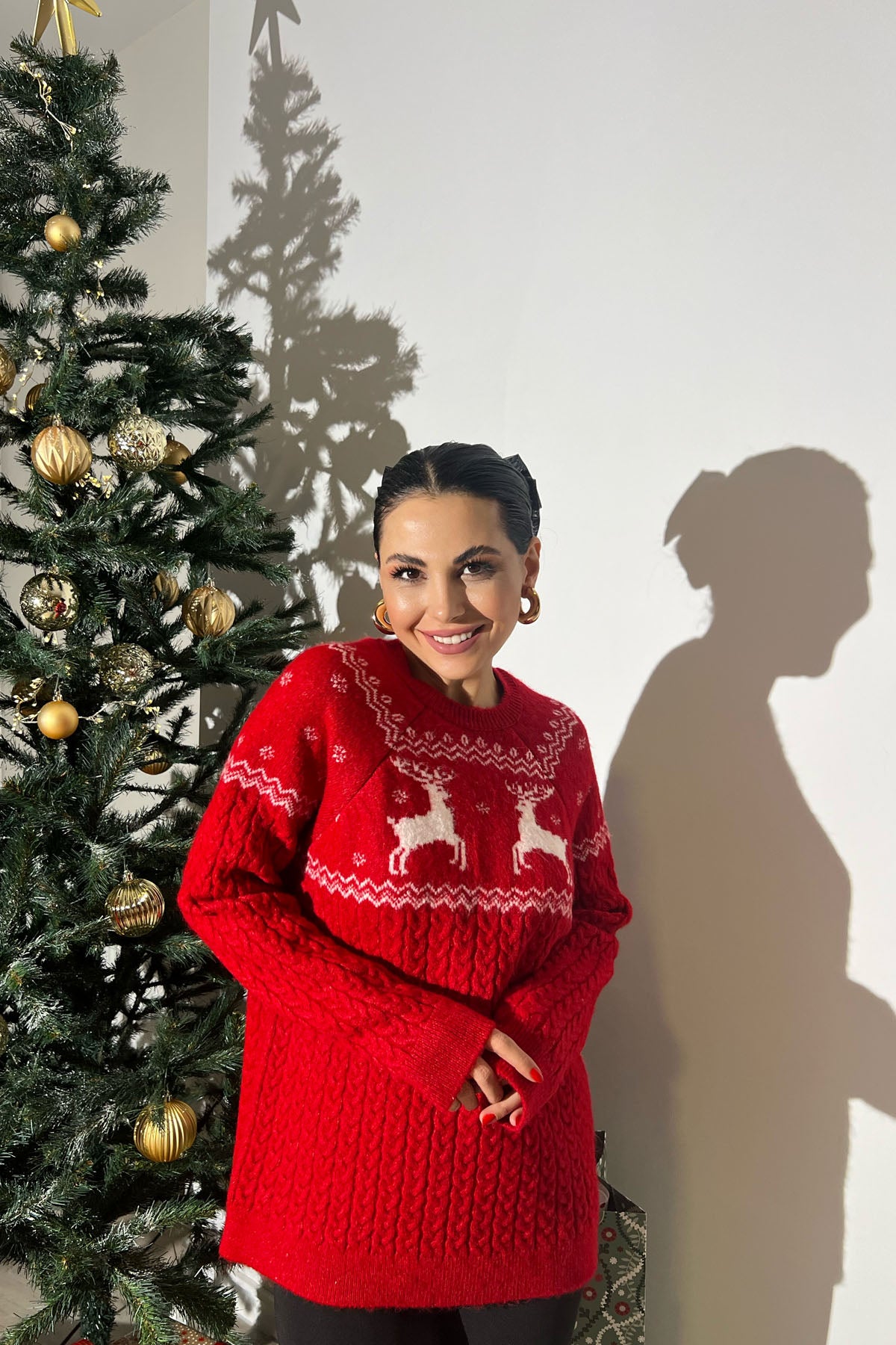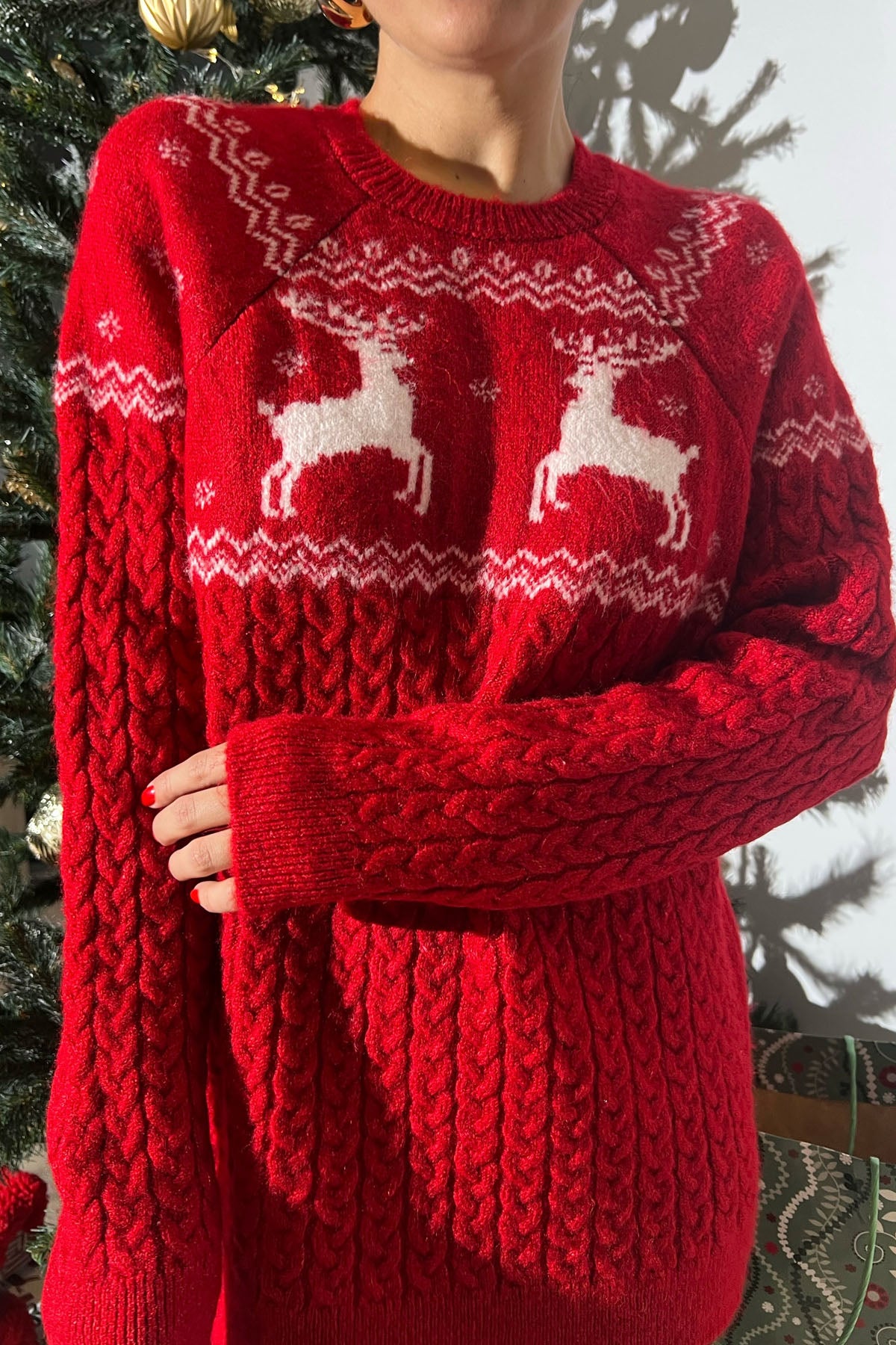 Ürün Detayları ;Bisiklet yaka, geyik desenli, özrgü detaylı triko kazak