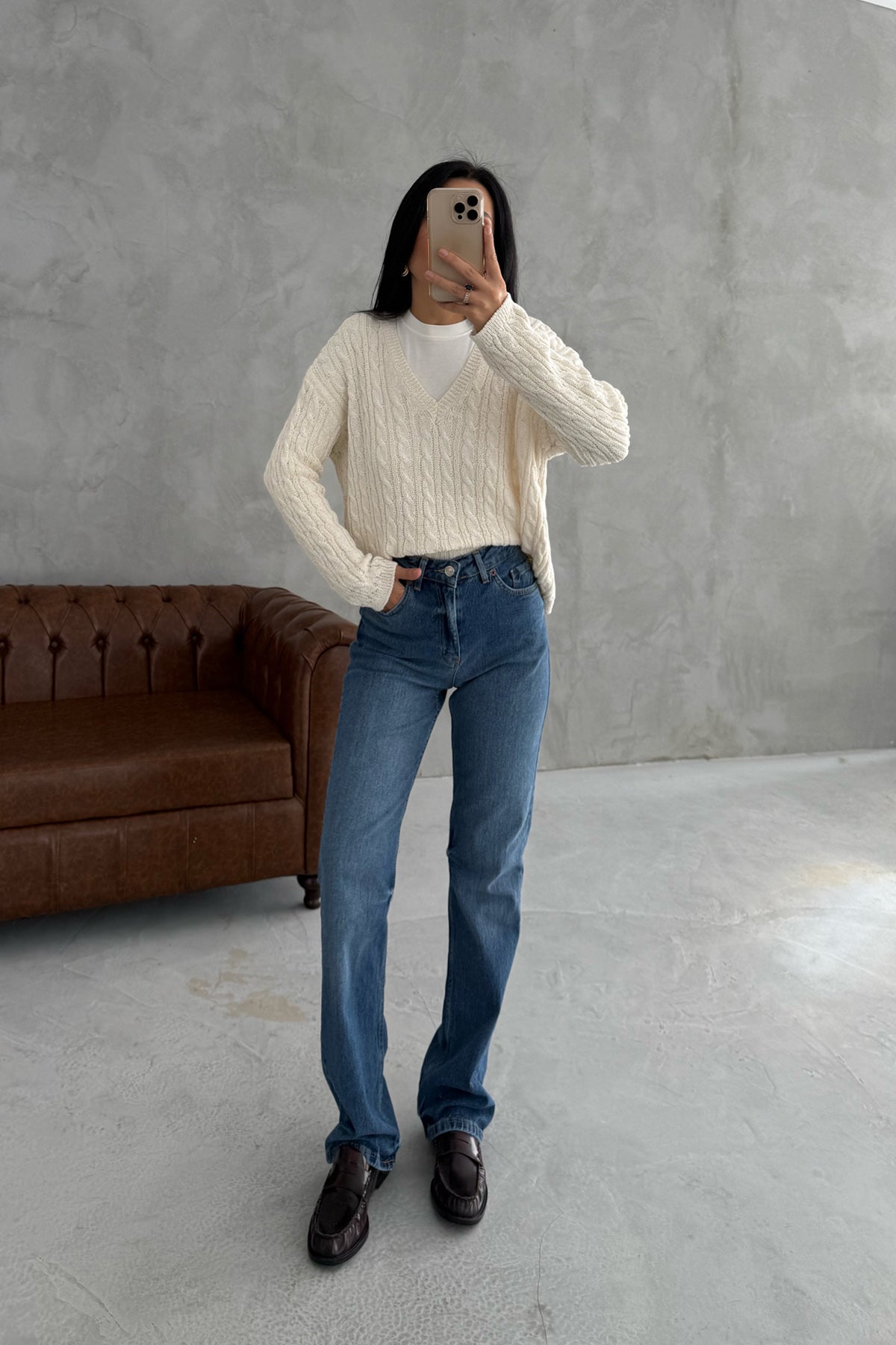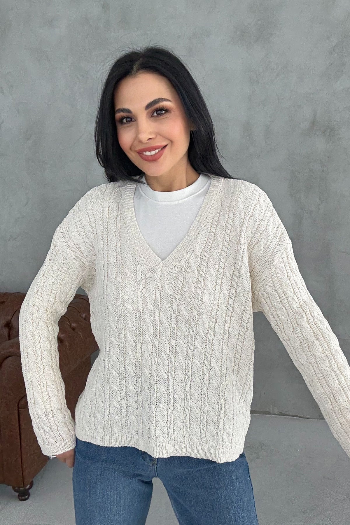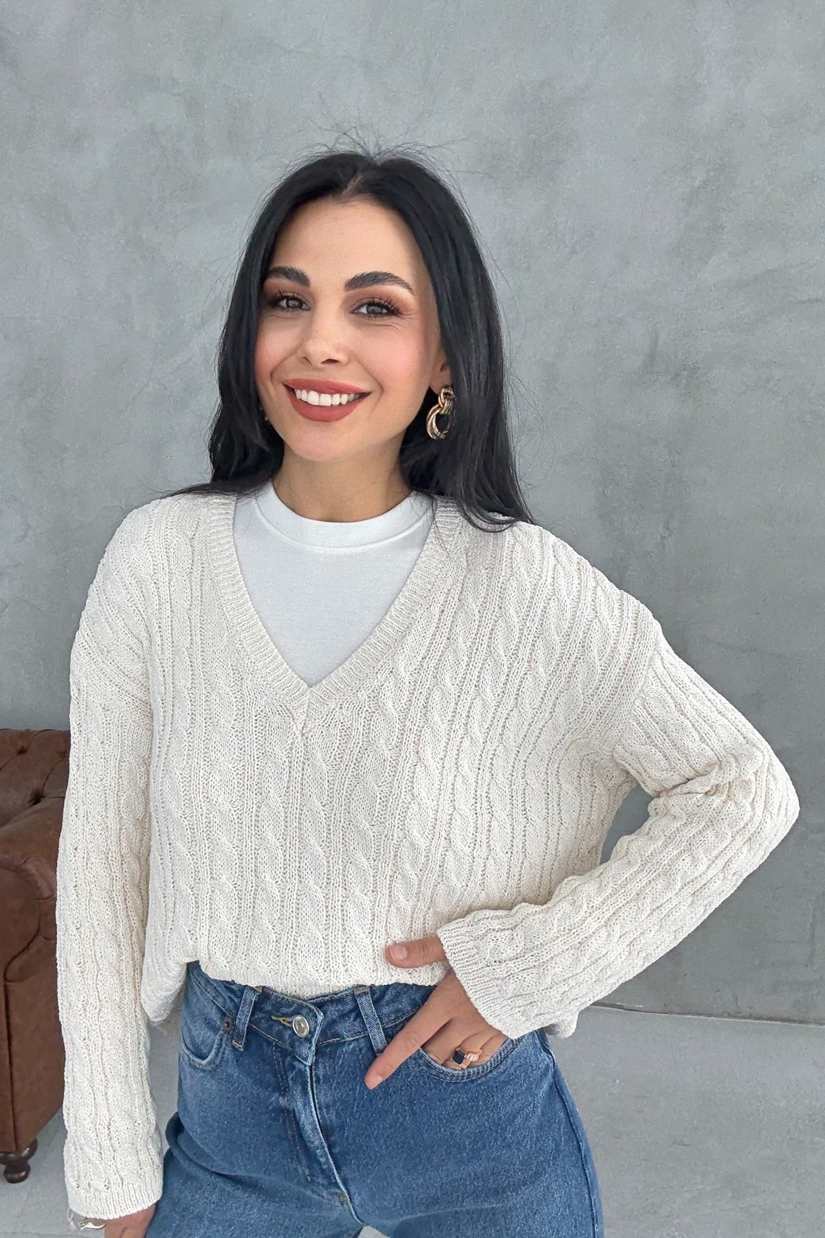 V Yaka Saç Örgü Krem Triko Kazak SY-3407-Krem