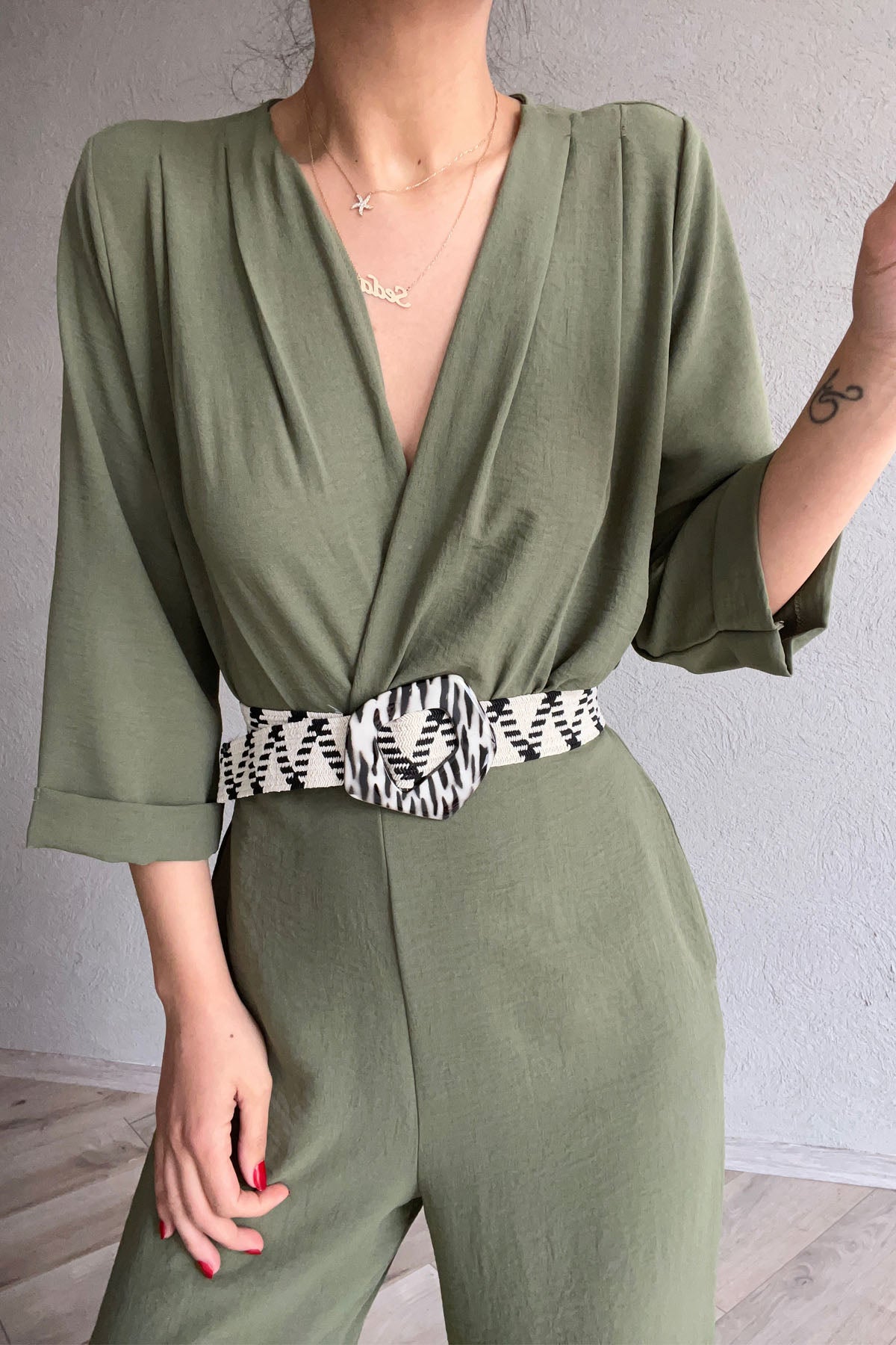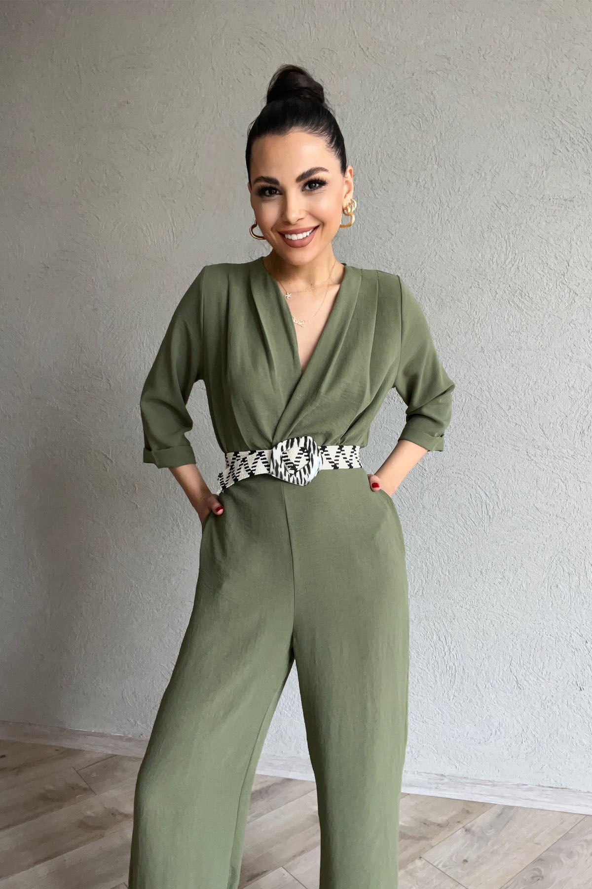 Haki Kemeri Desenli Kruvaze Yaka Tulum SY-0454-Haki