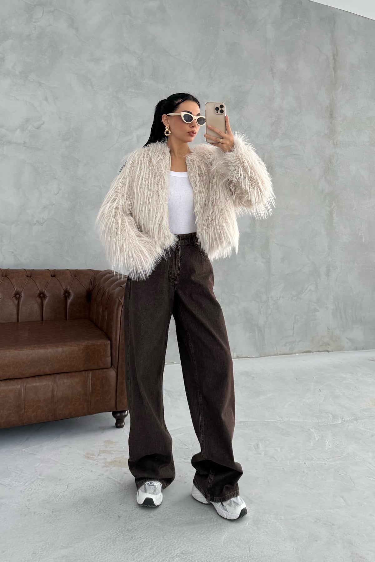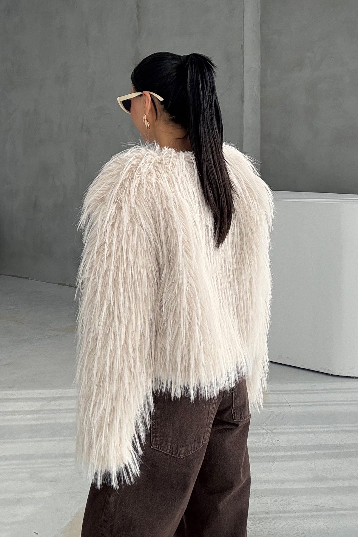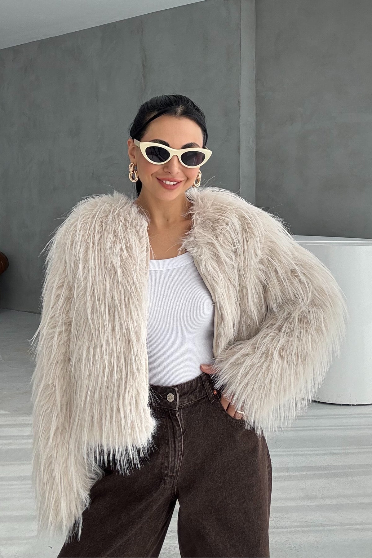 Ürün Detayları ; Ekru Saçaklı Kürk Ceket