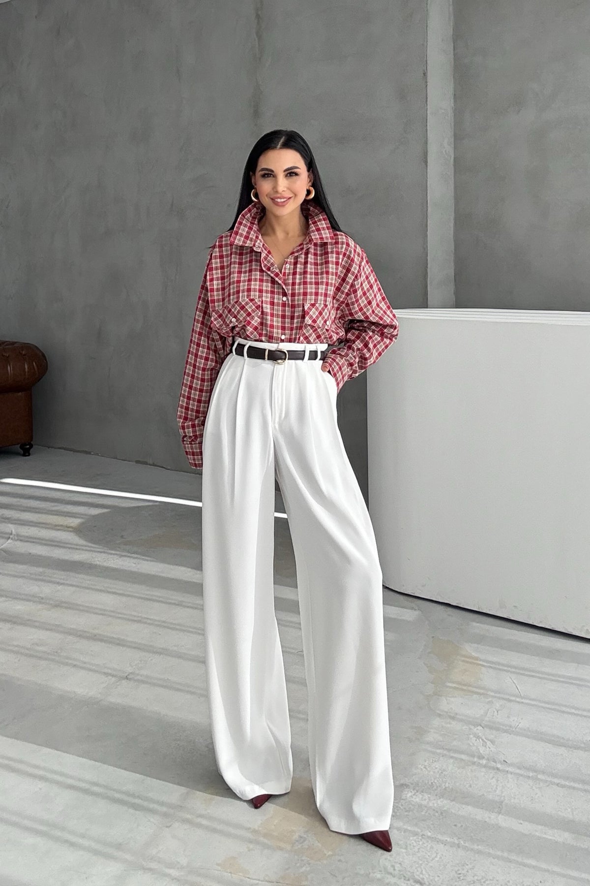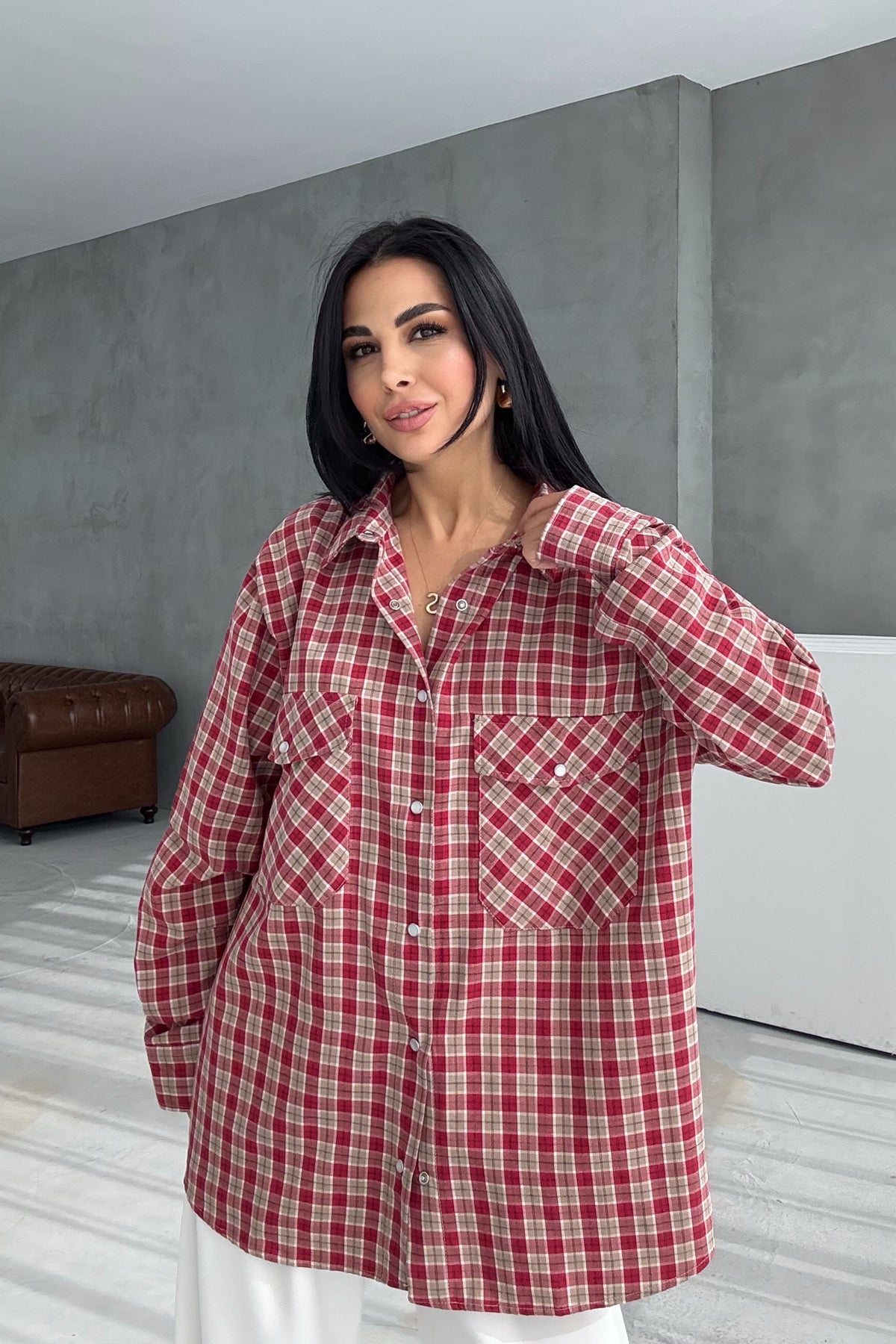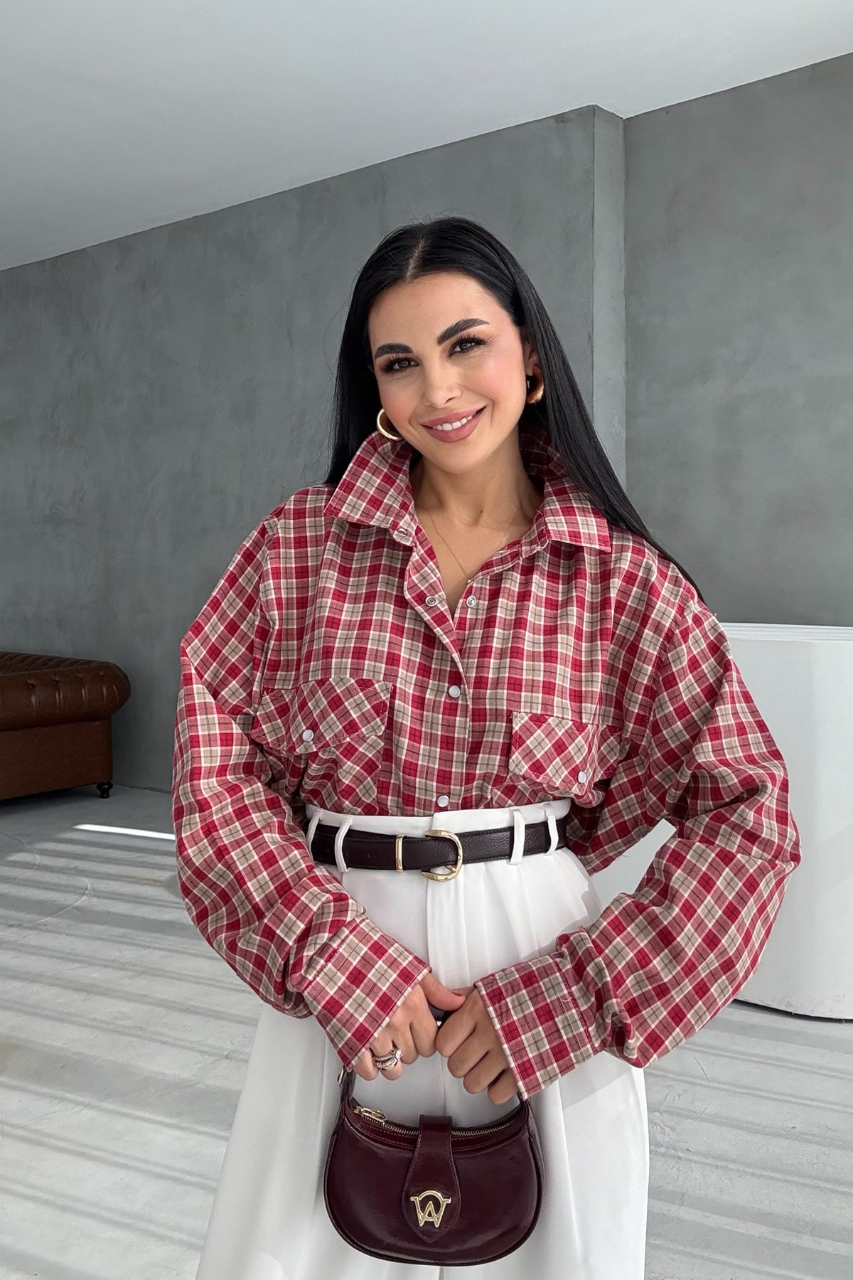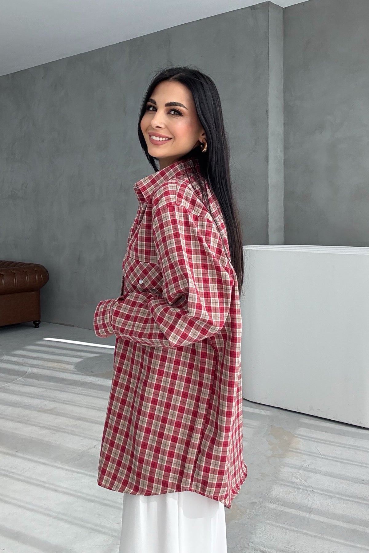 Ürün Detayları: Kadın Kırmızı Ekoseli Cepli Uzun Kollu Gömlek