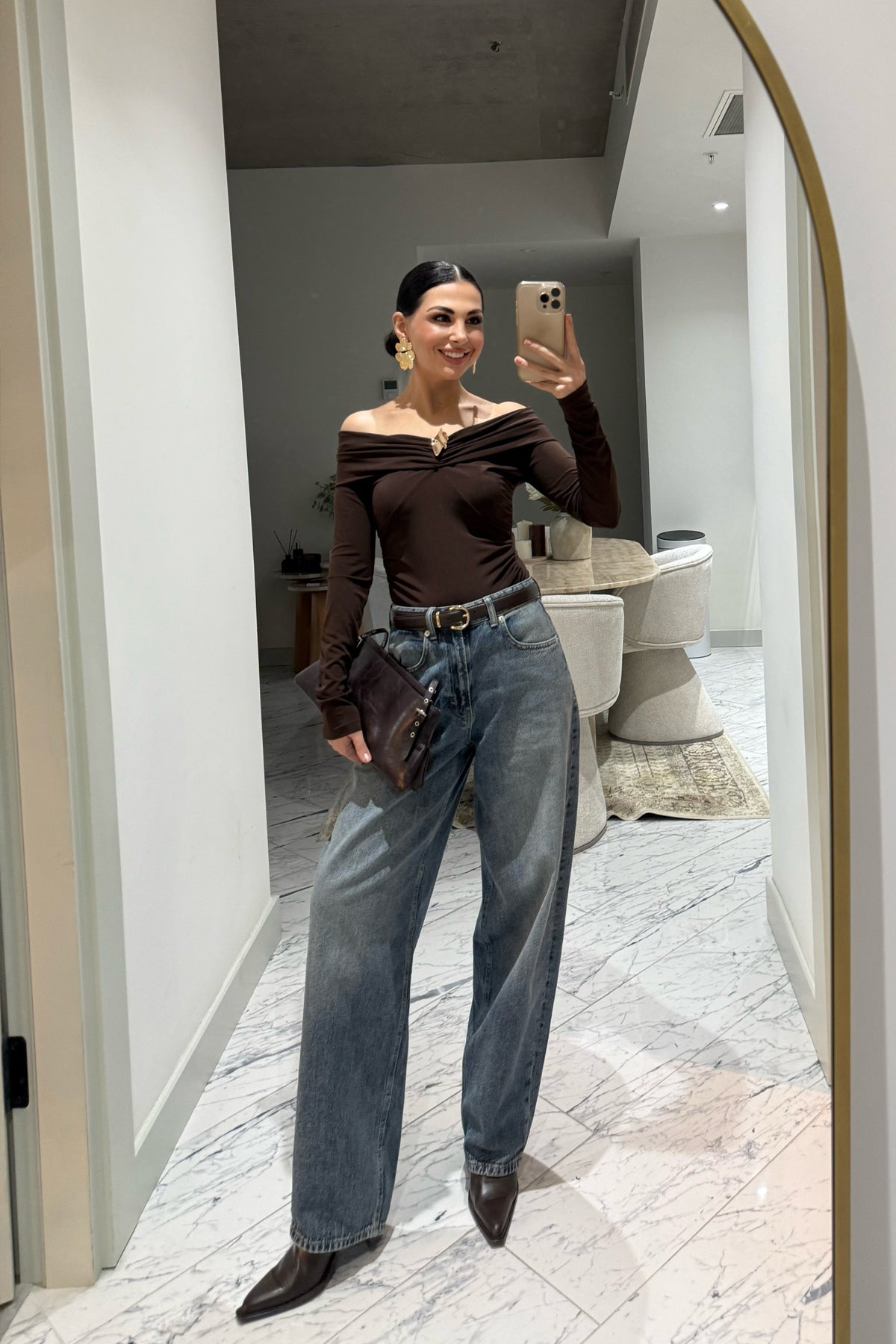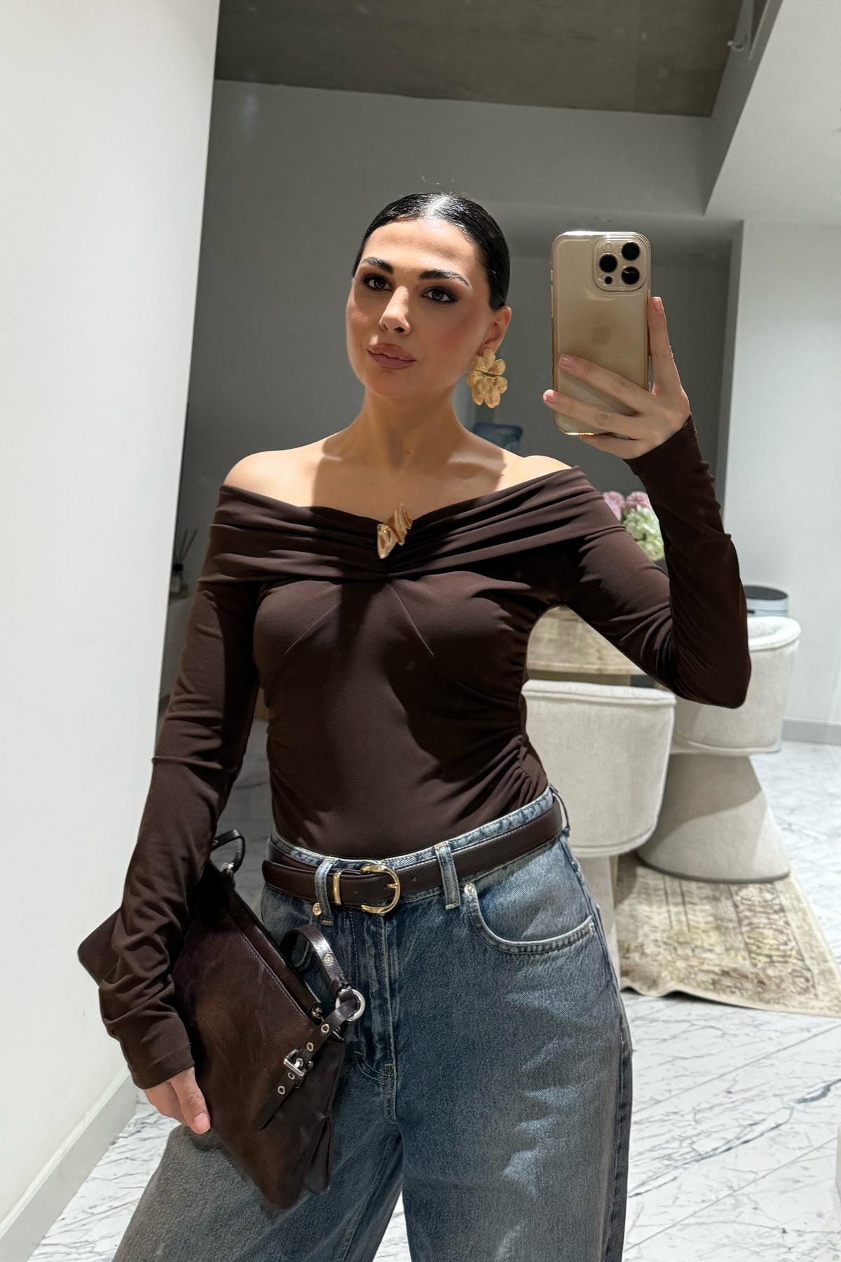 Ürün Detayları:Kahverengi Carmen Yaka Broş Detaylı Bluz