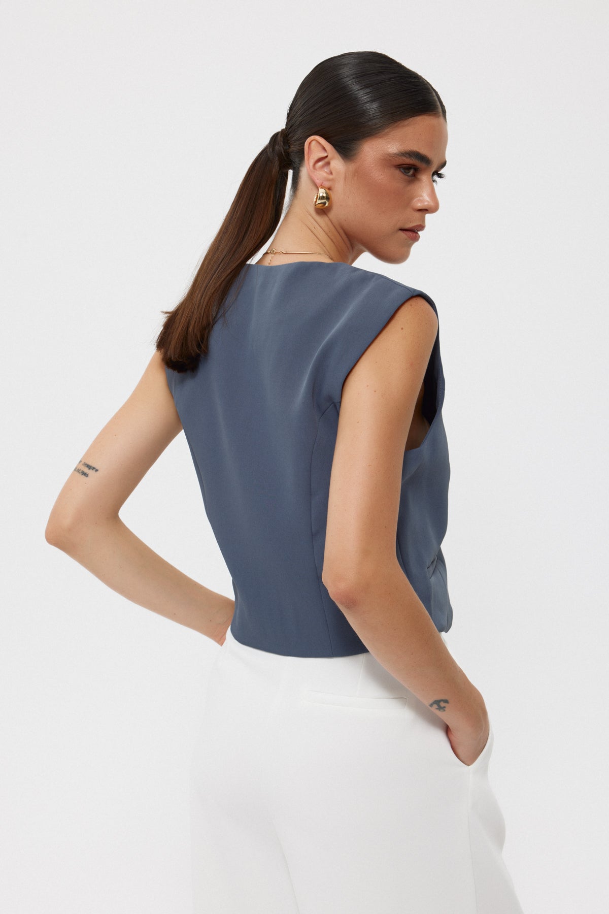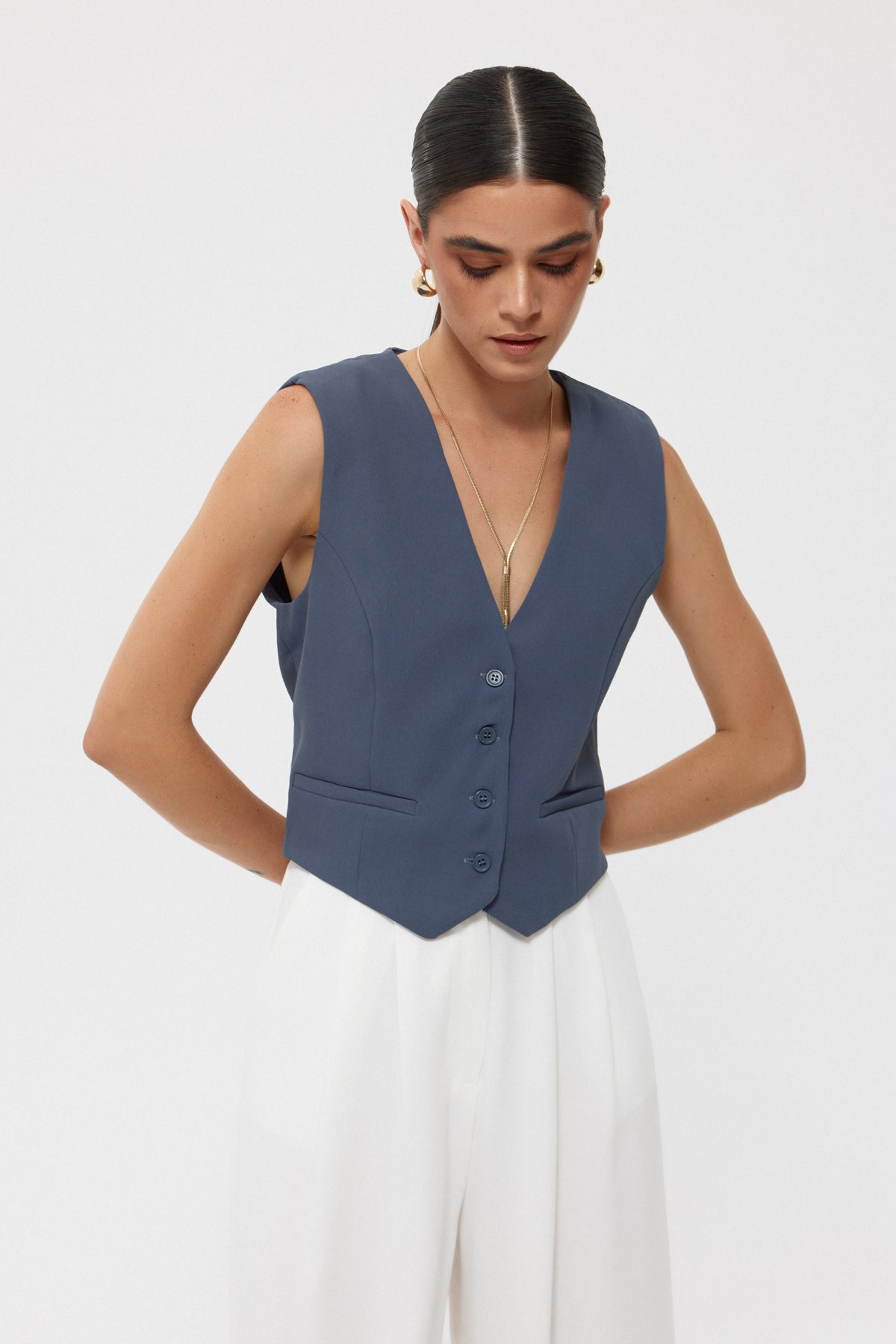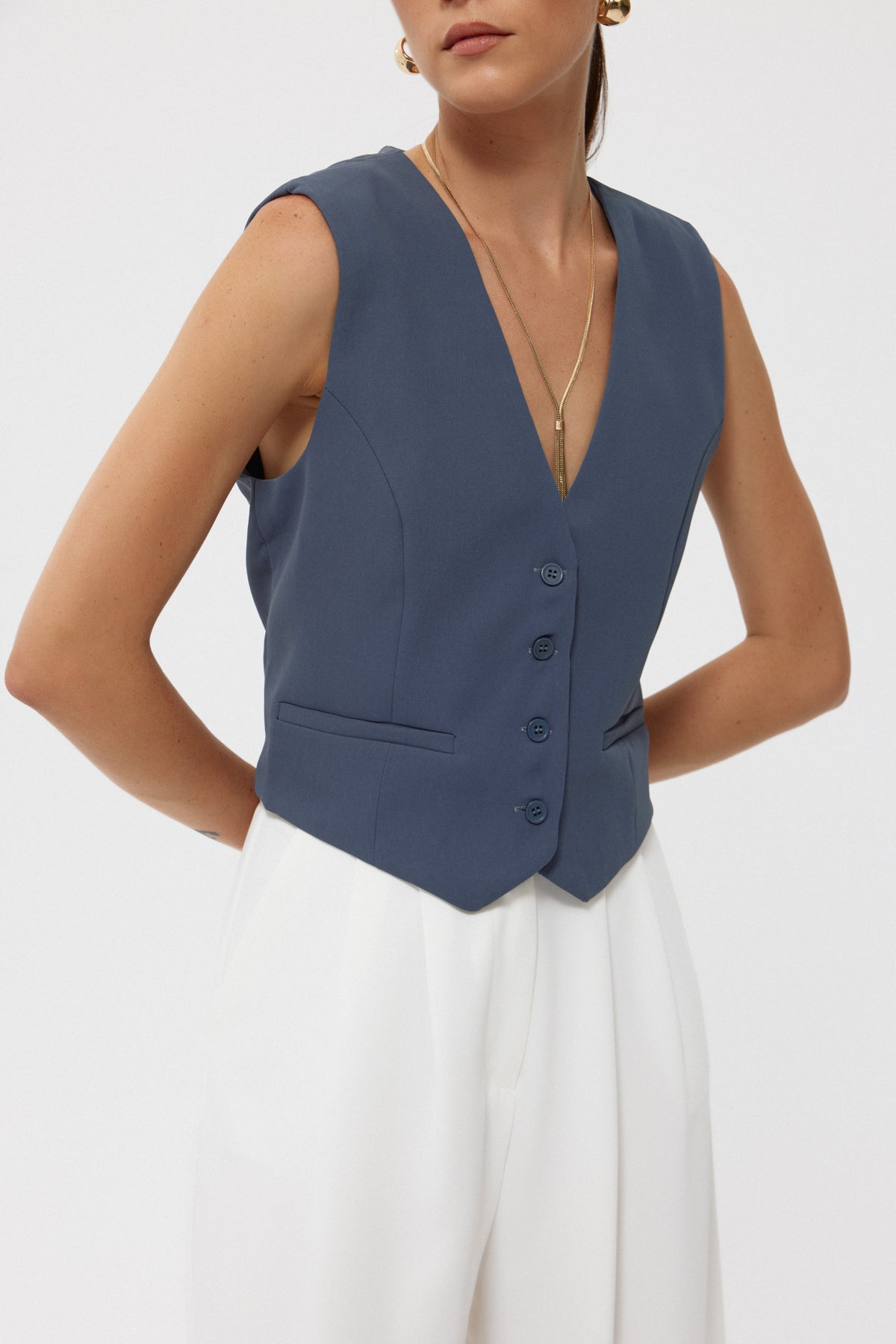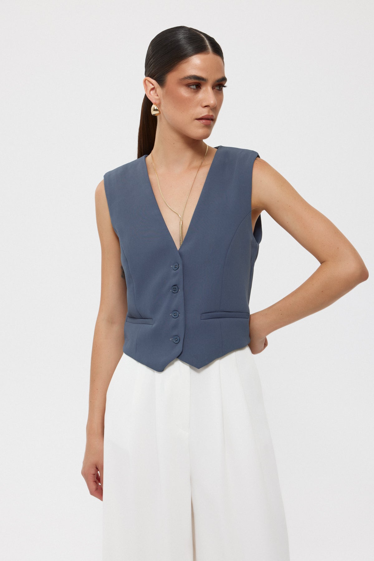 Ürün Detayları ;Kolsuz, V yaka yelek. Önü biyeli yalancı cepli.