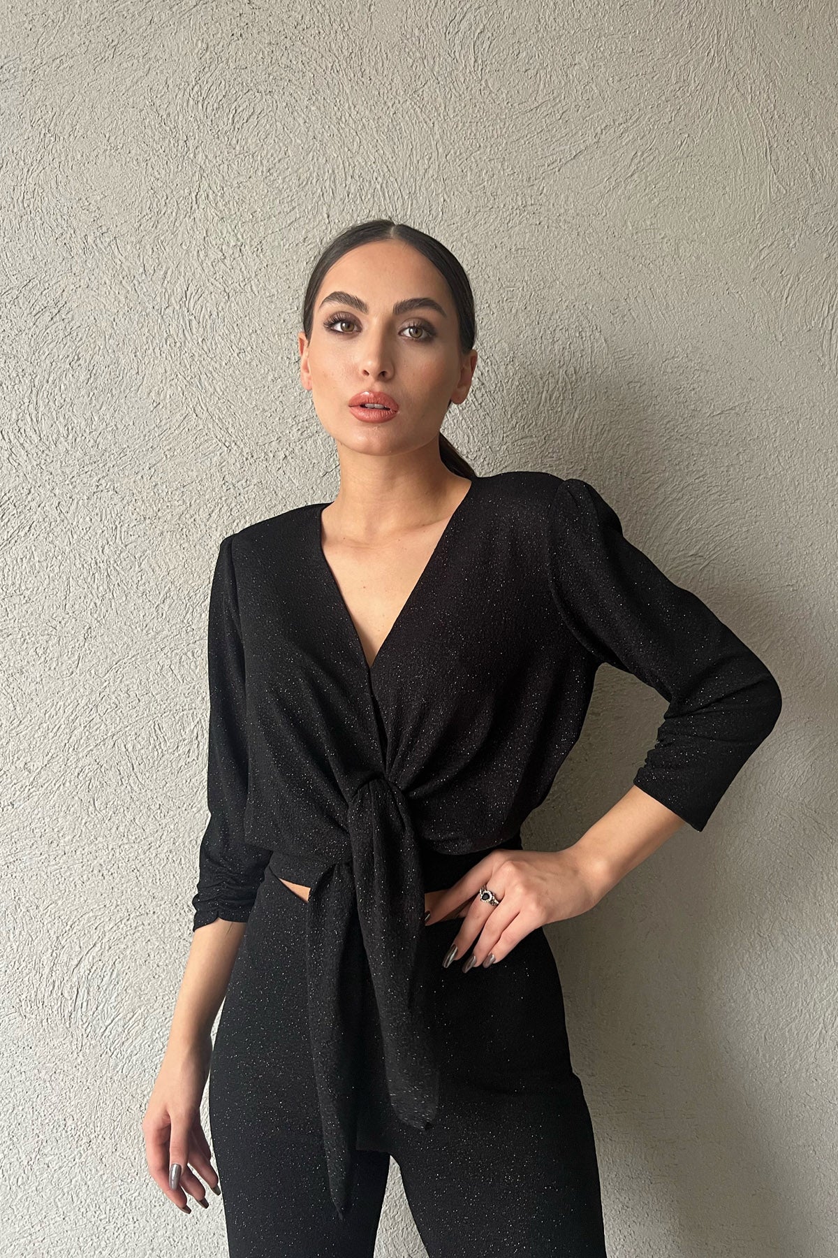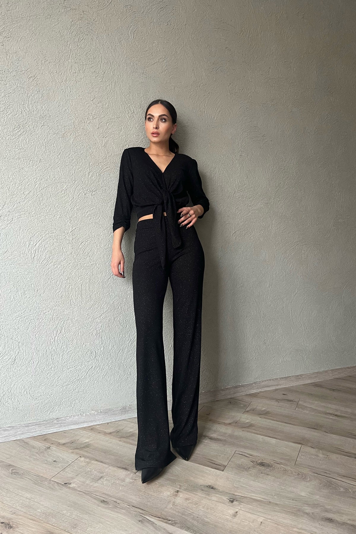 Siyah Simli Crop Bluz ve Pantolon Takım SY-1498-Siyah