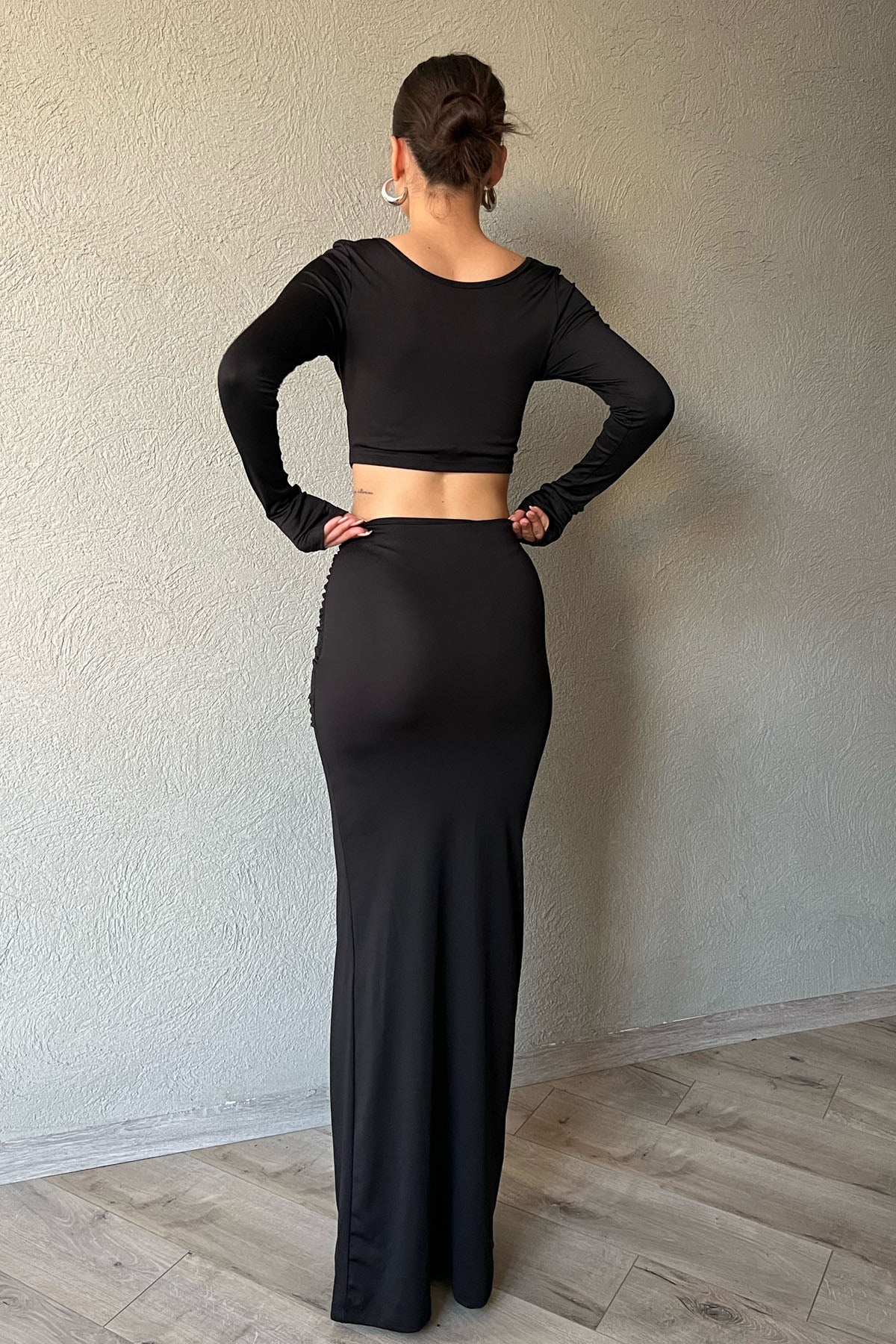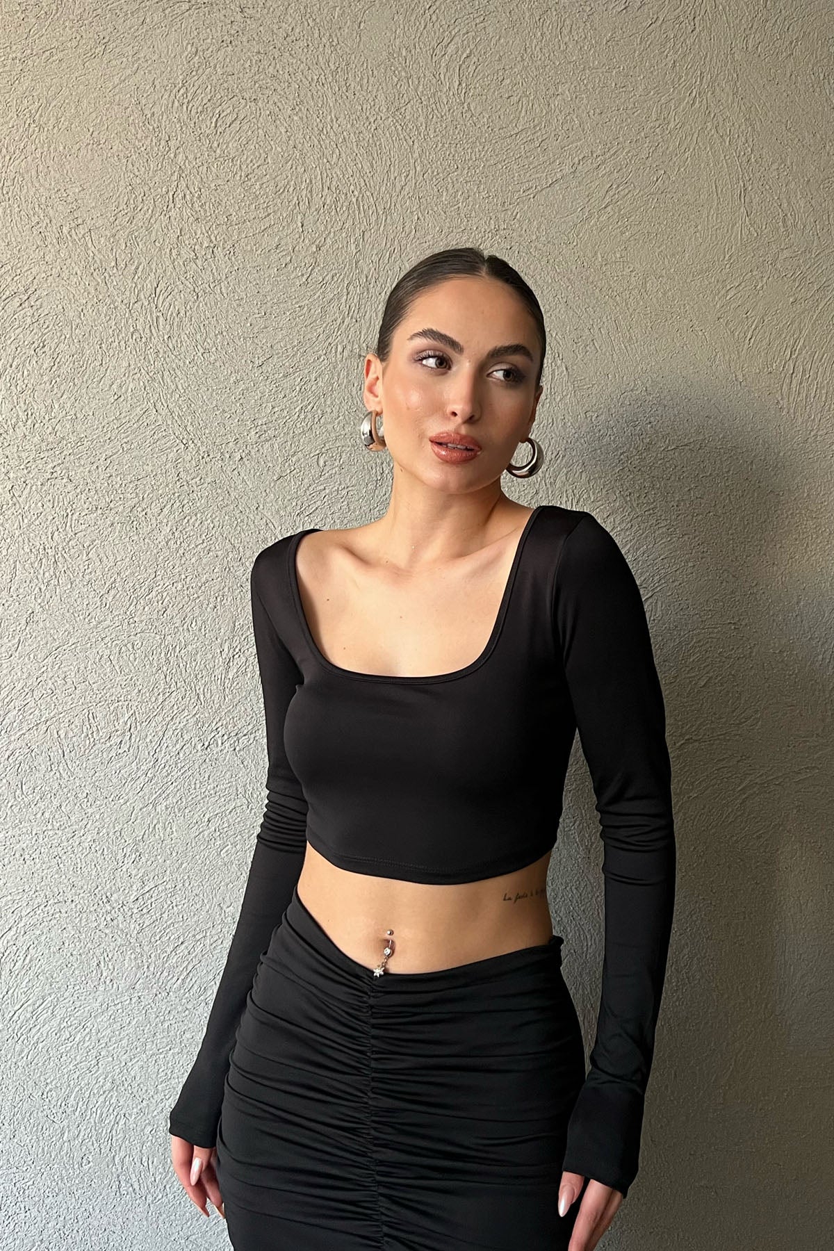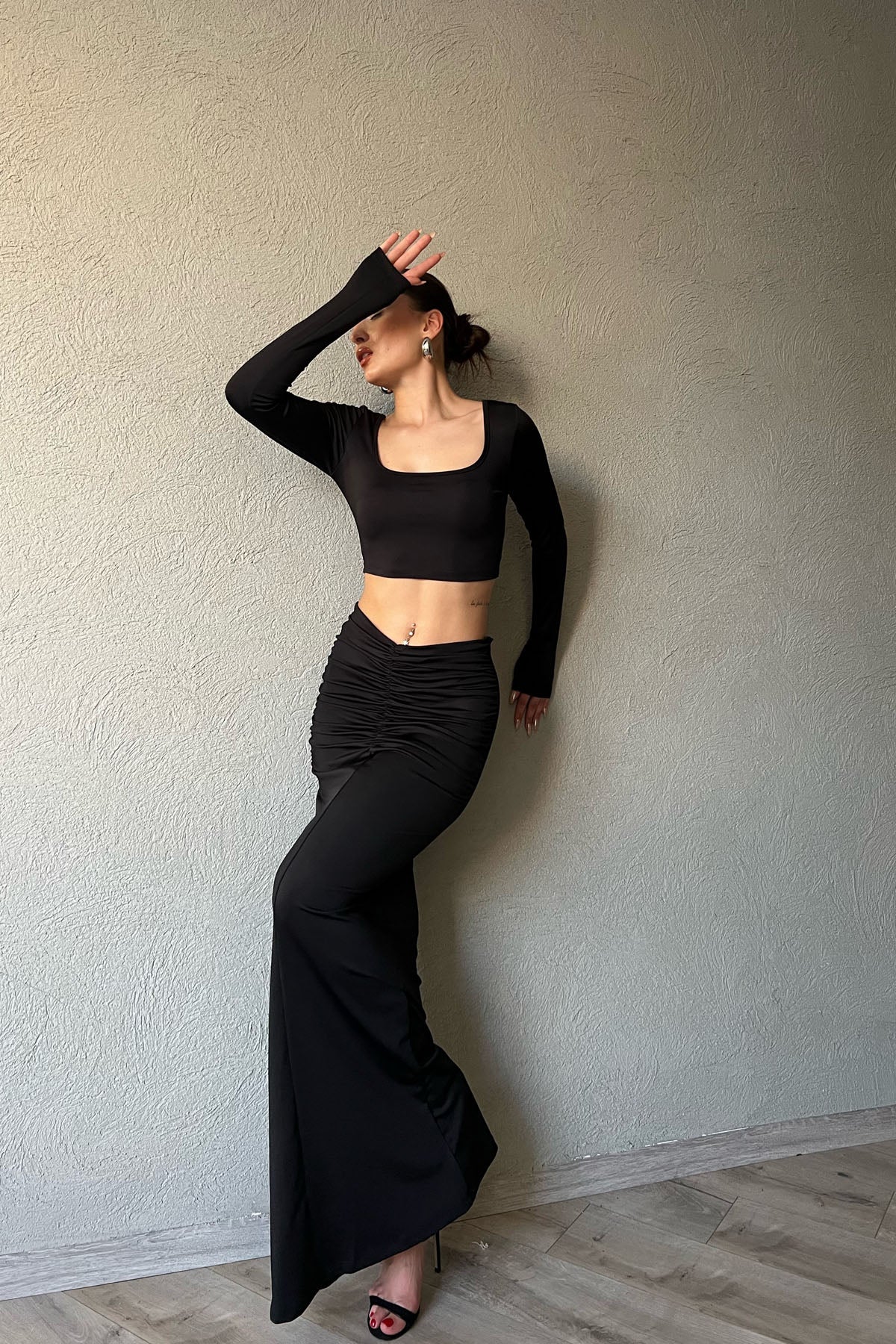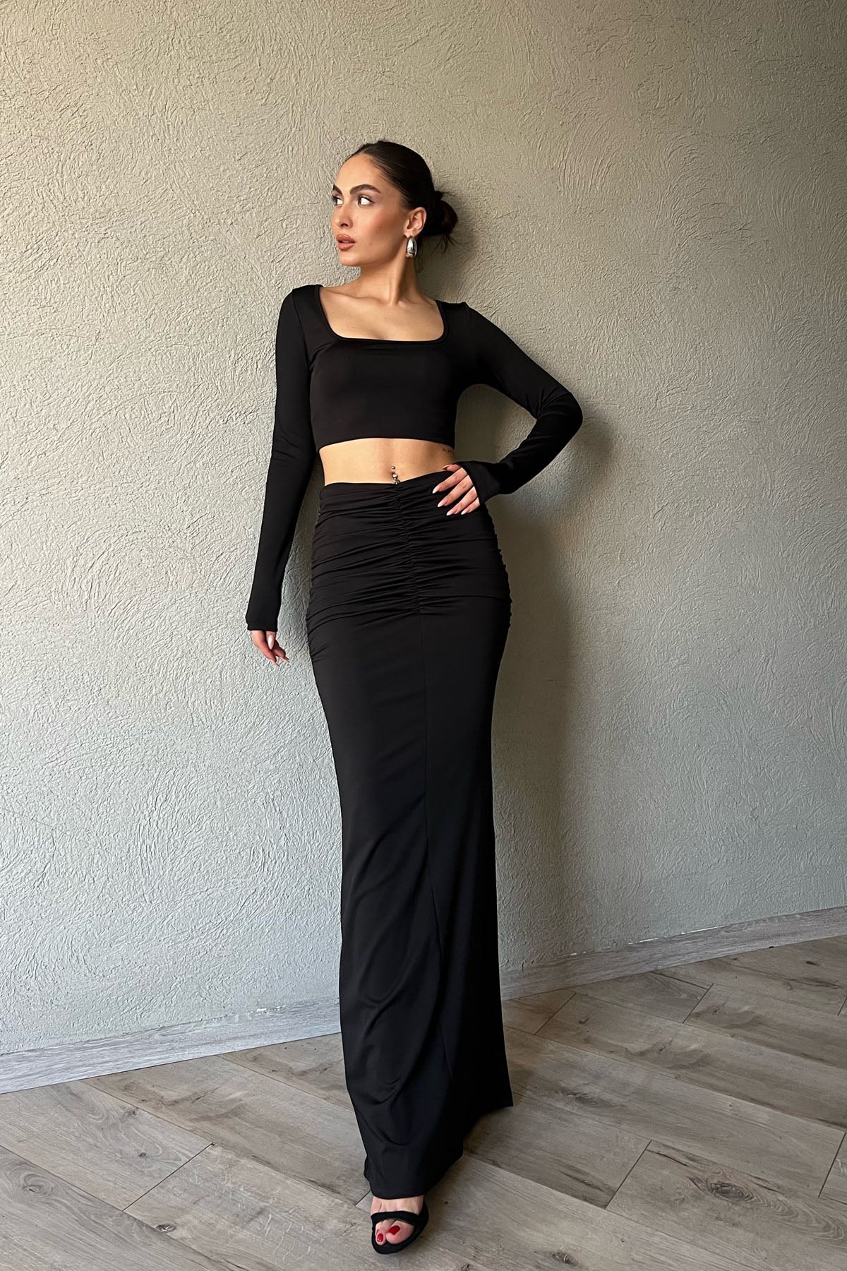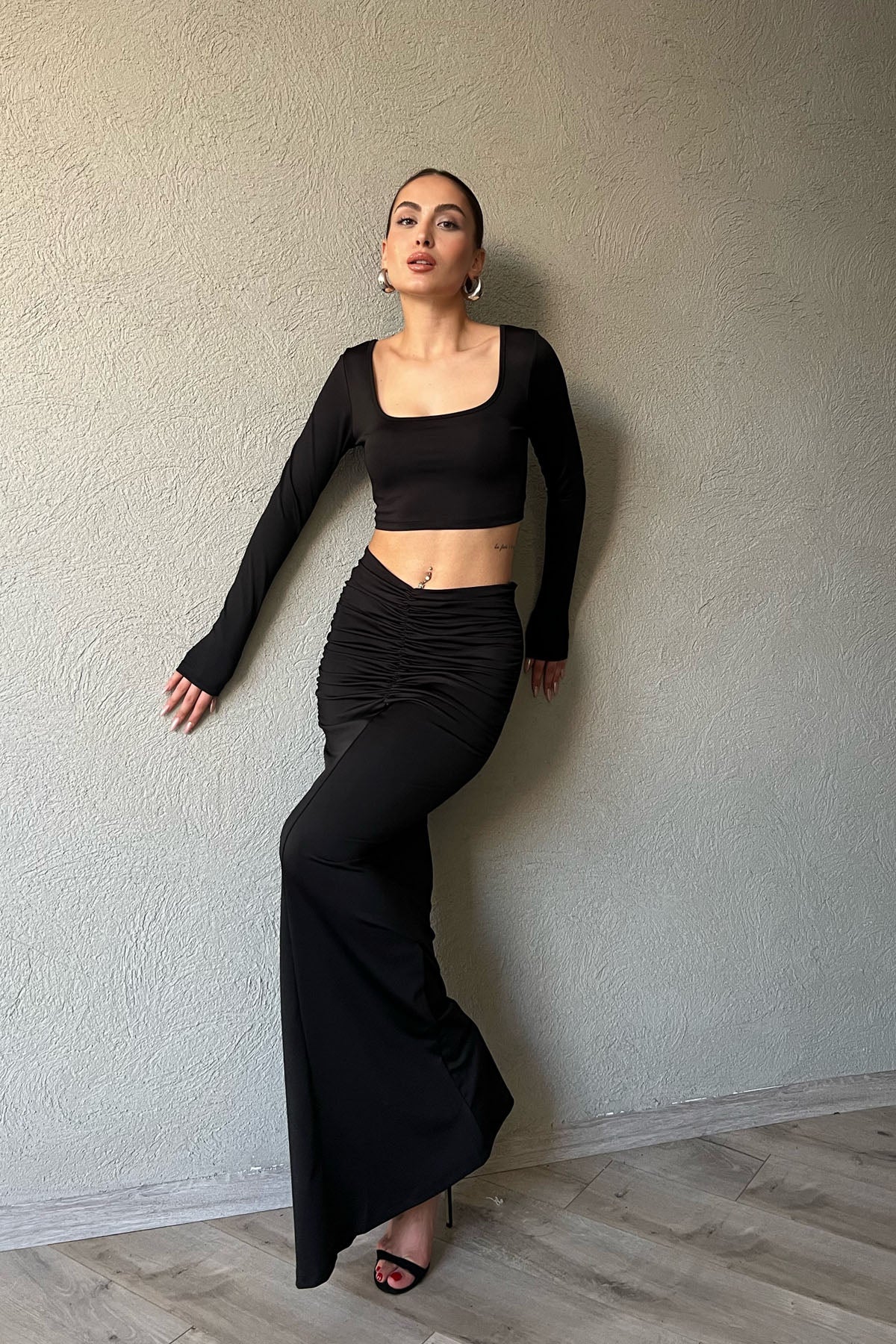 Siyah Uzun Kollu Kare Yaka Crop ve Büzgülü Etek Takım SY-1285-Siyah