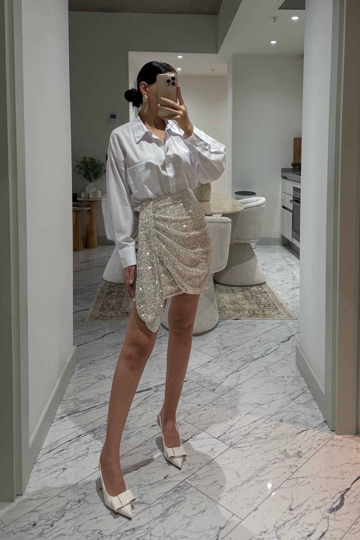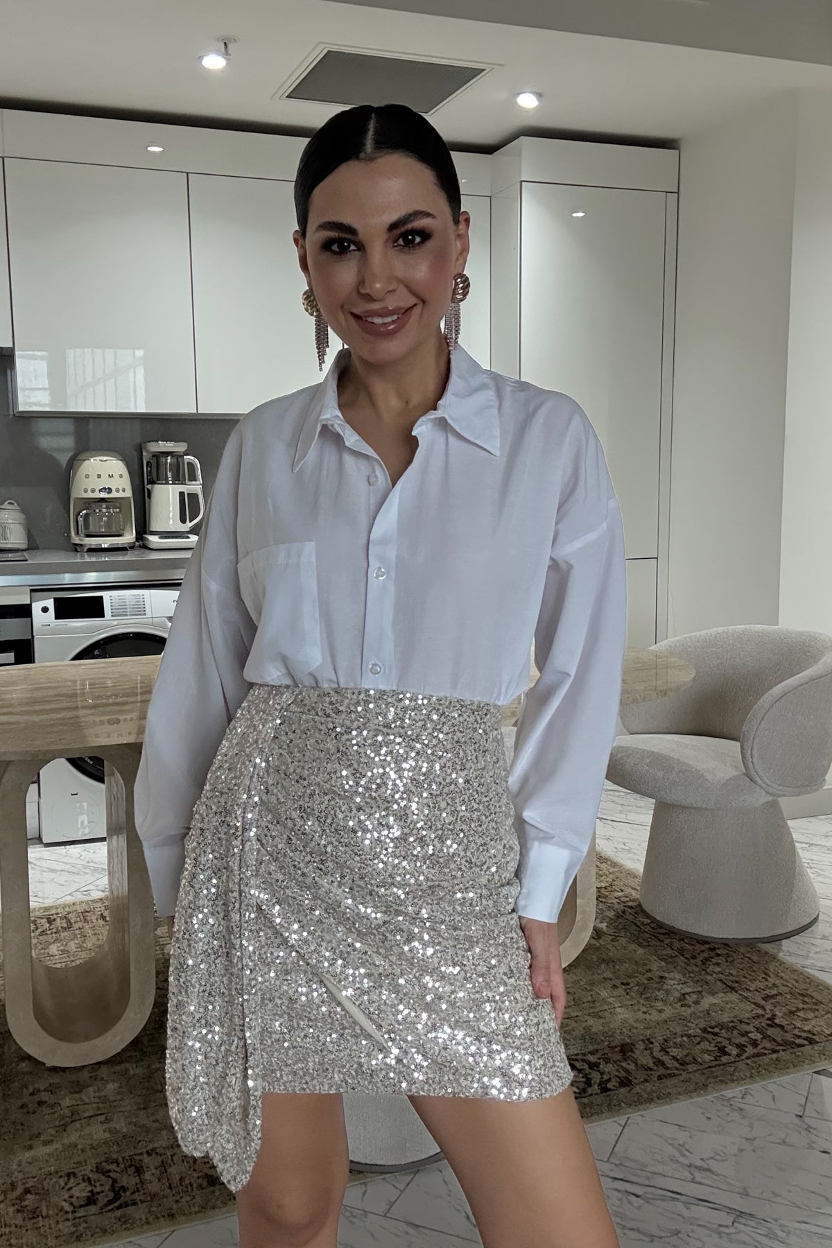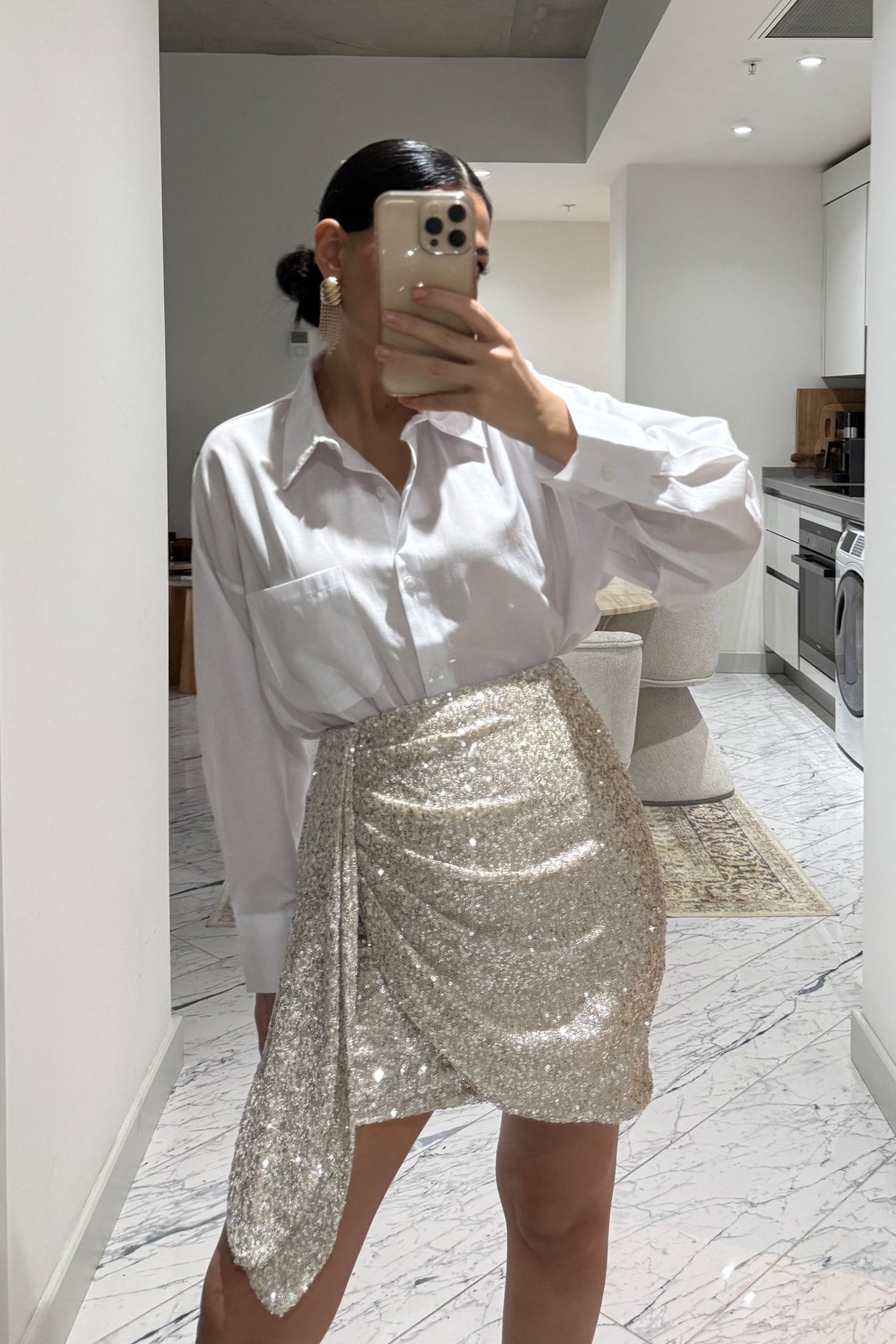 Ürün Detayları:Bej payetli Büzgü Detaylı Tasarım Mini Etek