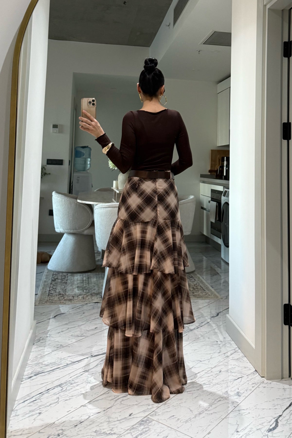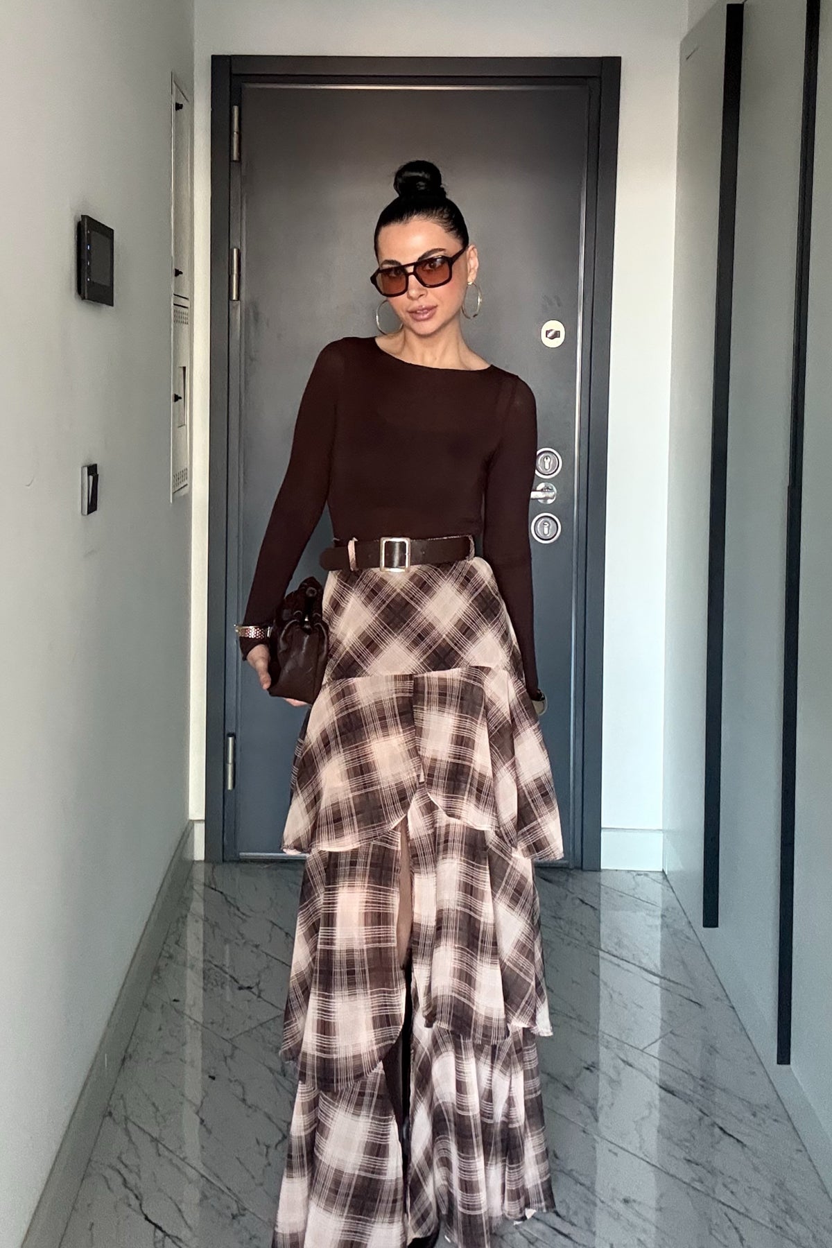 Ürün Detayları:Kahve Ekoseli Fırfırlı Kat Kat Kemerli ETek