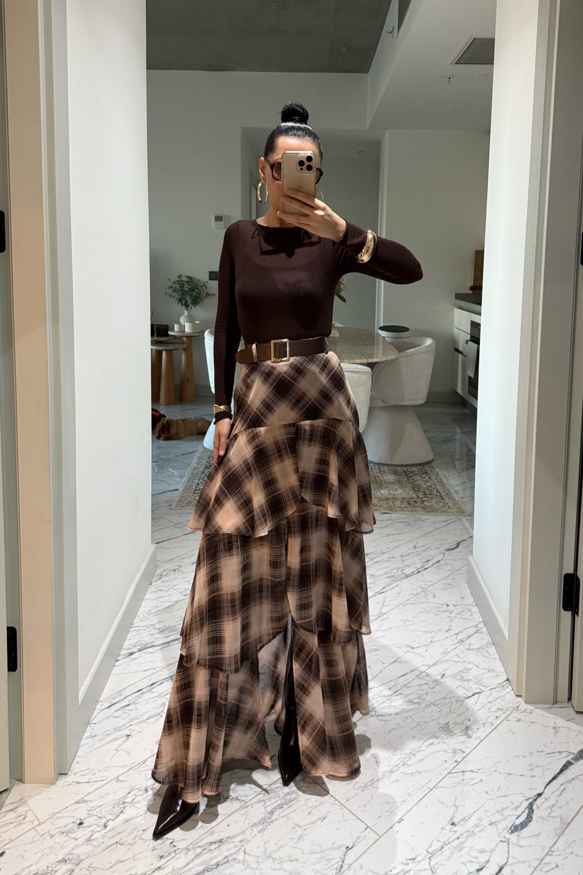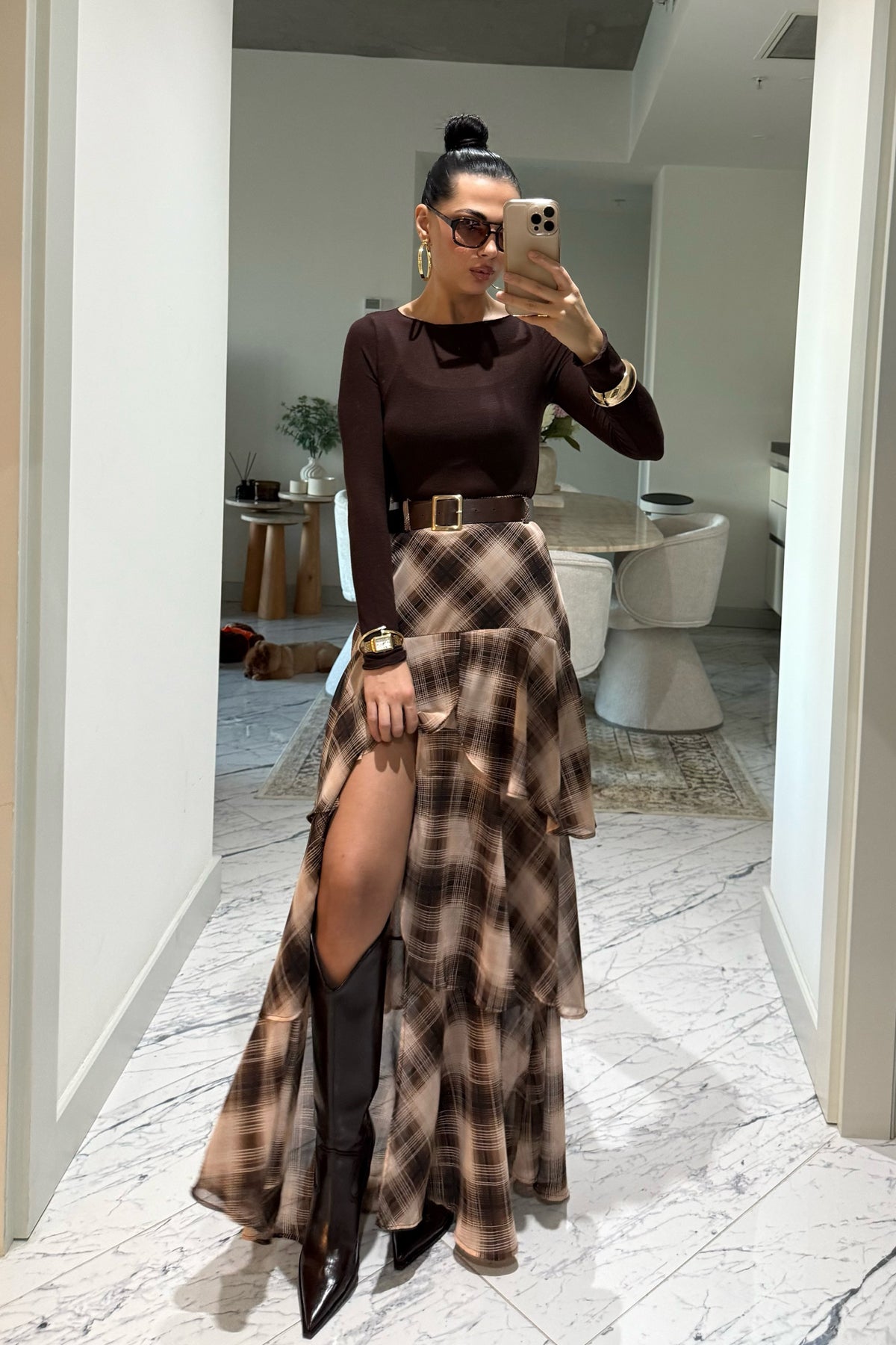 Kahve Ekoseli Fırfırlı Kat Kat Kemerli ETek SY-3525-Kahverengi