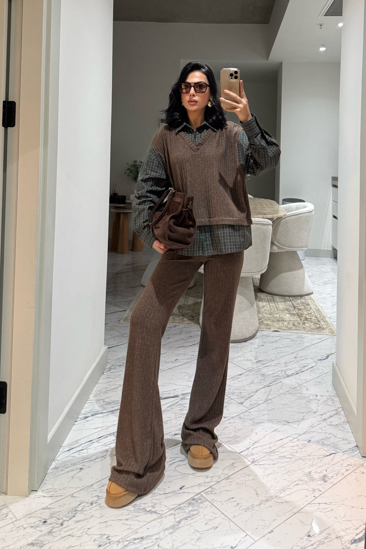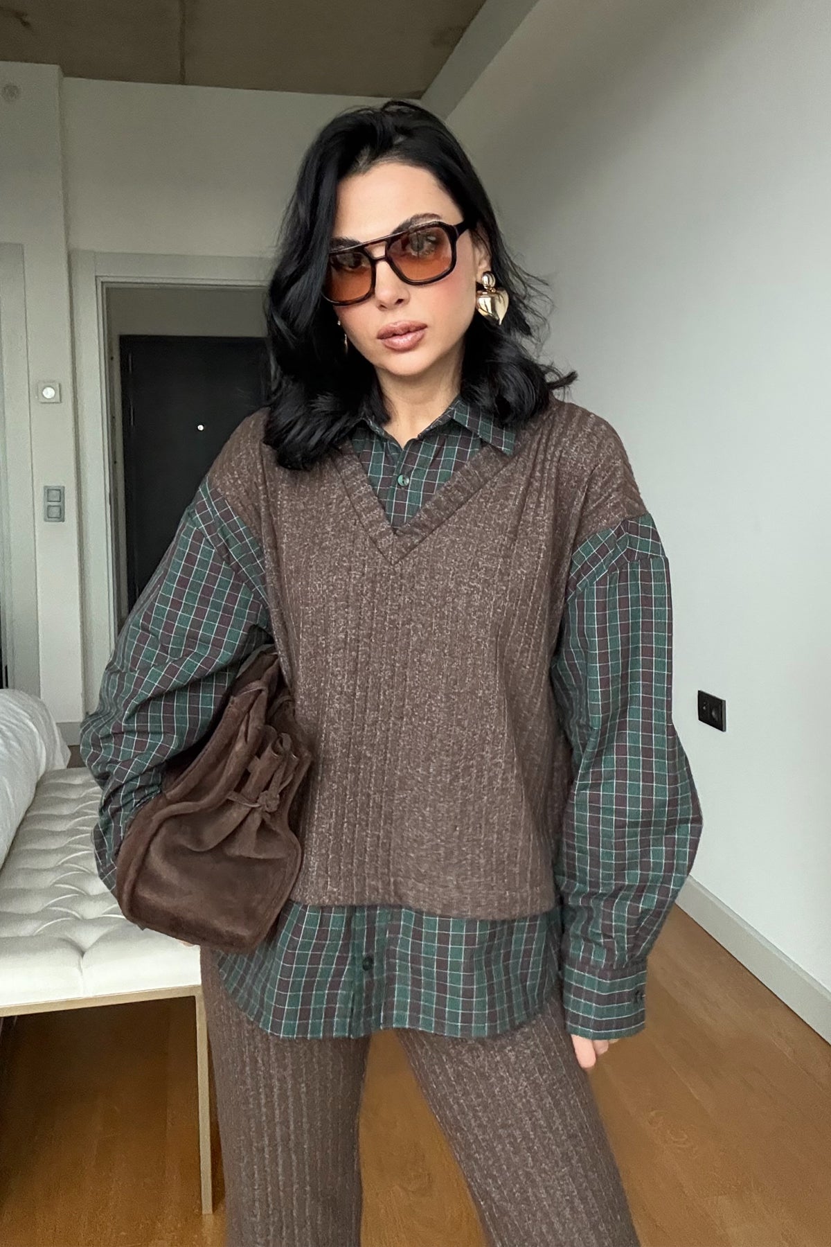 Kahve Yeşil Gömlek Detaylı Triko Pantolon Takım SY-3497-Kahverengi