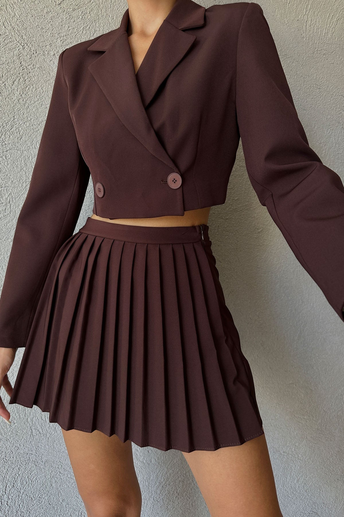 Acı Kahve Crop Ceket ve Piliseli Şort Etek Takım SY-0934-Acı Kahve