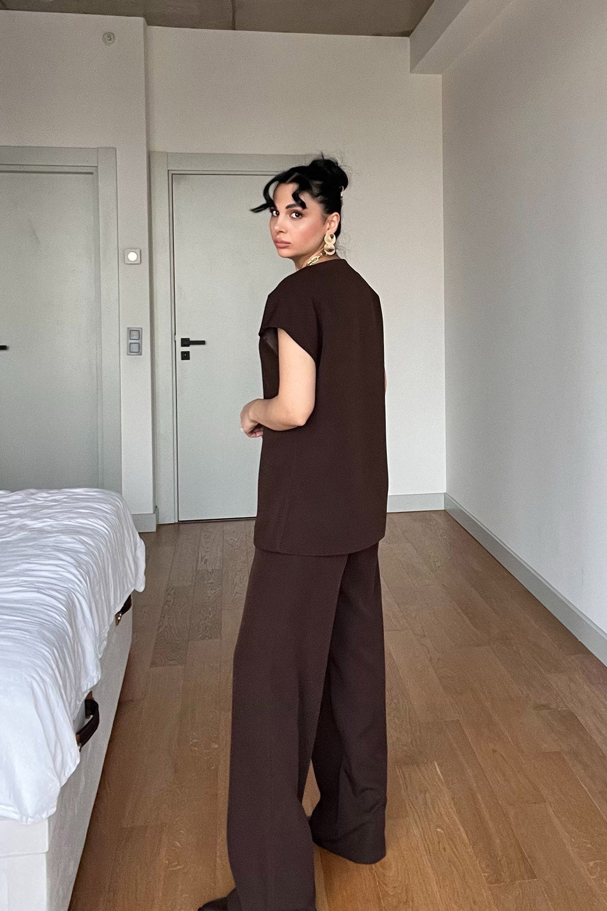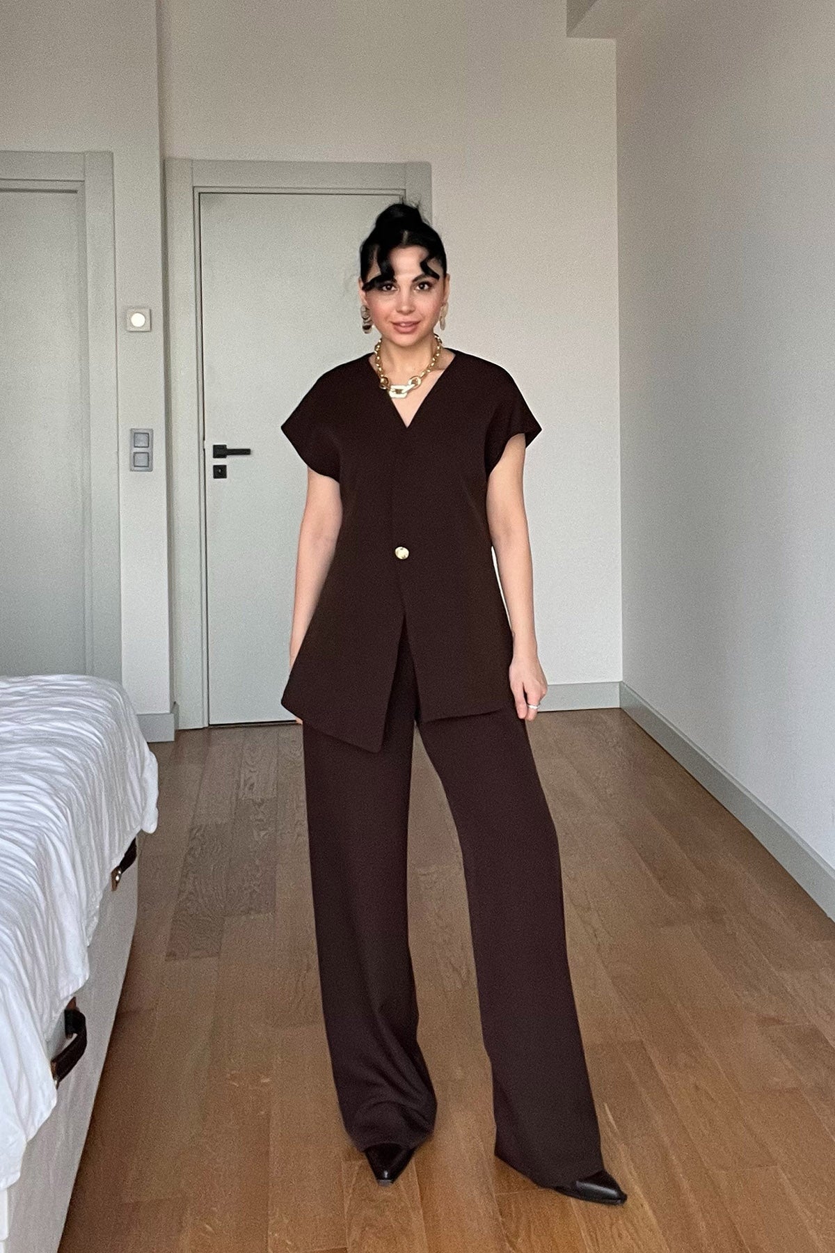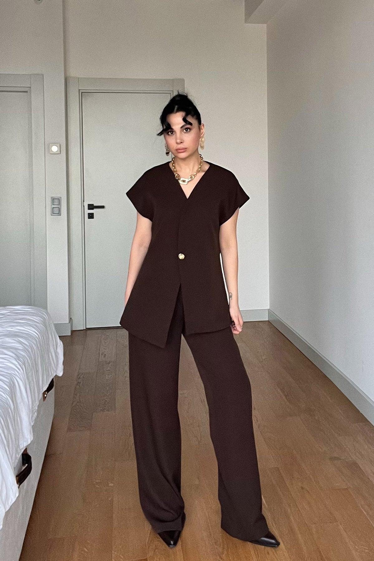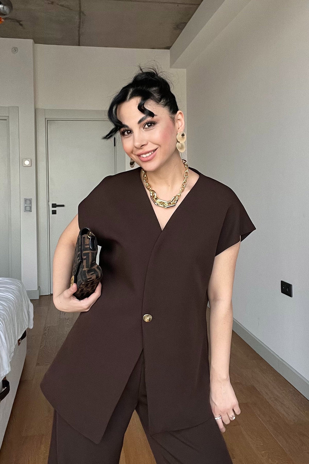 Acı Kahve Gold Düğme Detaylı Asimetrik Kesim Yelek Pantolon Takım SY-3004-Kahve