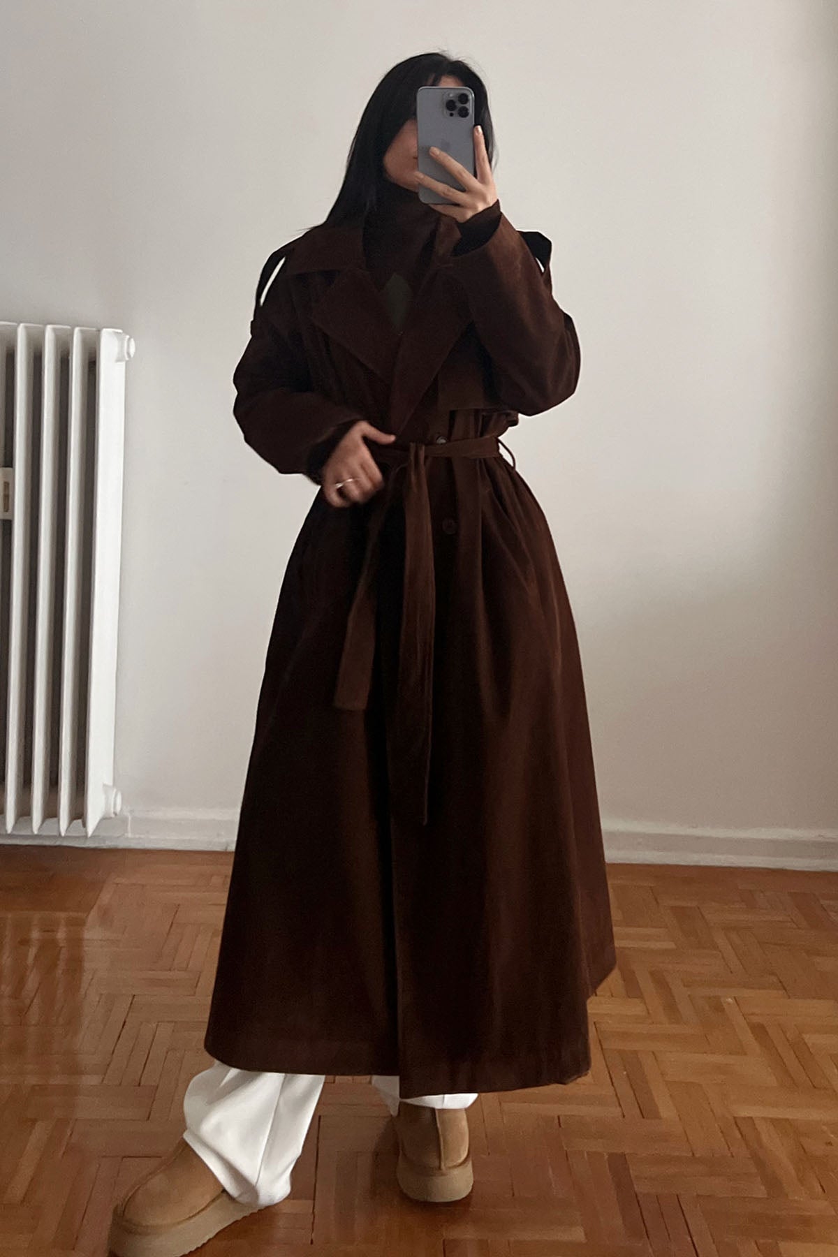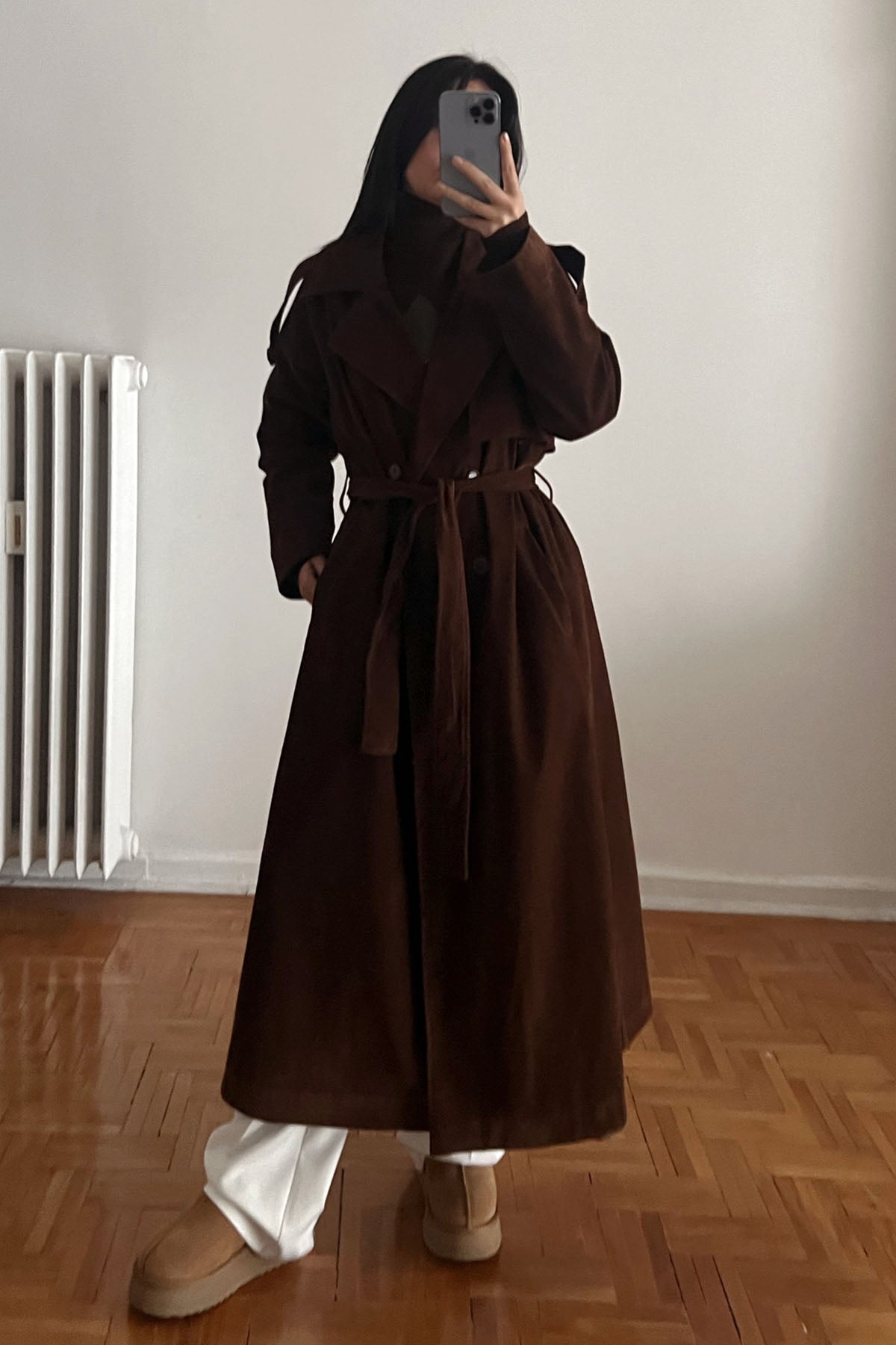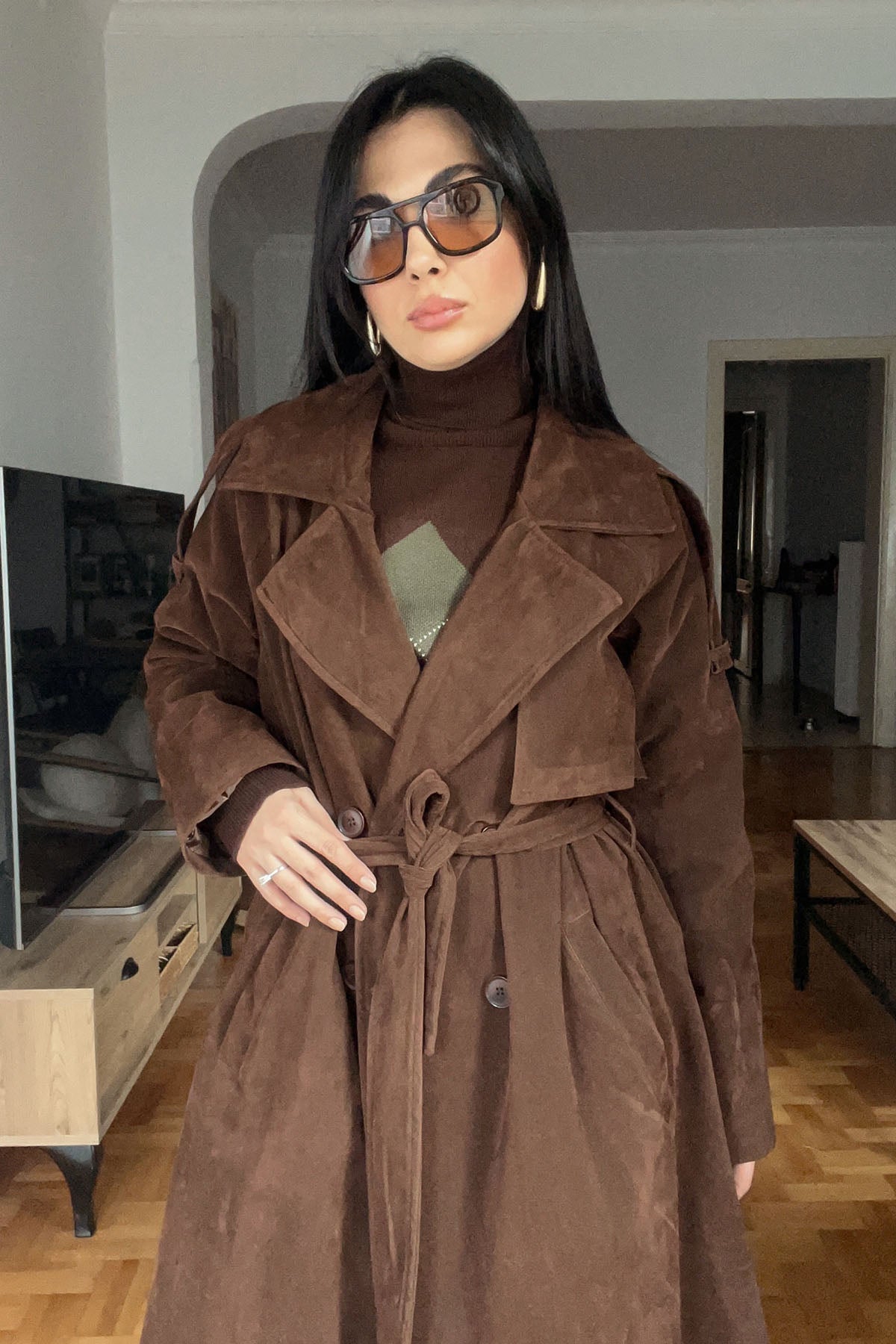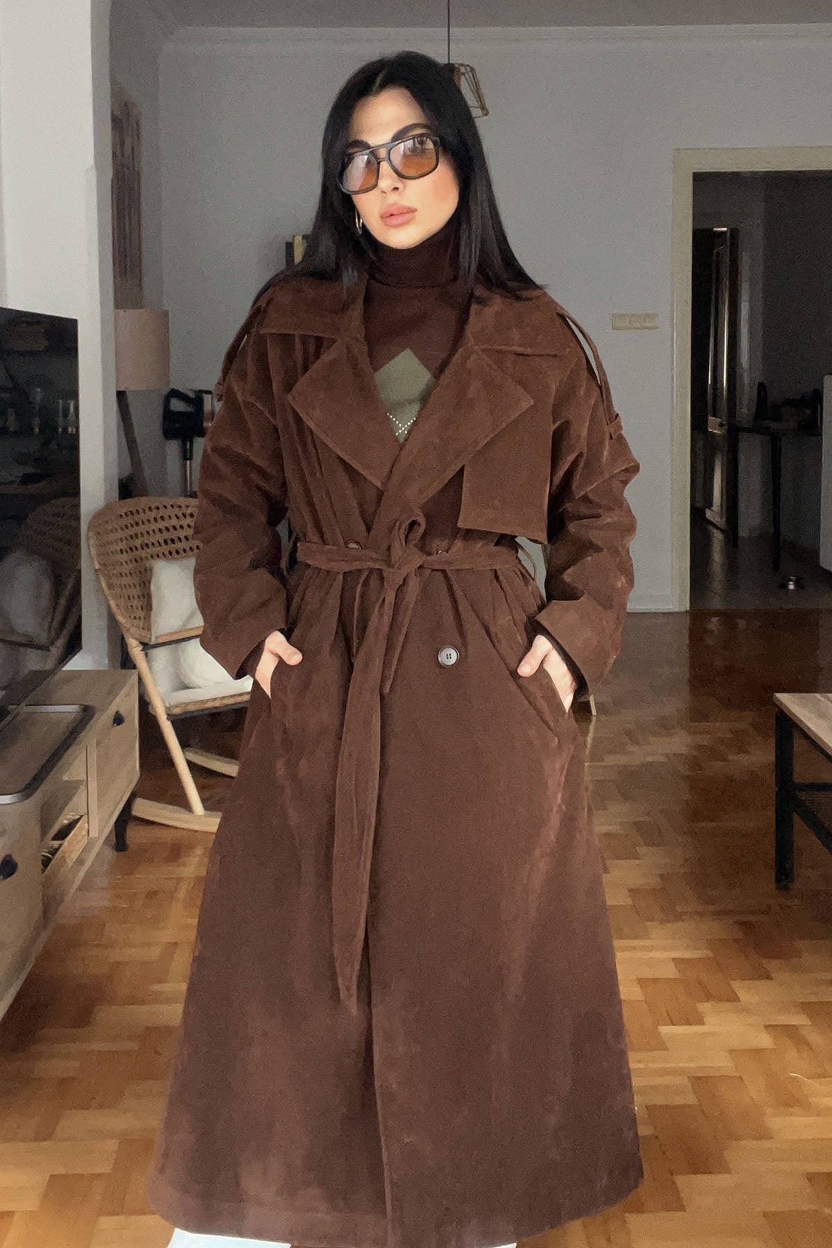 Acı Kahve Ponza Yırtmaç Detay Premium Süet Trençkot SY-2635-Acı Kahve