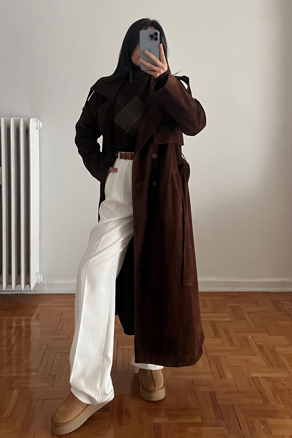 Ürün Detayları ; Sezonun en sevilen Trençkotları Seda Yalçın Atelier'de sizleri bekliyor. Acı Kahve Ponza Yırtmaç Detay Premium Süet Trençkot kombinlerinizin vazgeçilmezi olacak !