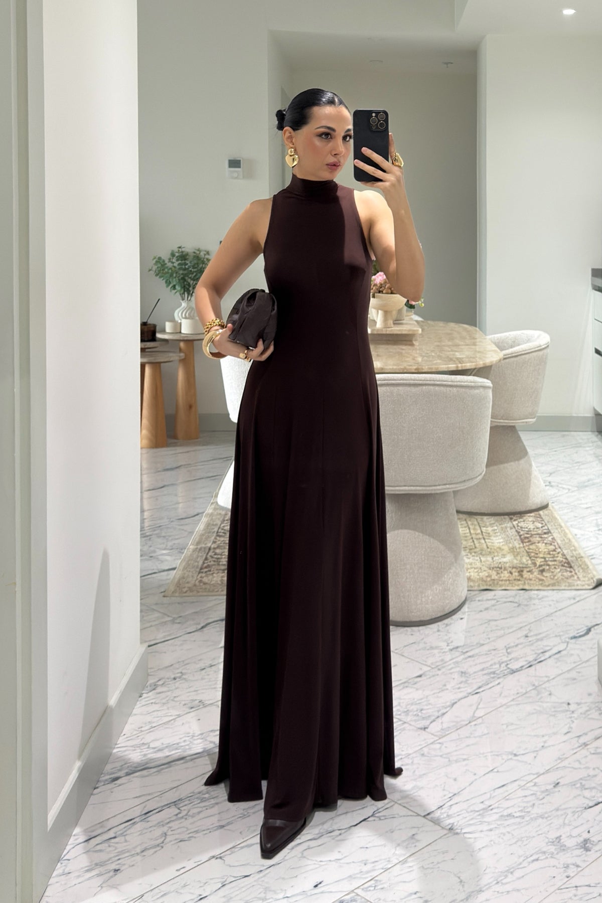 Ürün Detayları:Acı Kahverengi Balıkçı Yaka Maxi Boy Dökümlü Şık Kadın Elbise