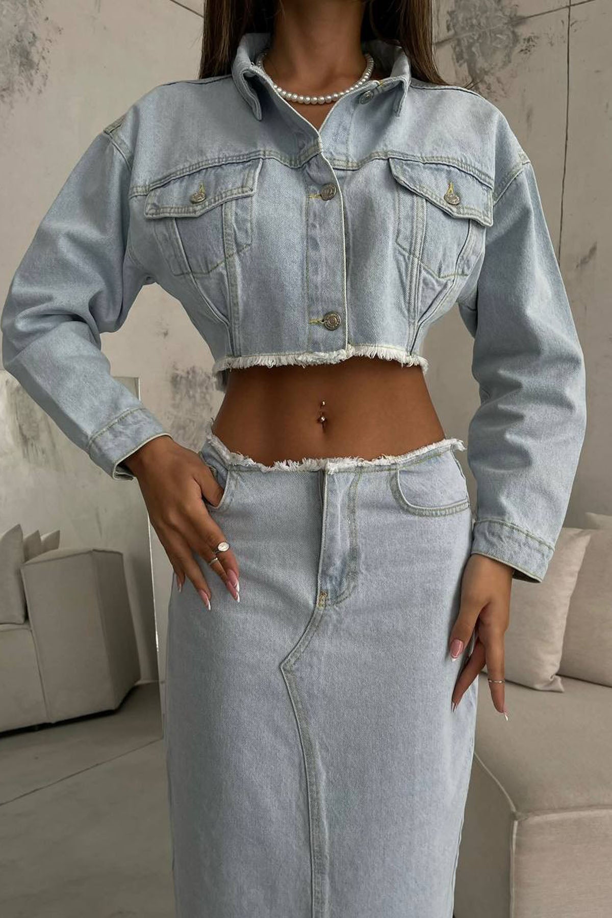 Açık Mavi Önden Parça Detaylı Arkadan Yırtmaçlı Denim Etek ve Ceket Takım SY-1052-Açık Mavi