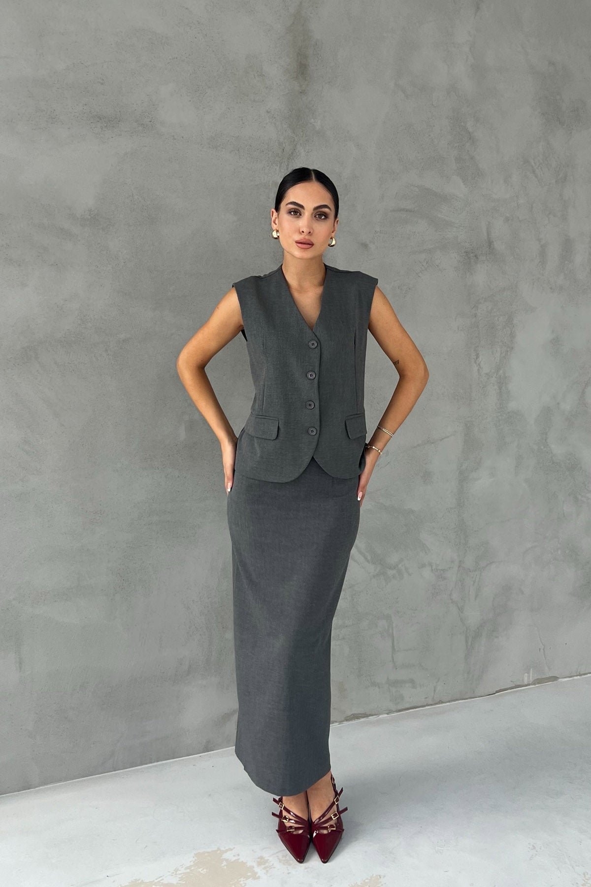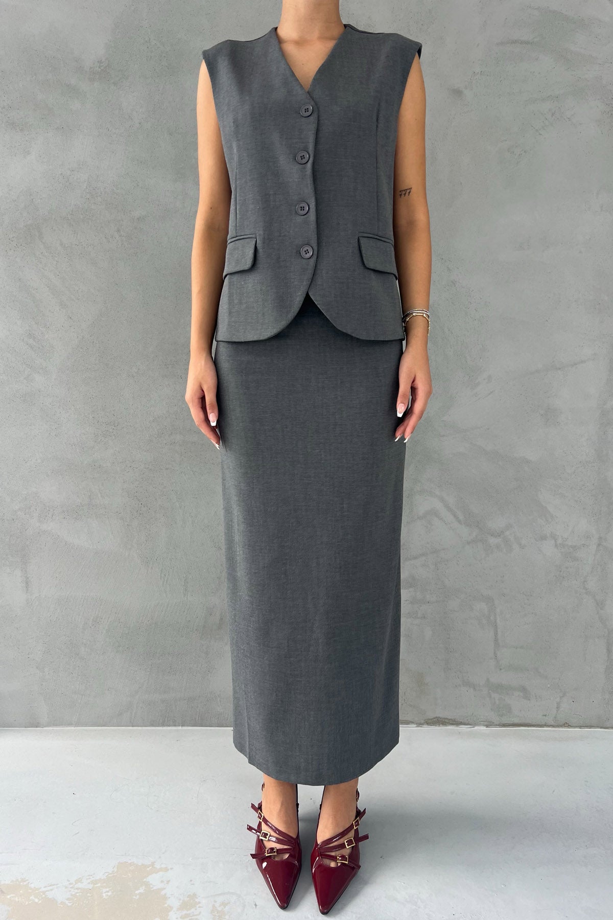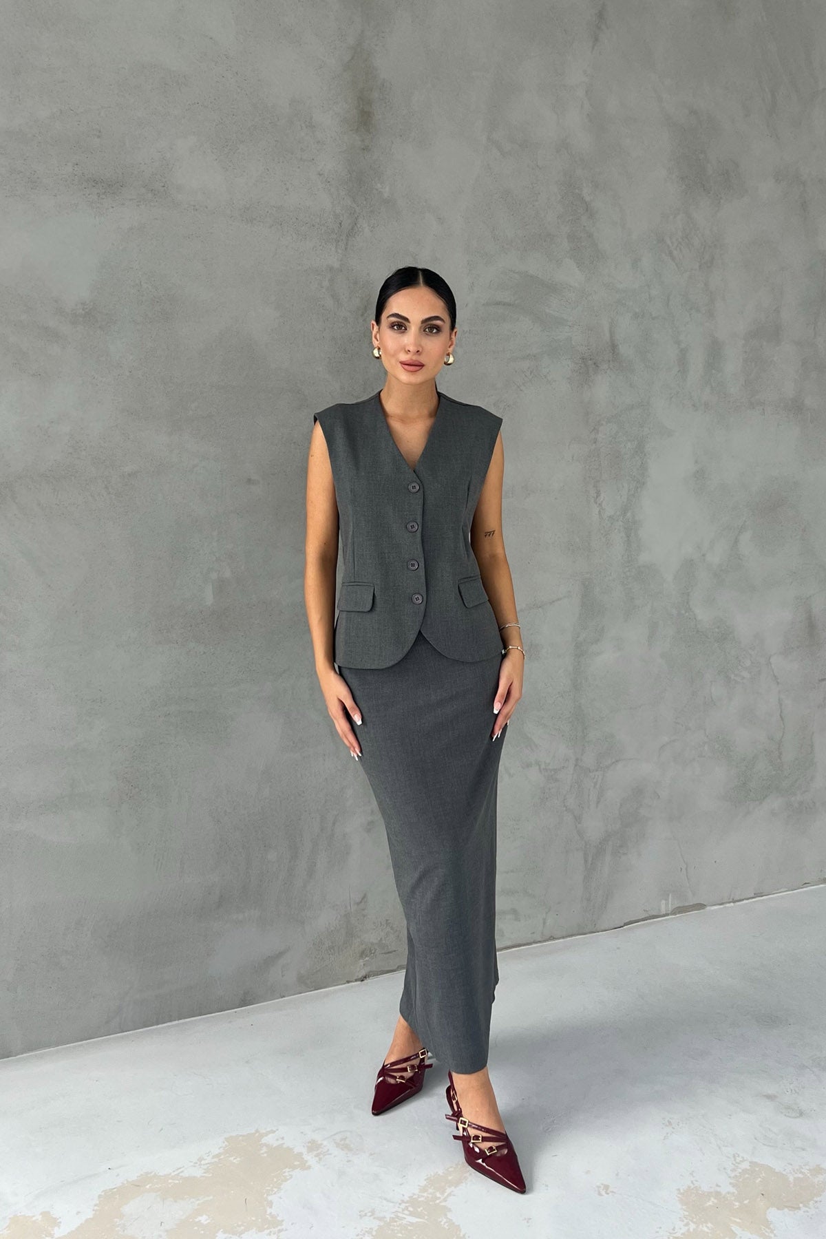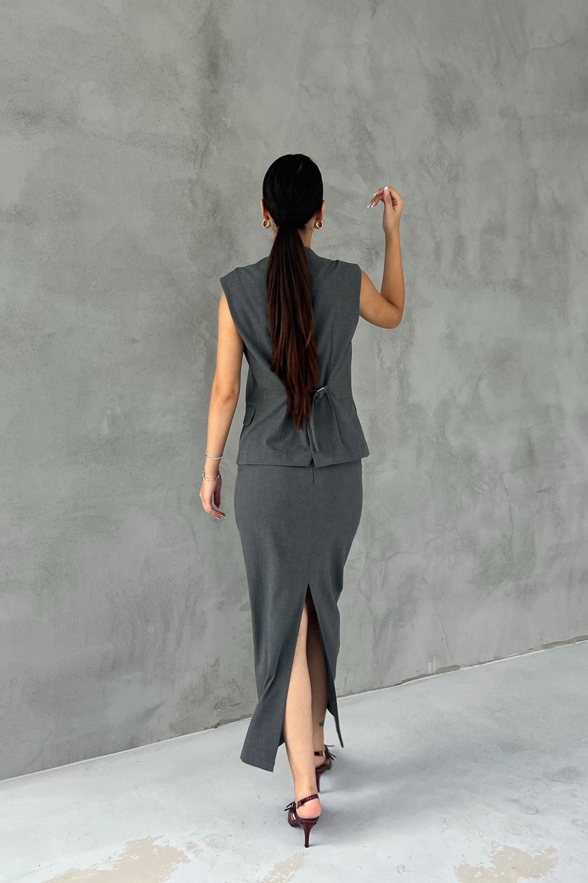 Antrasit Arkası Kısa Kemer Detaylı Yelek ve Yırtmaçlı Etek Takım SY-2482-Antrasit