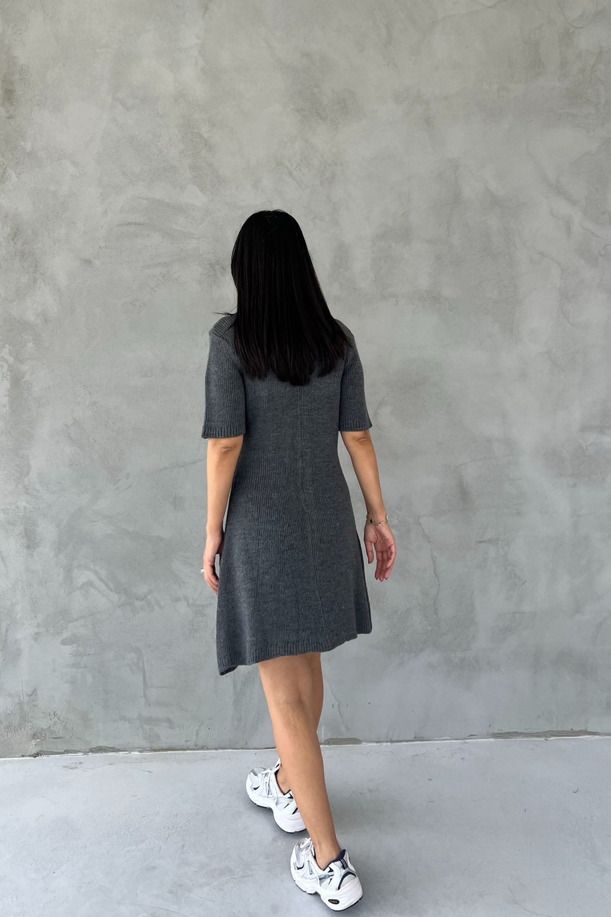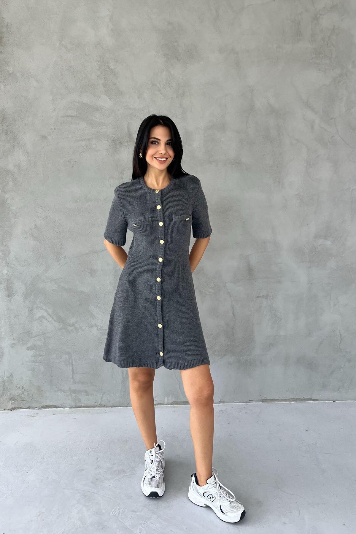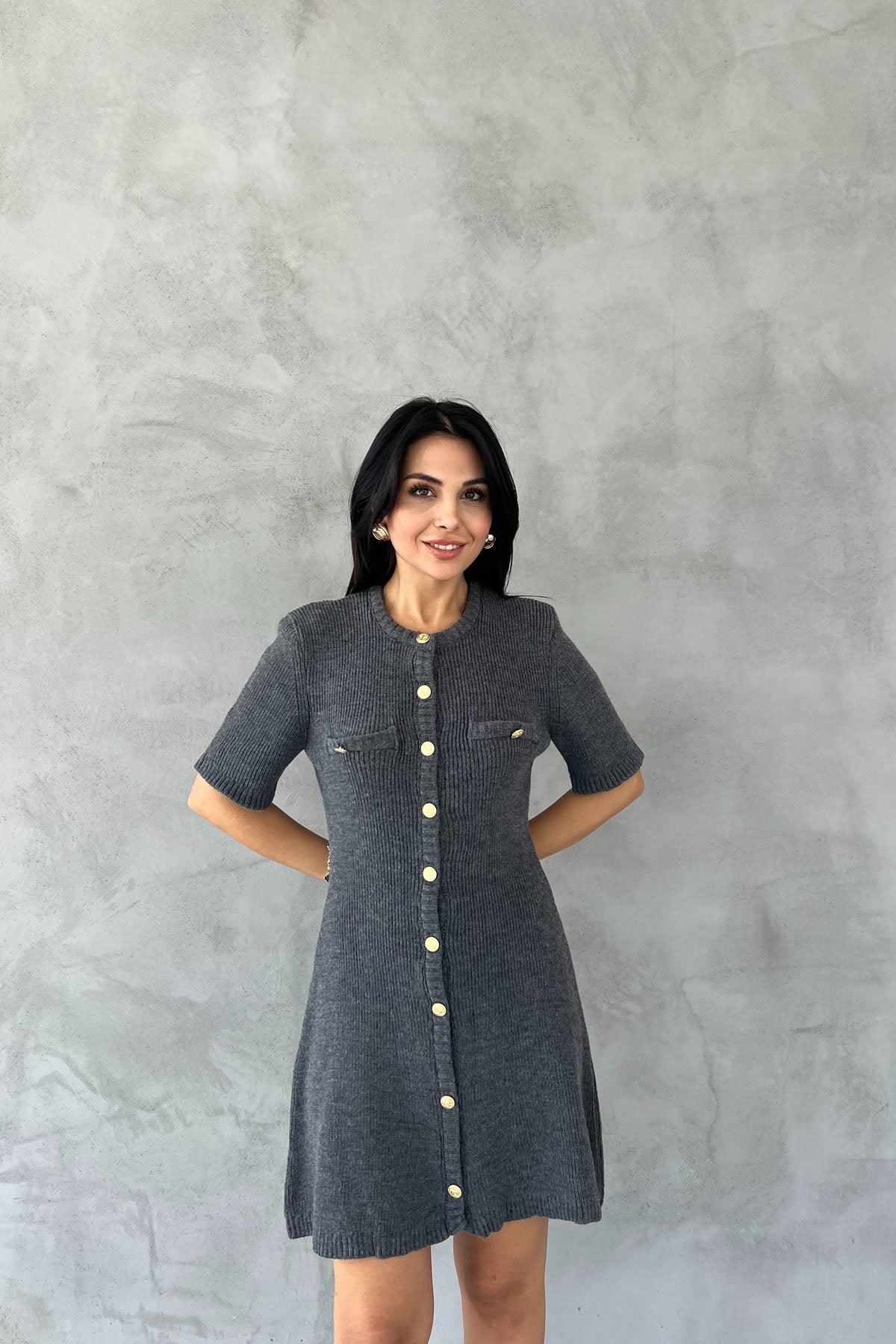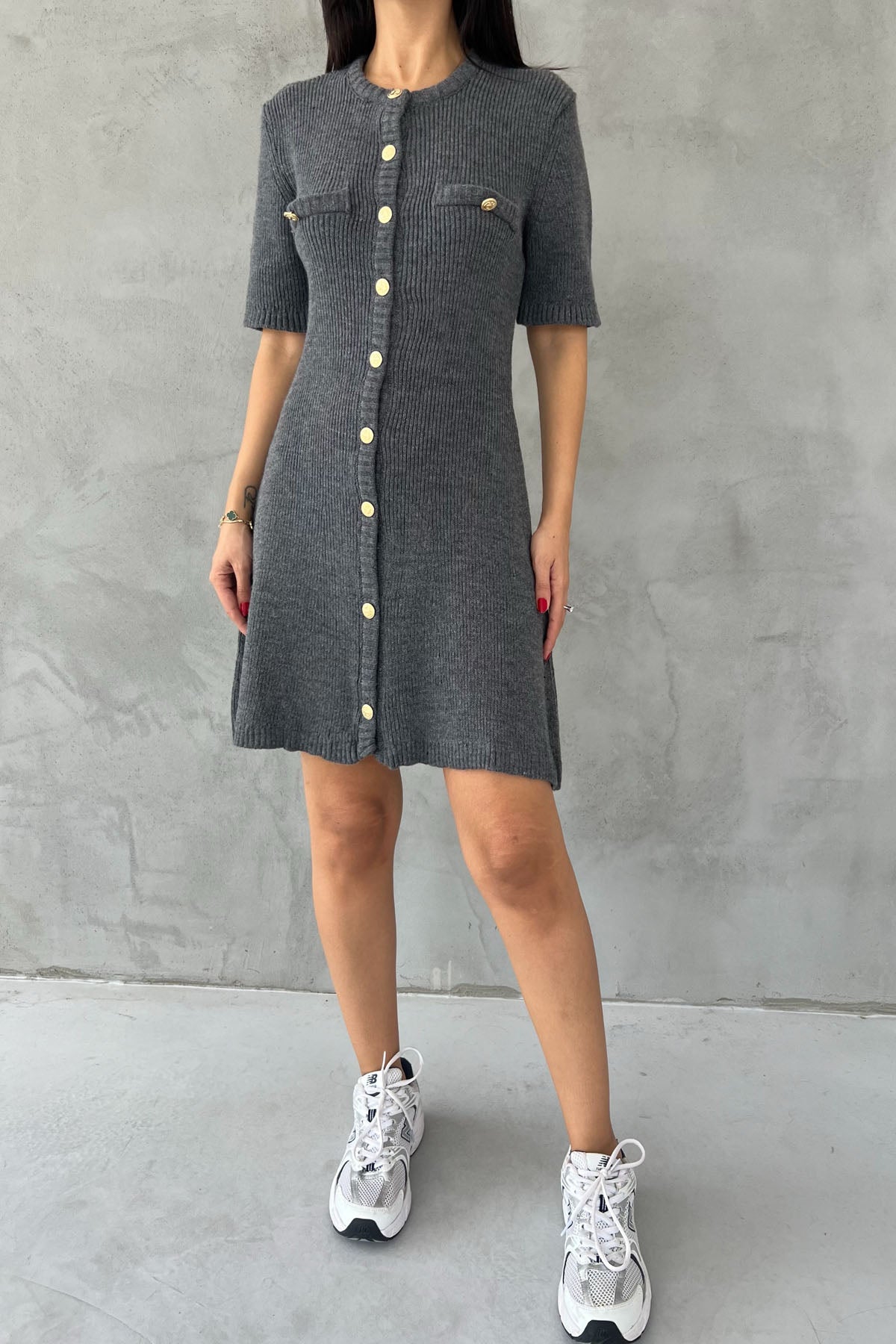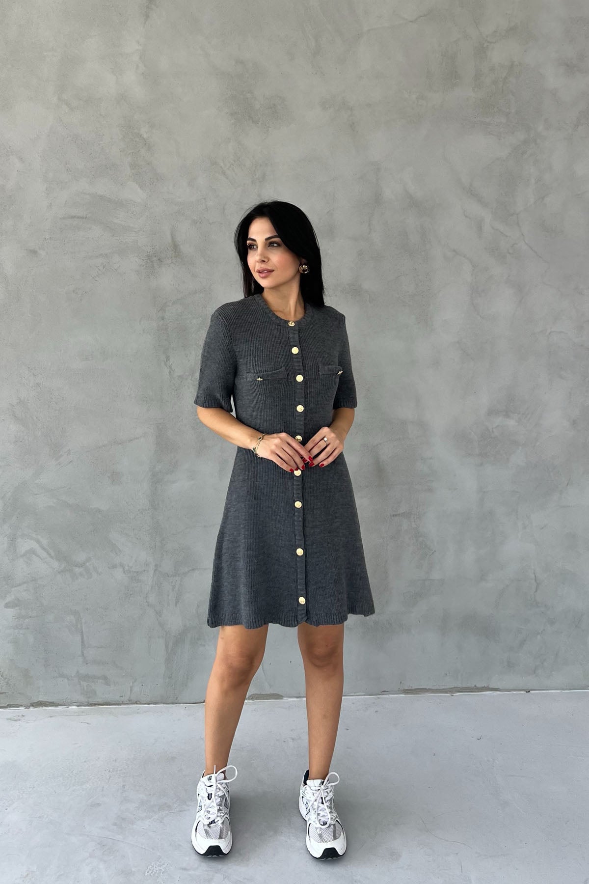 Antrasit Sahte Cep Detaylı Gold Düğmeli Triko Elbise SY-2534-Antrasit