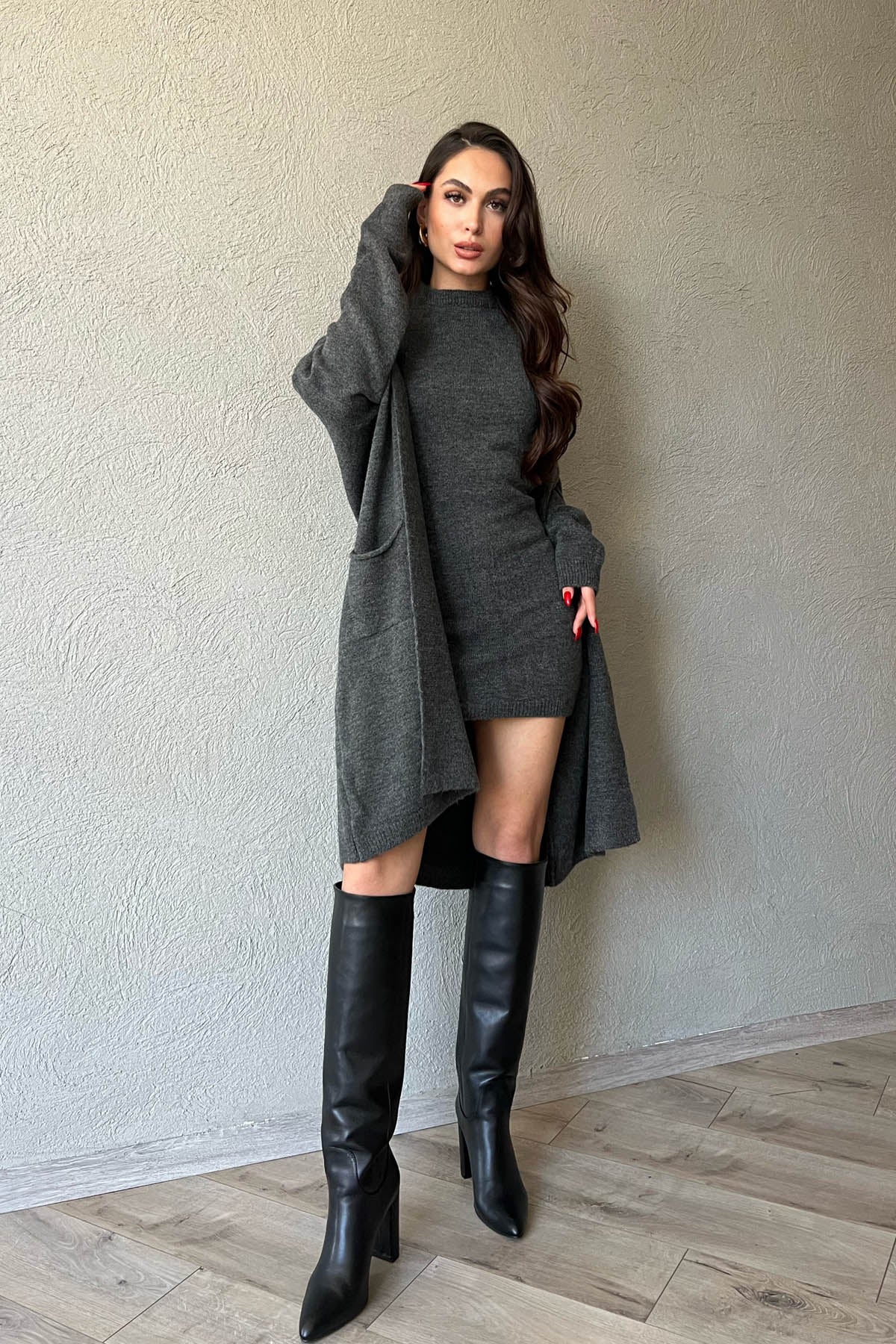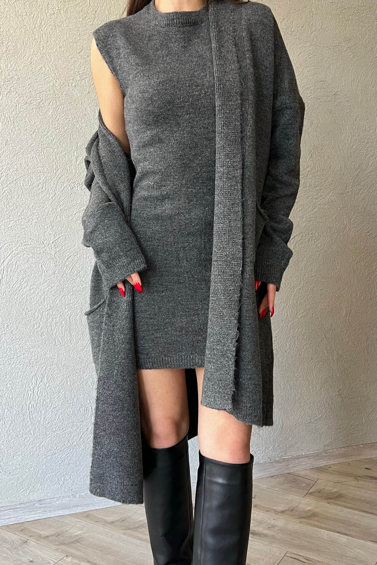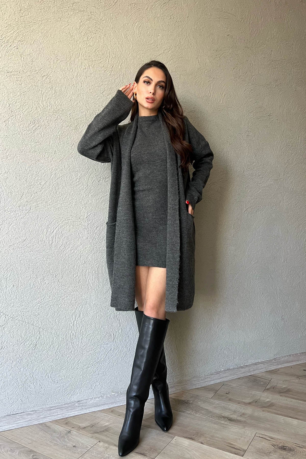 Ürün Detayları ; Antrasit Şal Yaka Hırka ve Elbise Triko Takım