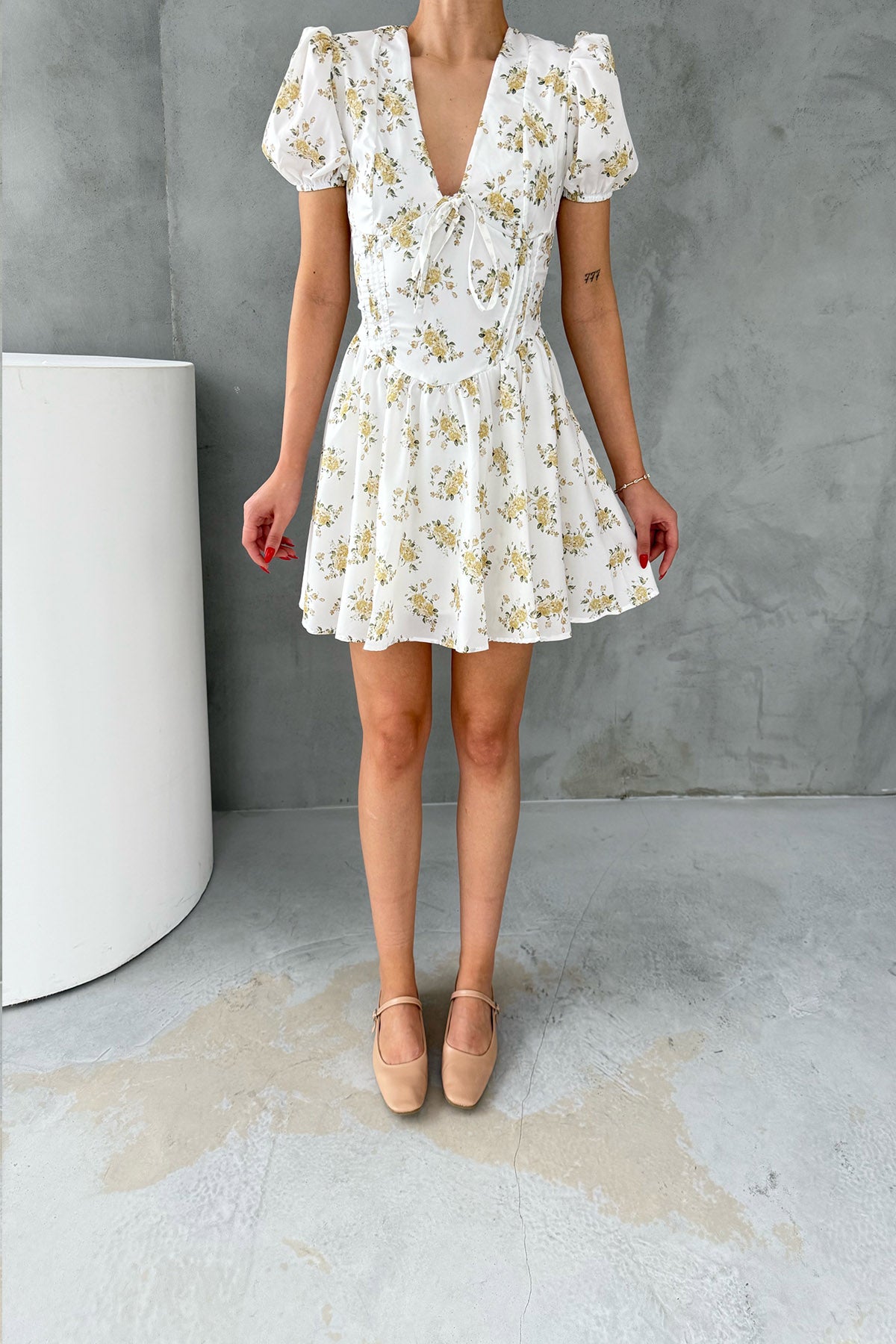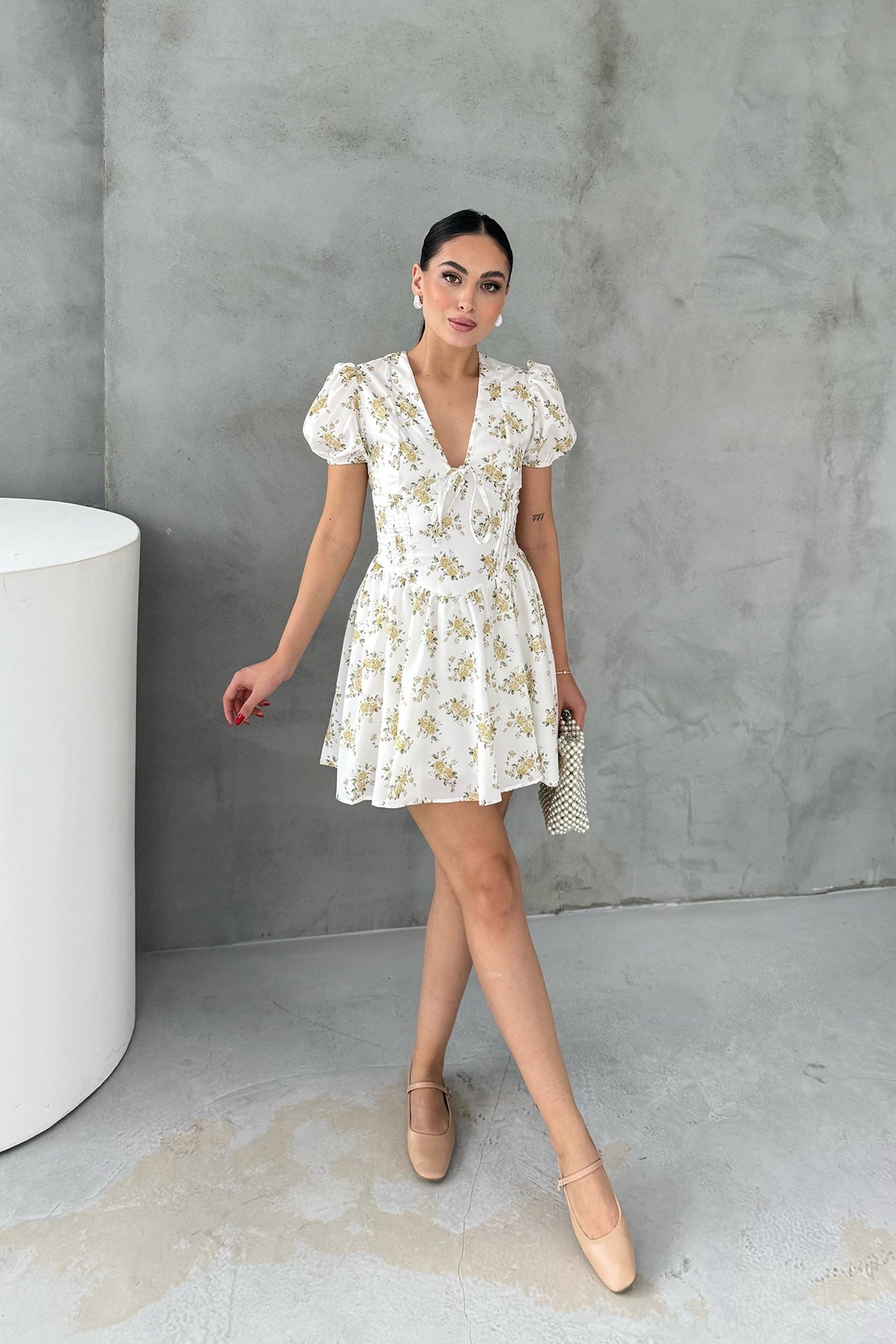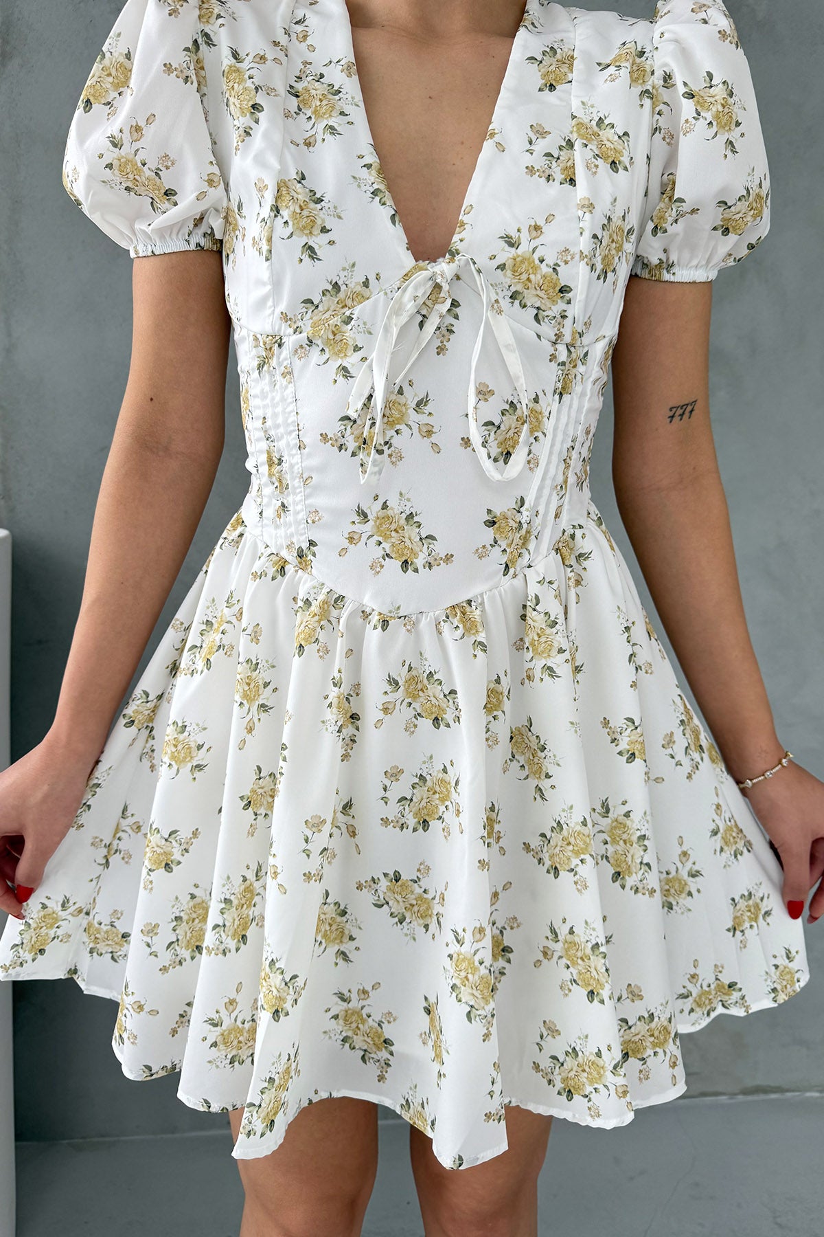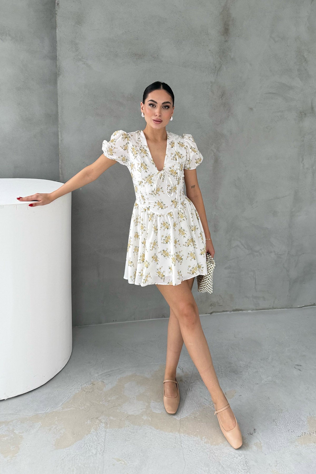 Balon Kol Sarı Çiçekli Mini Elbise SY-3055-Ekru