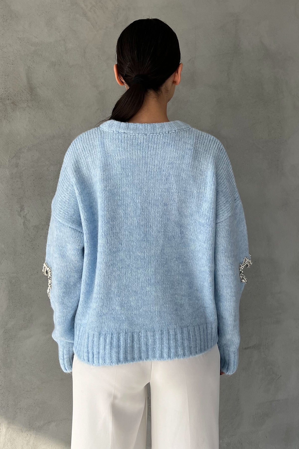 Bebe Mavisi Kolu Kalpli Taş Detay Triko Kazak SY-2747-Bebe Mavisi