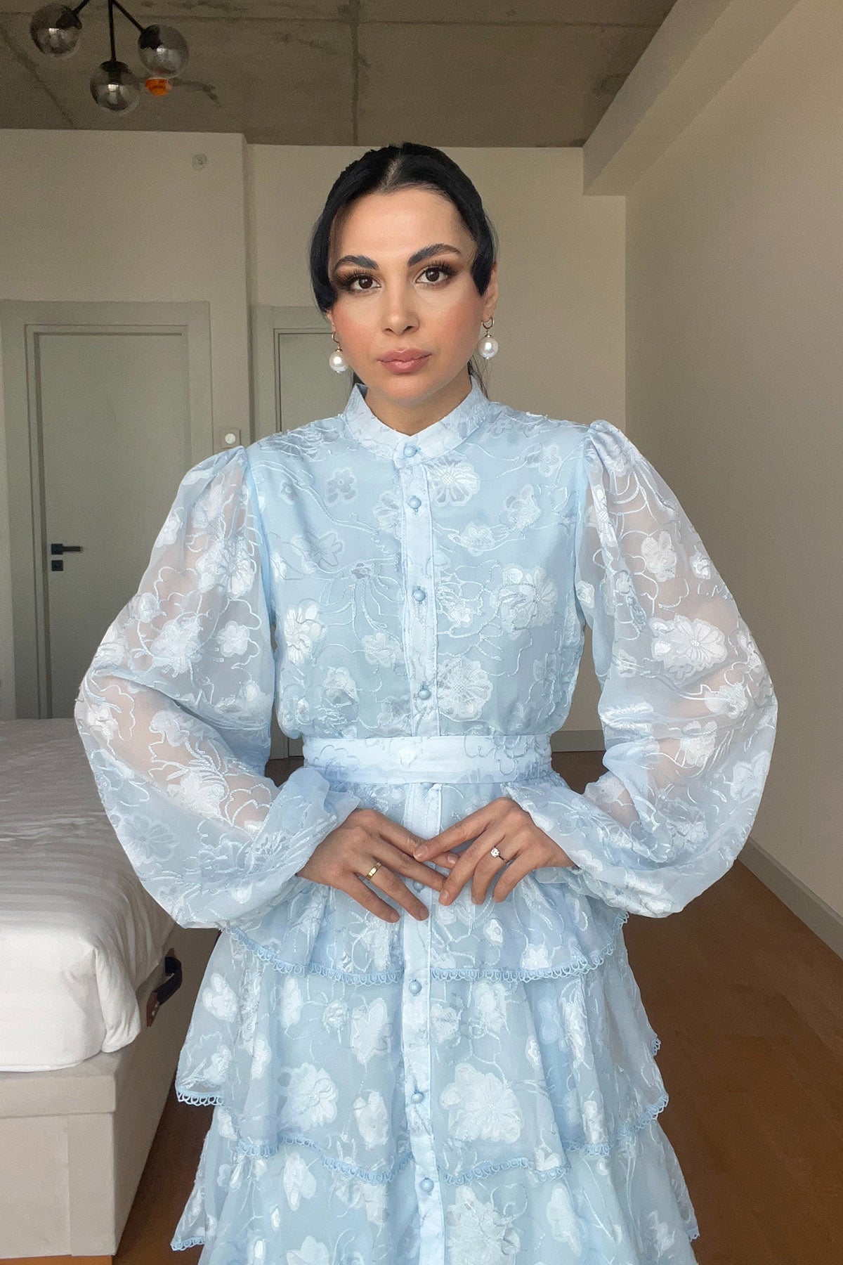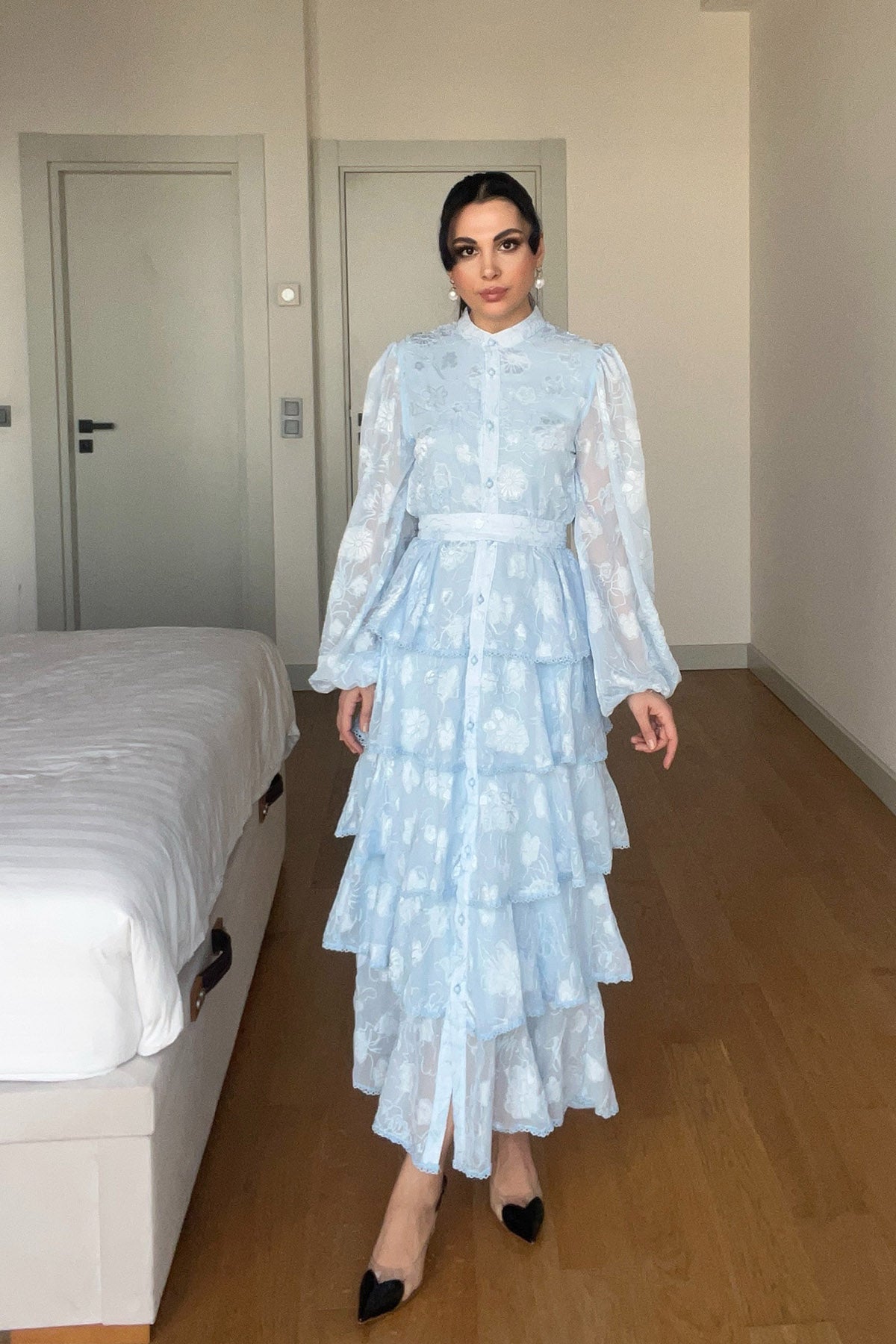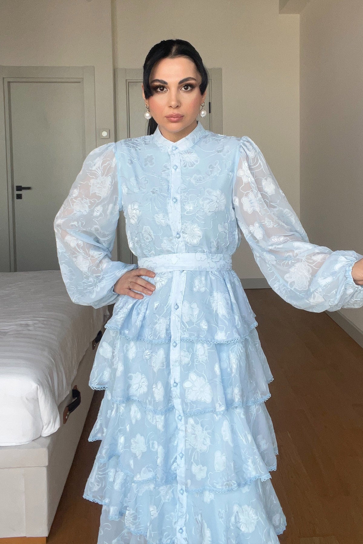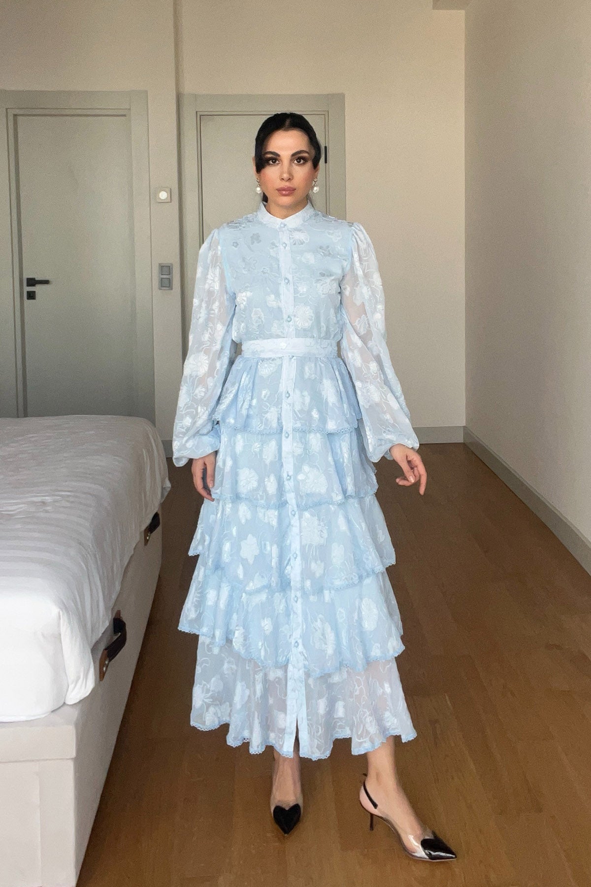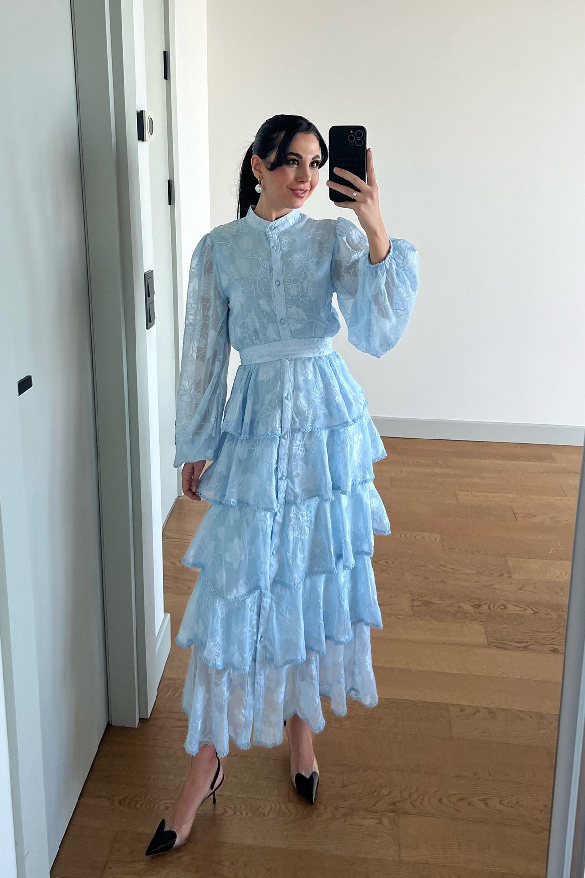 Bebe Mavisi Valonlu Şerit Detaylı Kat Kat Elbise SY-1747-Bebe Mavisi