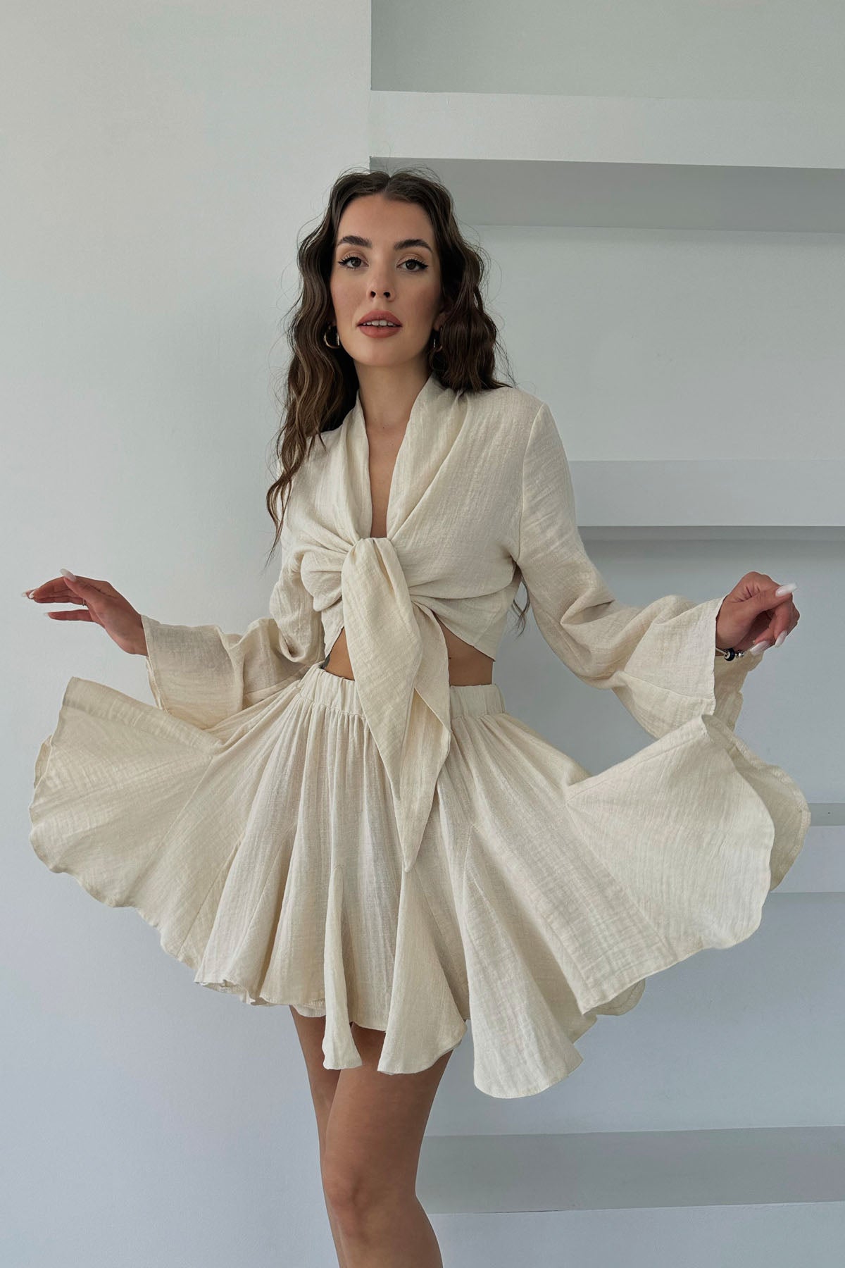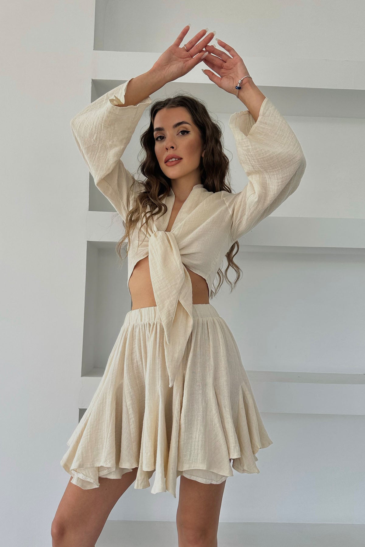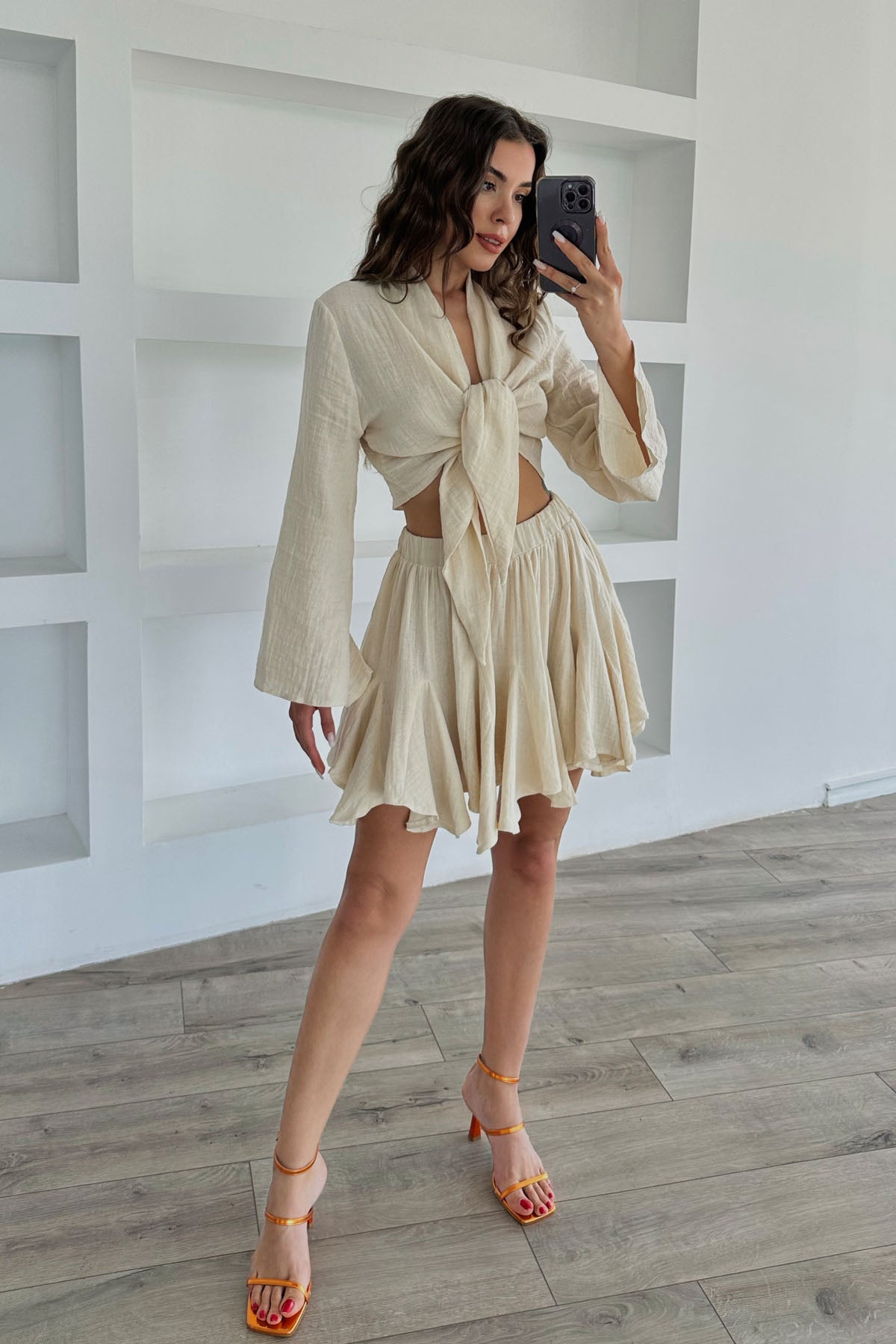 Bej Bağlama Detay Bluz ve Fırfırlı Etek Takım SY-0401-Bej