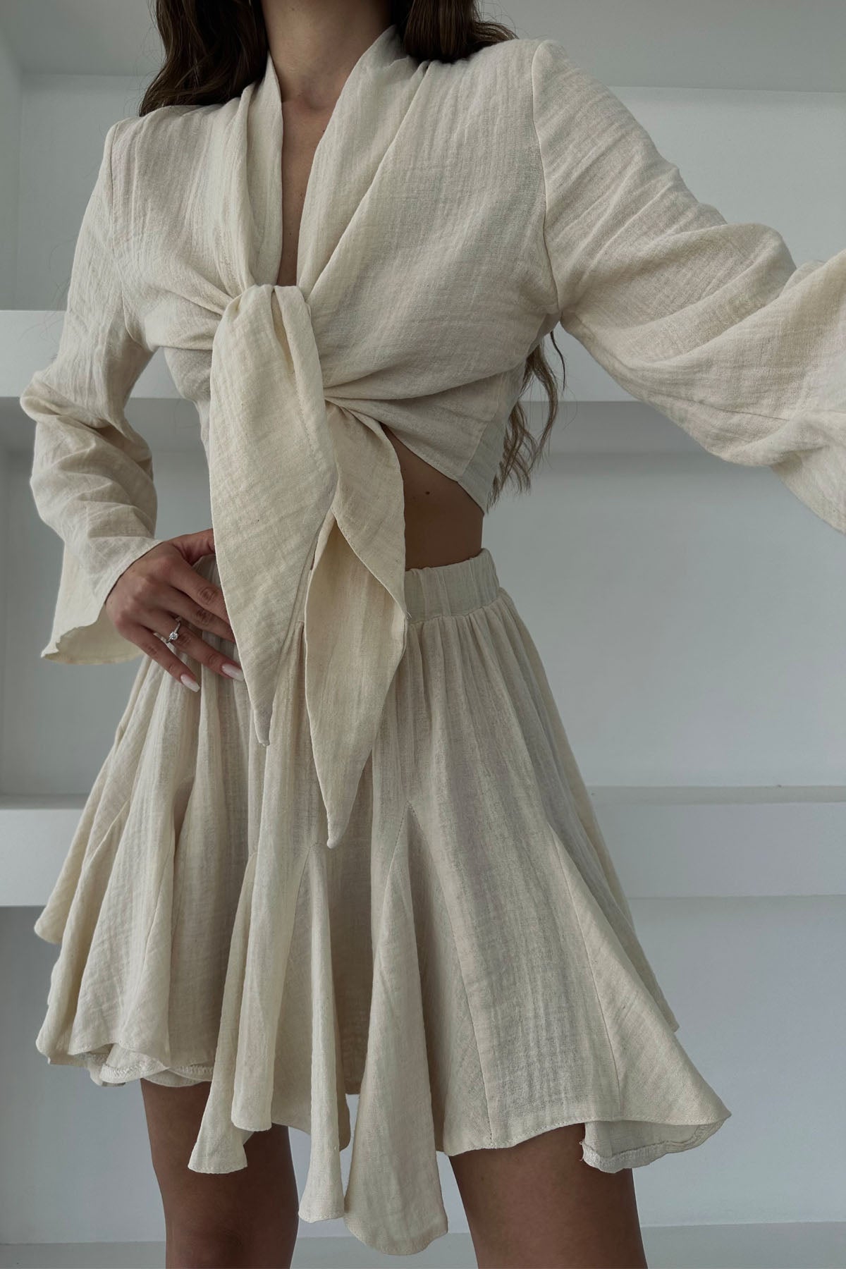 Ürün Detayları ; Sezonun en sevilen takımları Seda Yalçın Atelier'de sizlerle. Bağlama detay bluzu ve fırfırlı keten eteği ile bu takım .