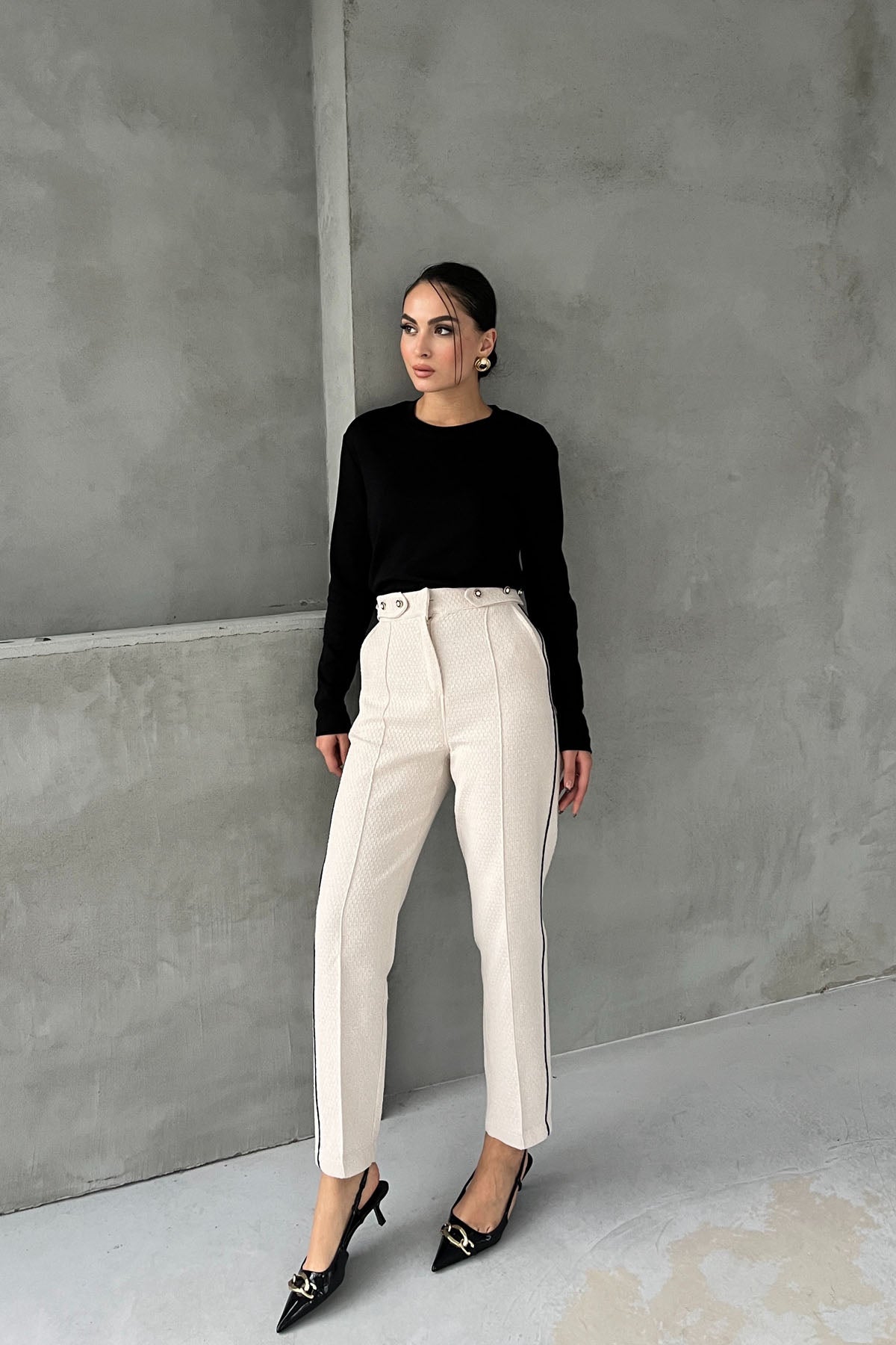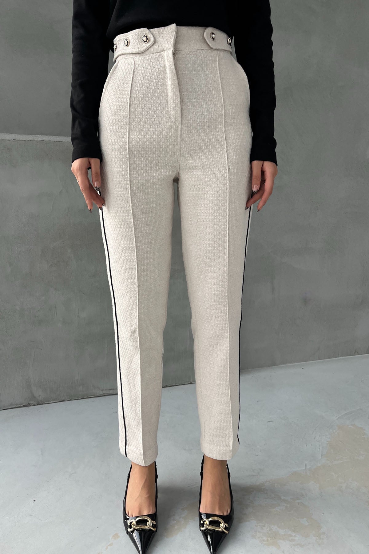 Ürün Detayları ; Sezonun en sevilen Pantolon Modelleri Seda Yalçın Atelier'de sizleri bekliyor. Bej Beli İnci Detay Siyah Şeritli Tüvit Pantolon kombinlerinizin vazgeçilmezi olacak !