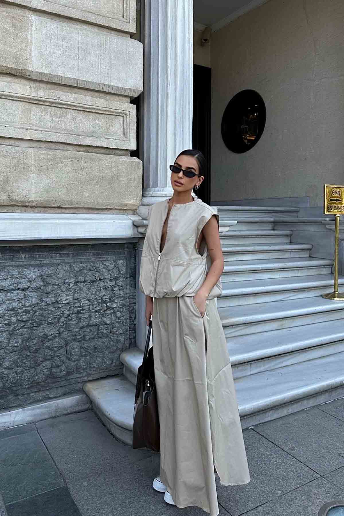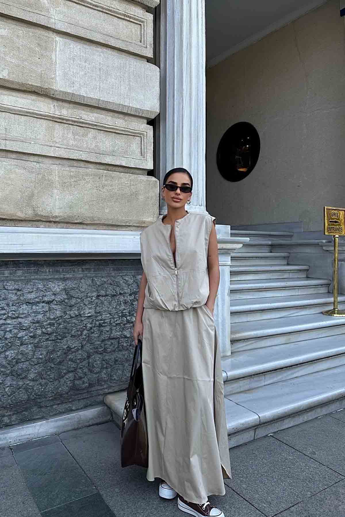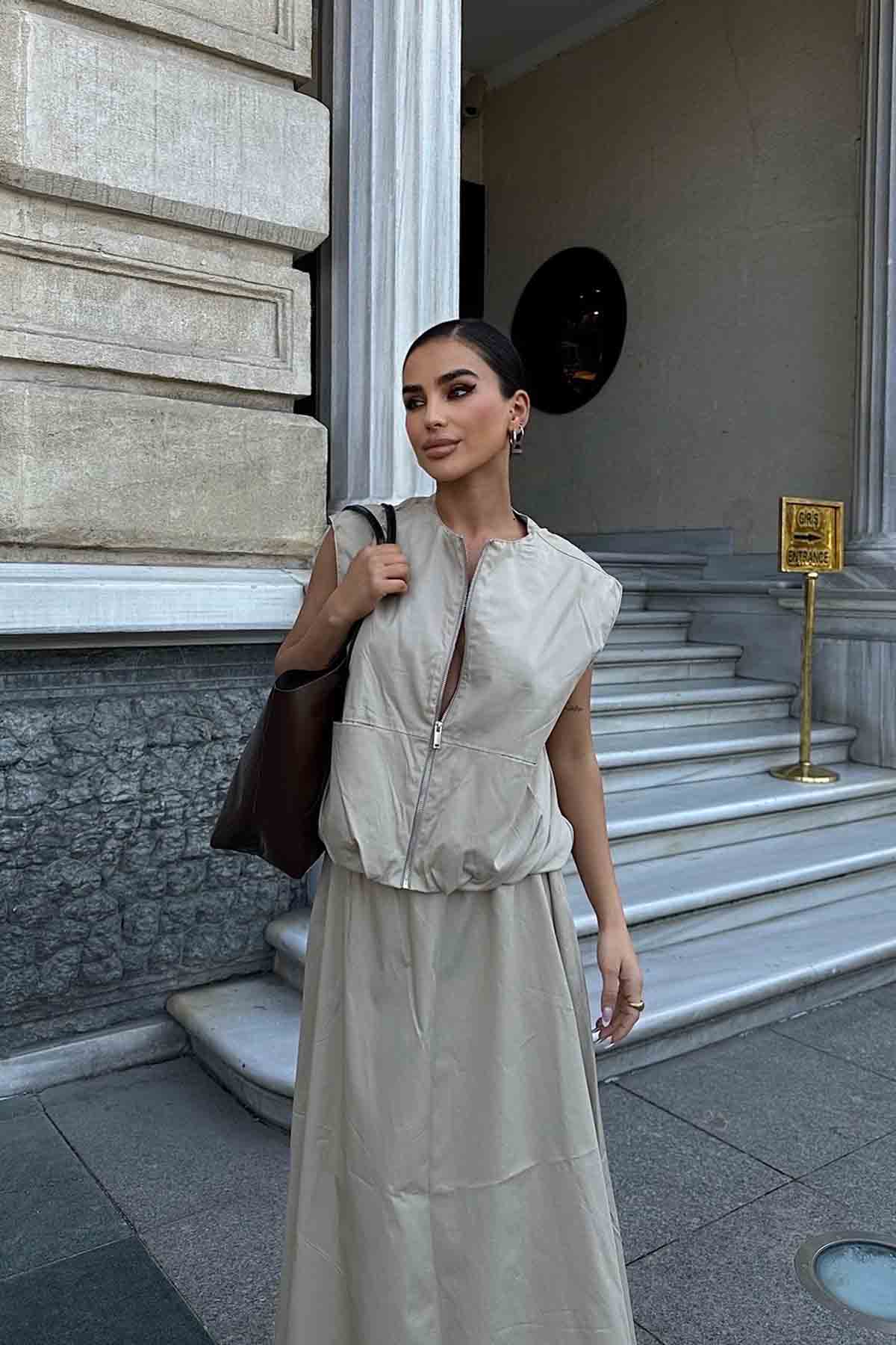 Bej Fermuarlı Sıfır Kol Yelek Etek Rome Takım 1907