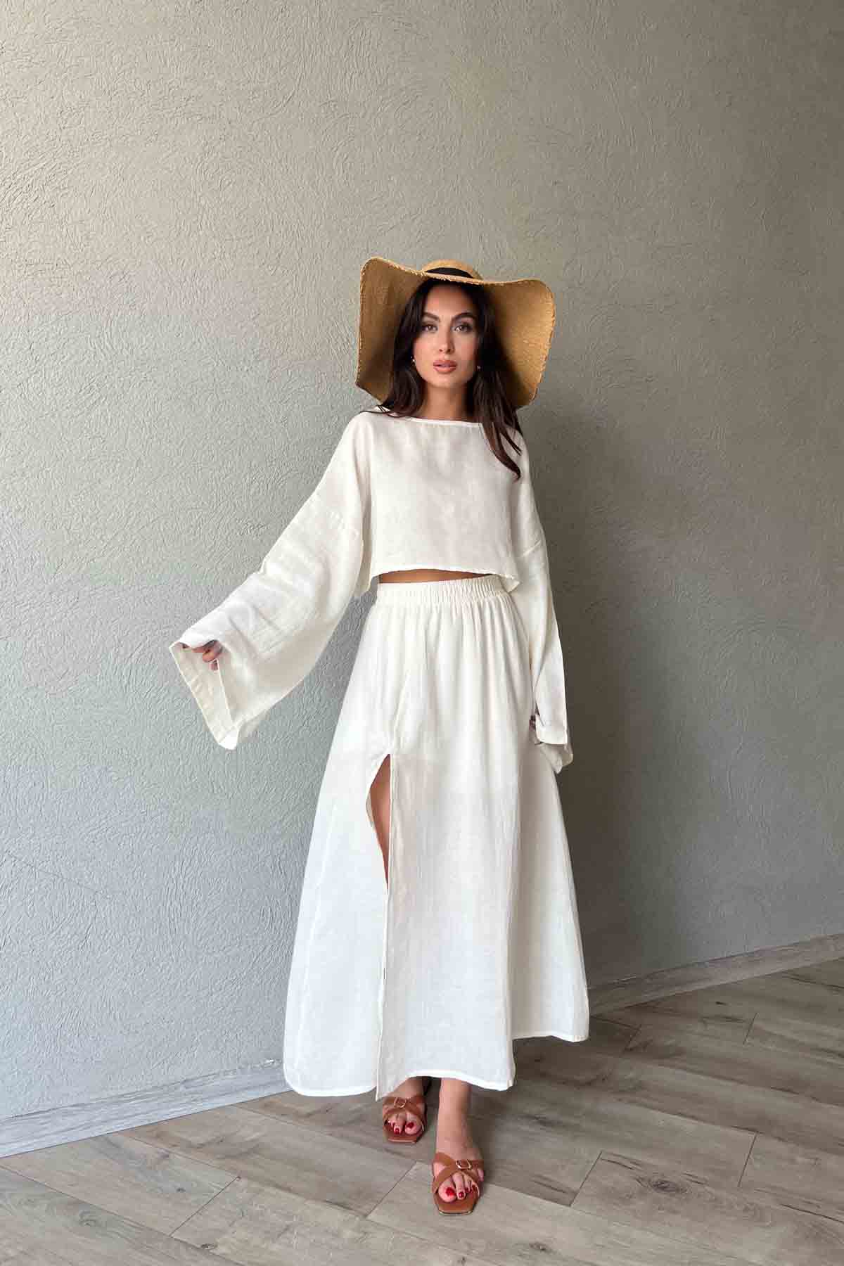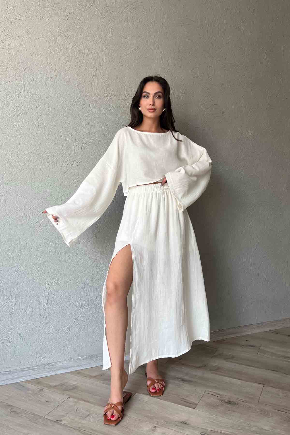 Bej Geniş Kol Detaylı Eteği Yırtmaçlı Müslin Takım SY-1905-Bej