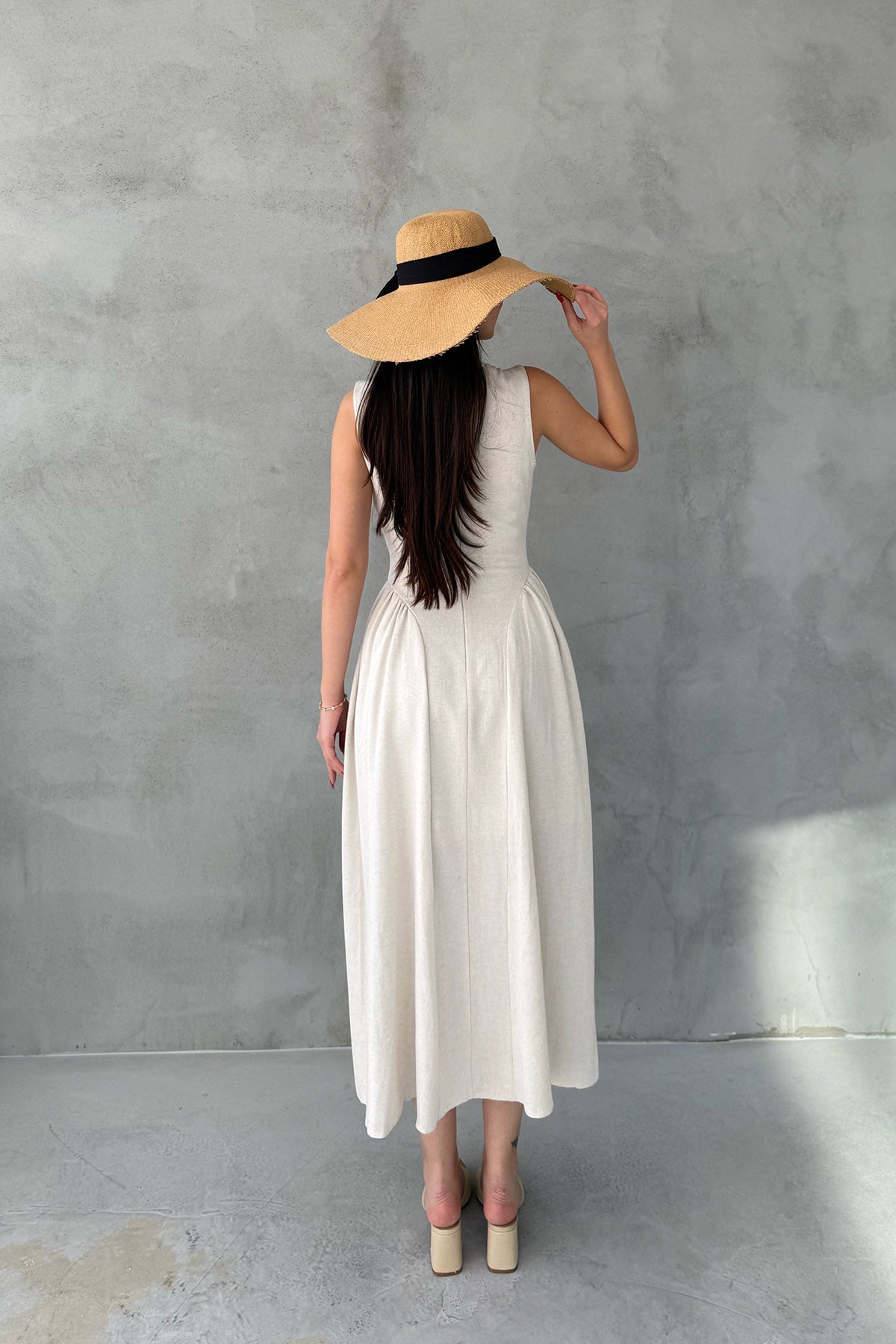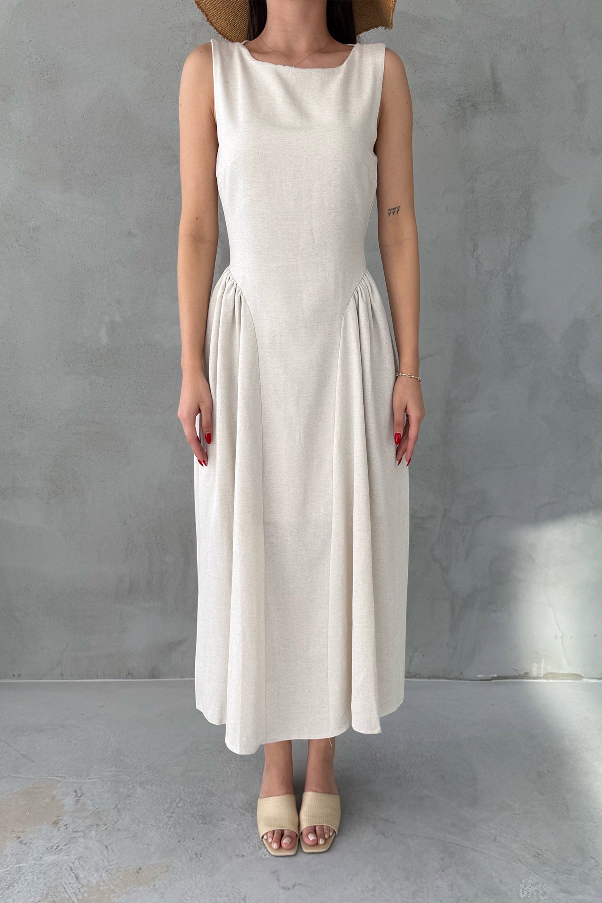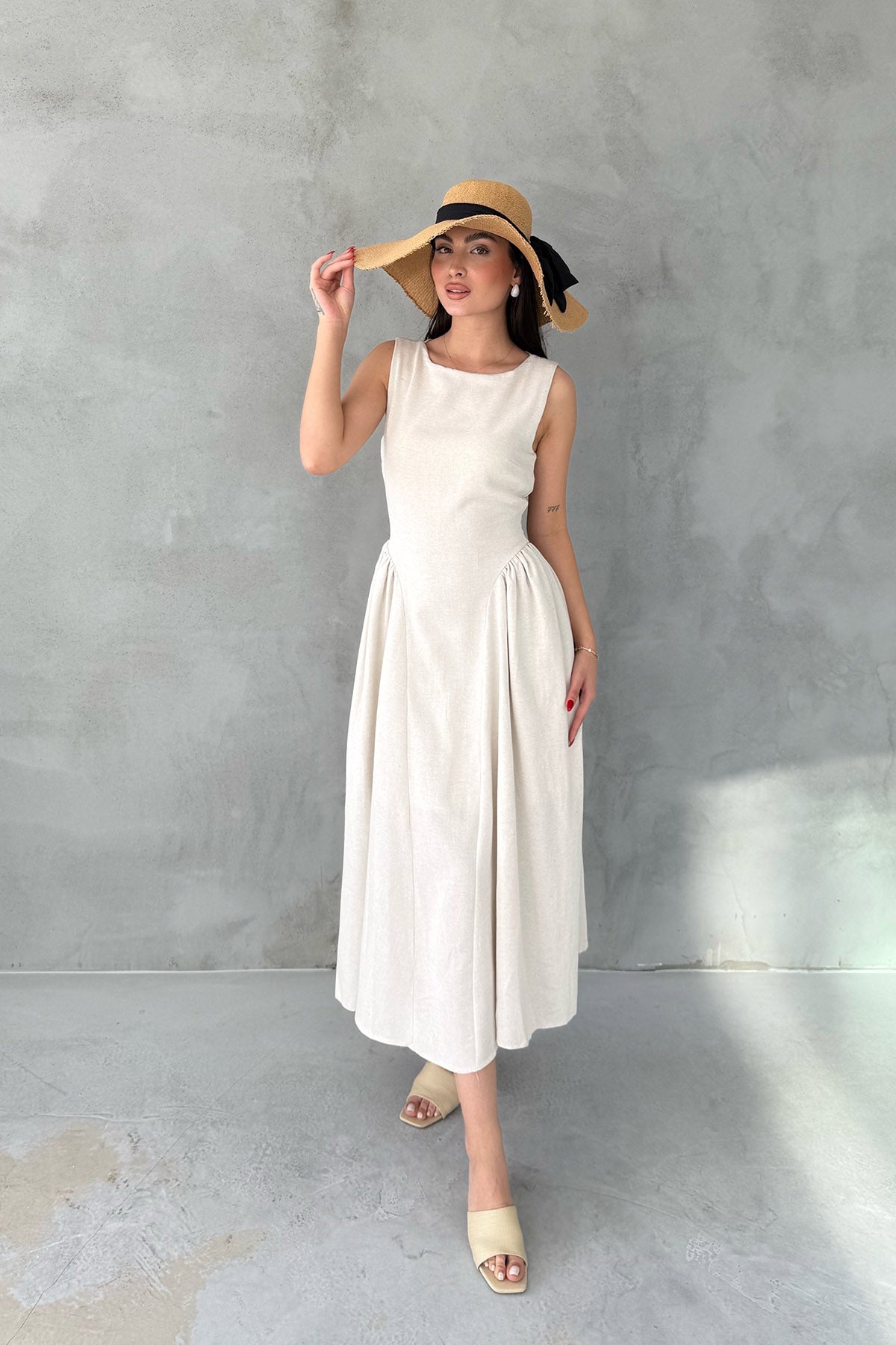 Bej Keten Yanları Büzgülü Midi Boy Prenses Elbise SY-3079-Bej