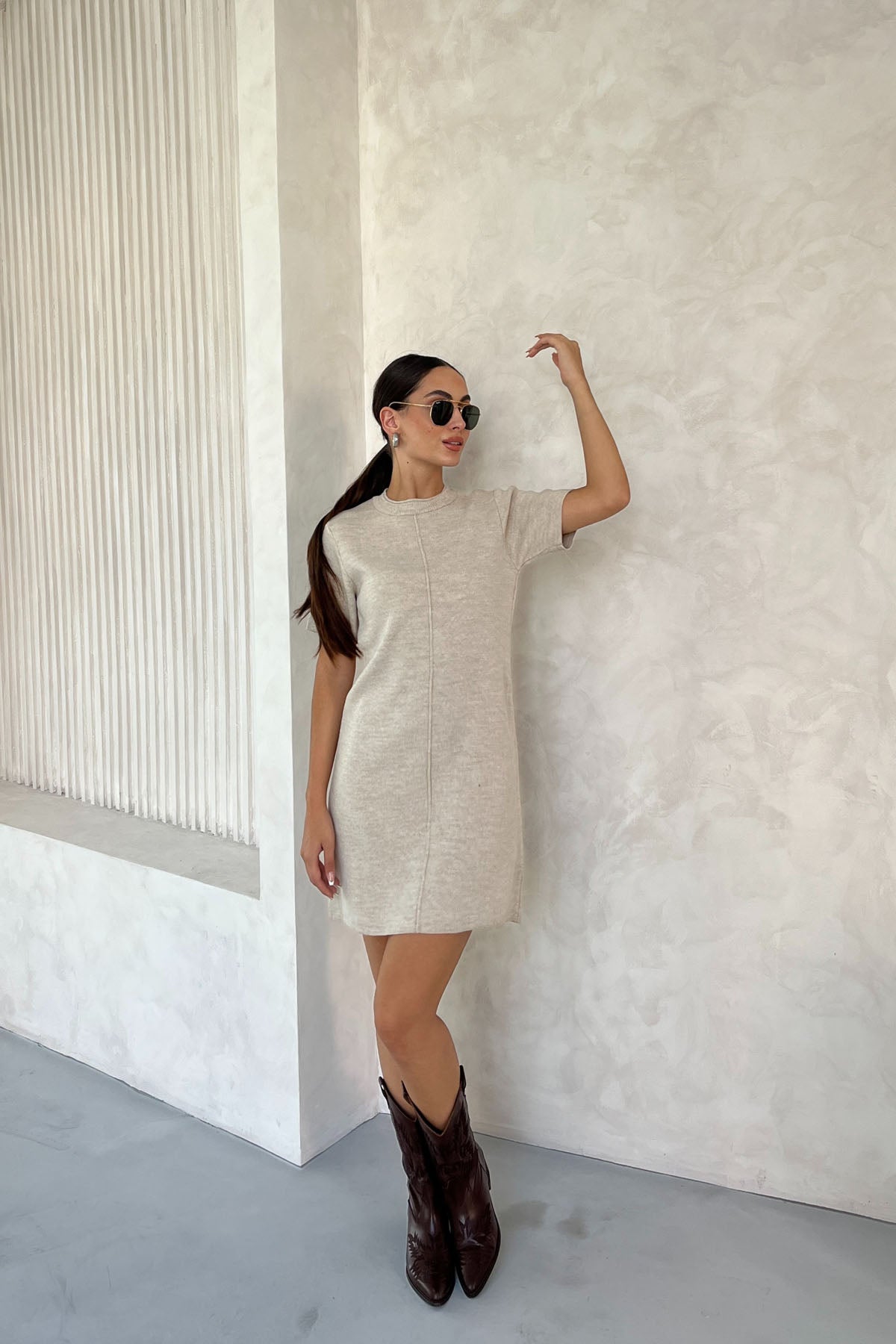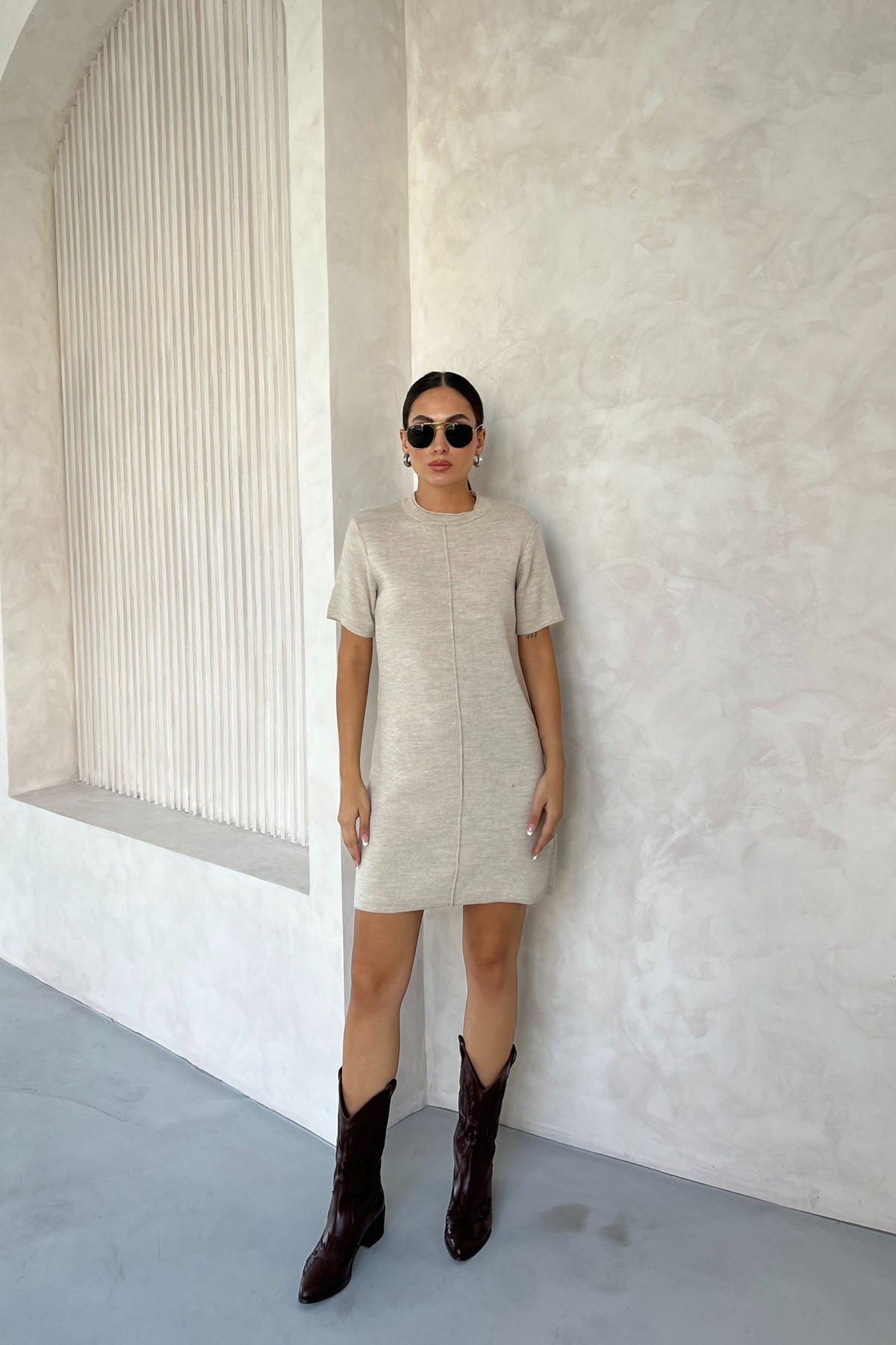 Bej Önü Dikiş Detaylı Kısa Triko Elbise SY-23834-Bej