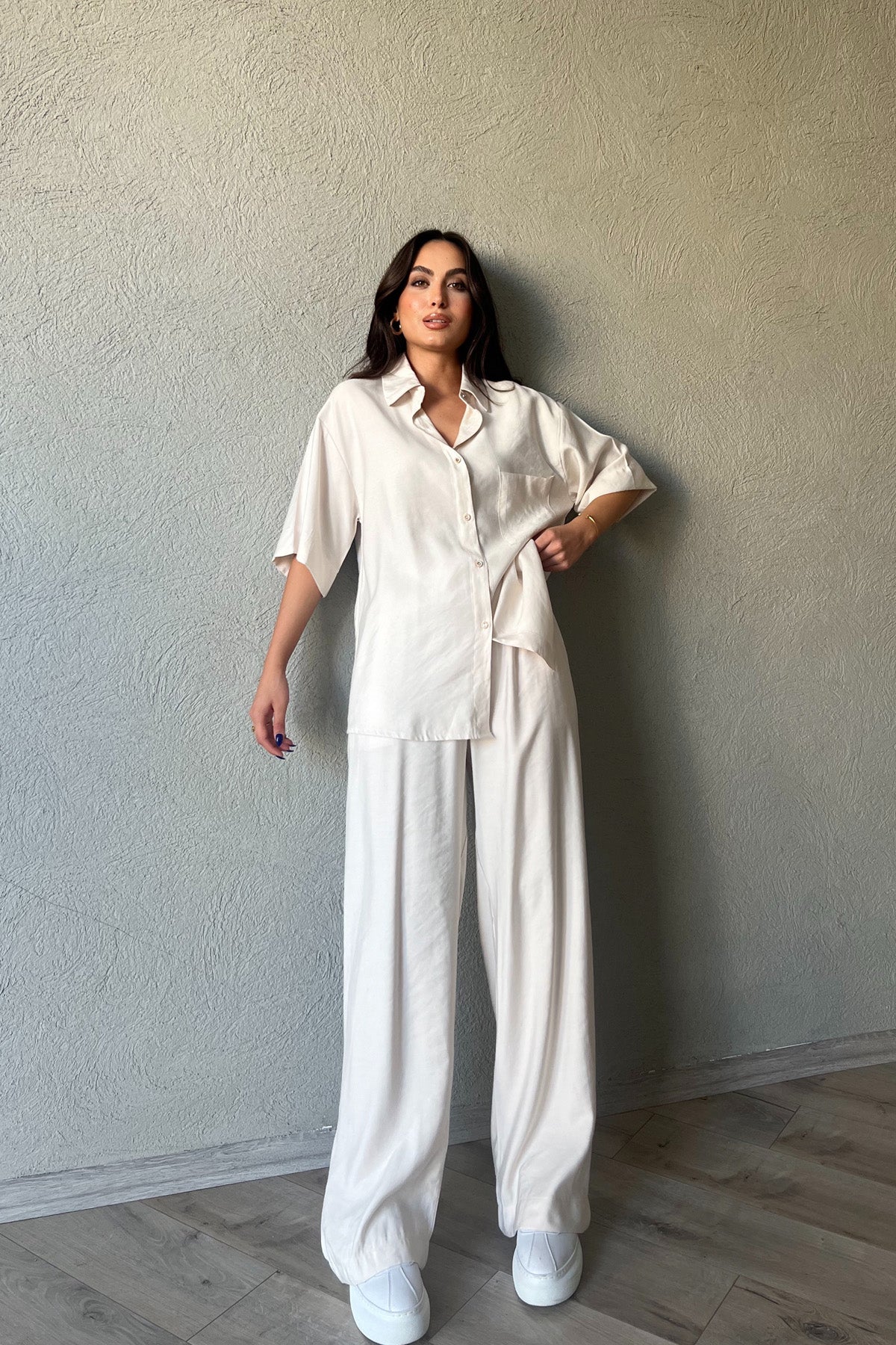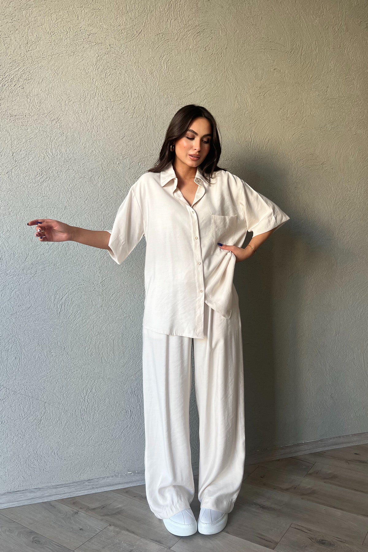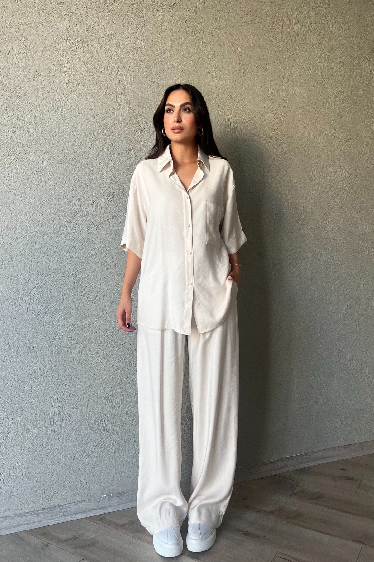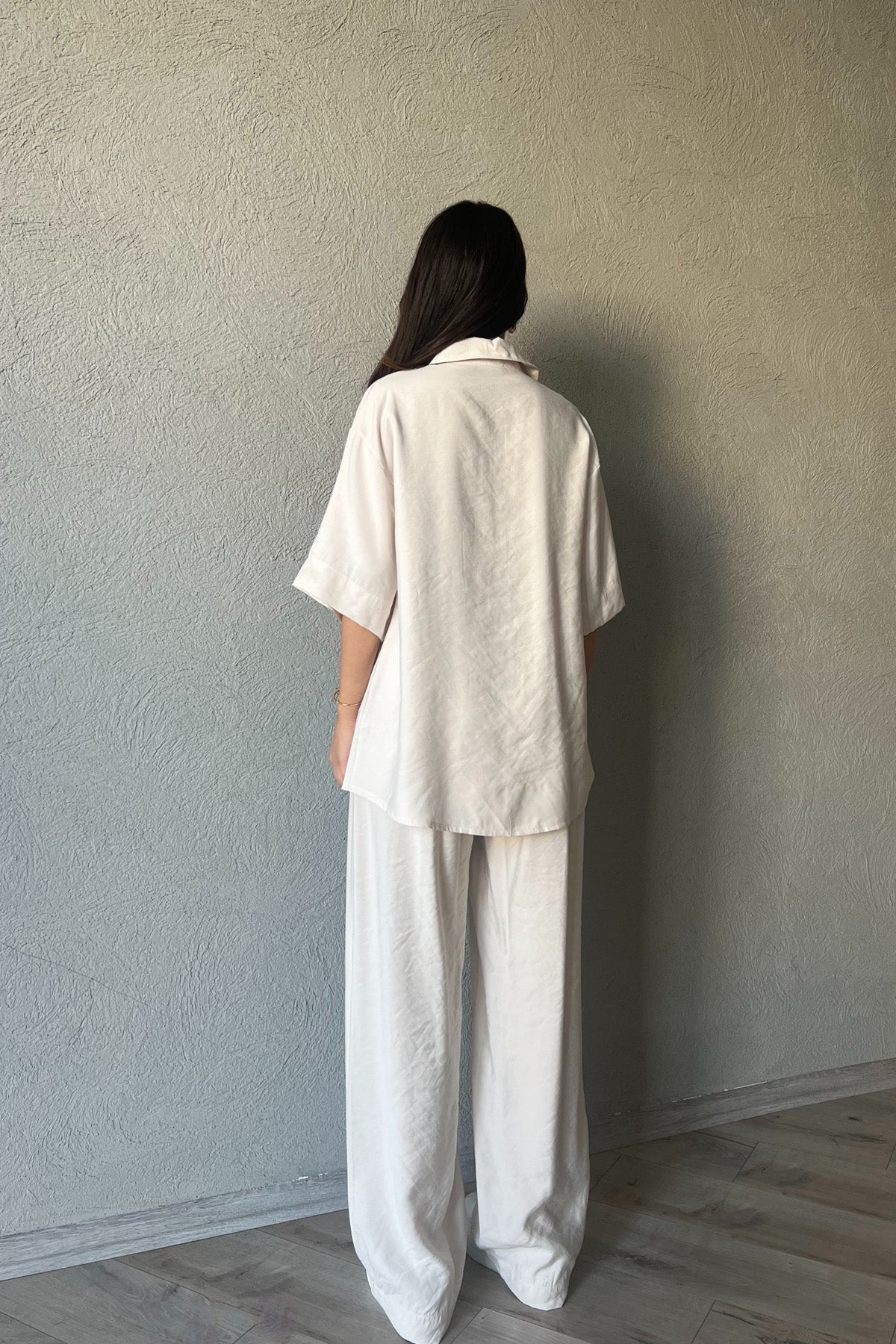 Bej Tensel Kısa Kol Gömlek Pantolon Keten Takım SY-2077-Bej