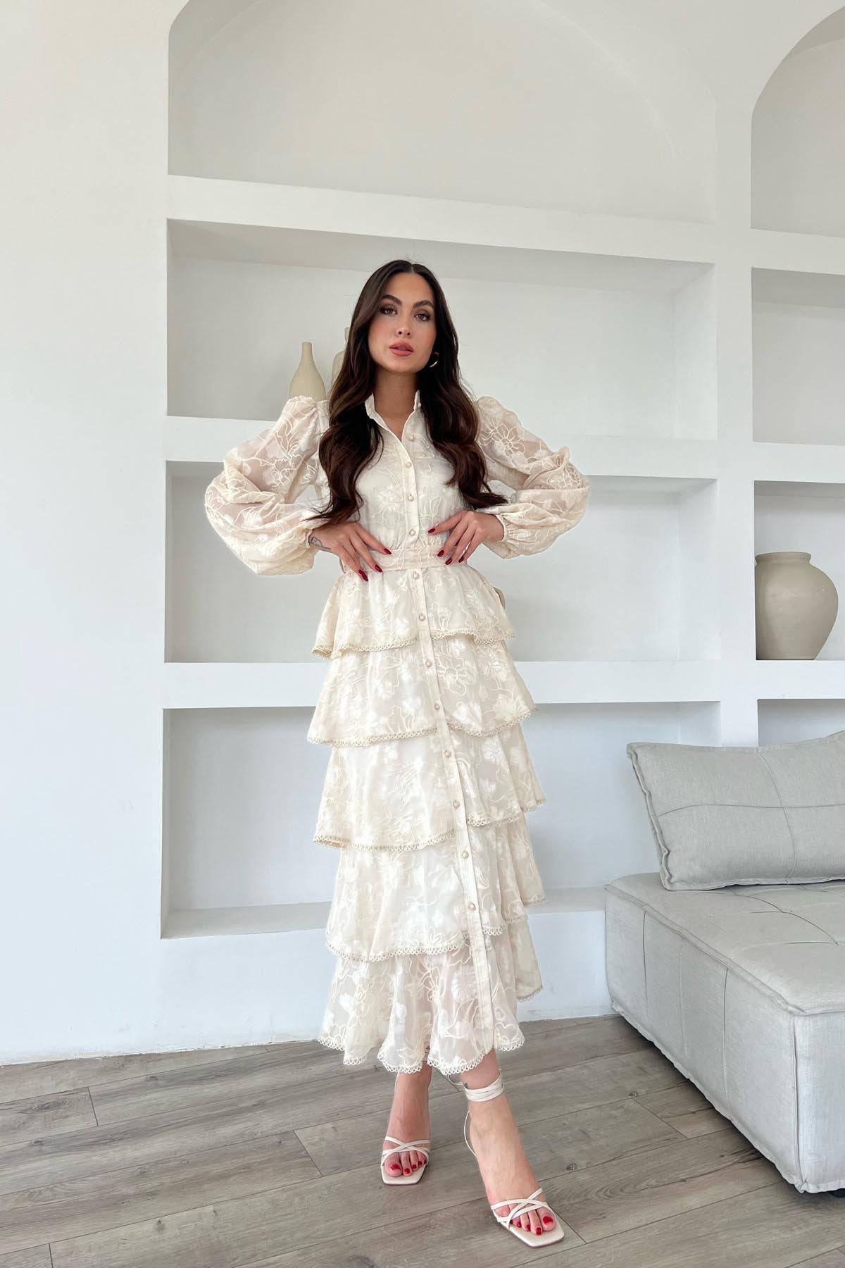 Bej Valonlu Şerit Detaylı Kat Kat Elbise SY-1747-Bej