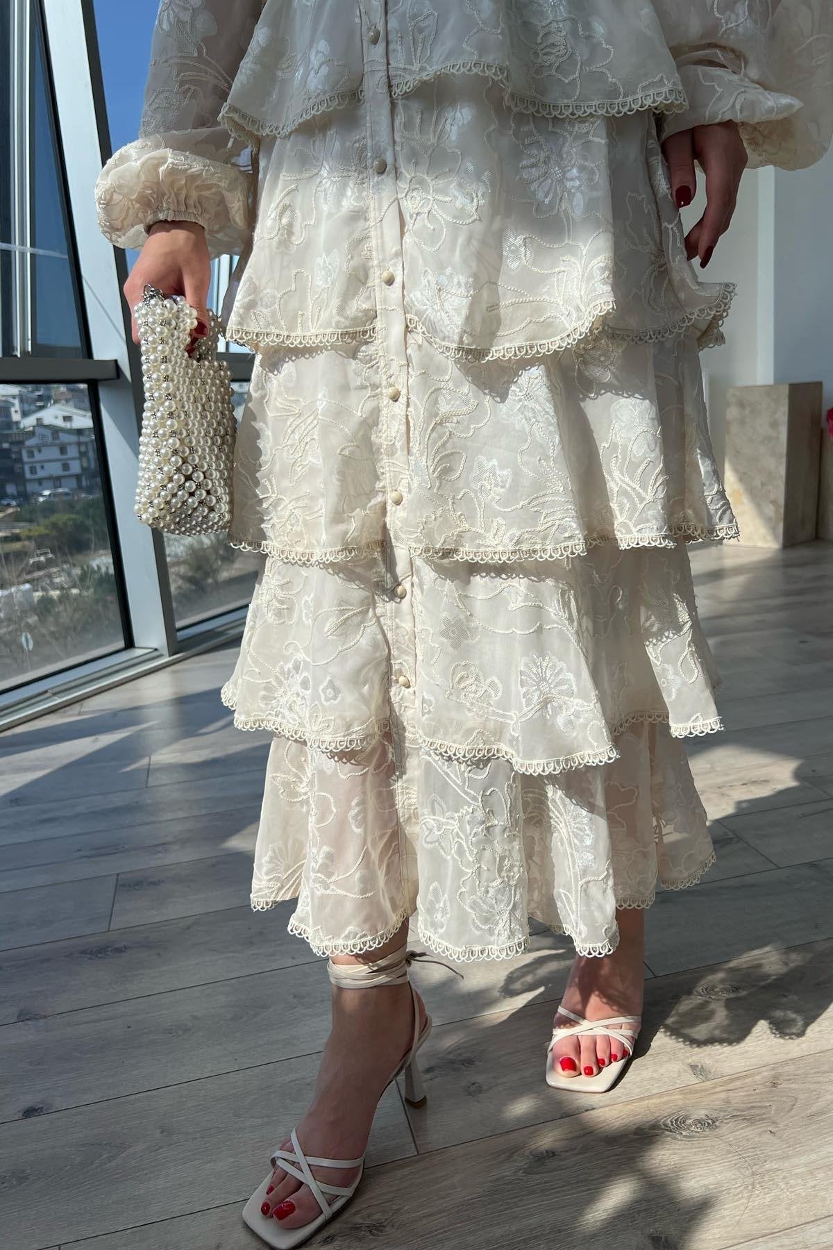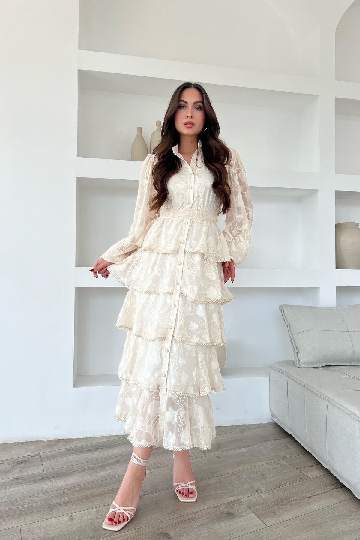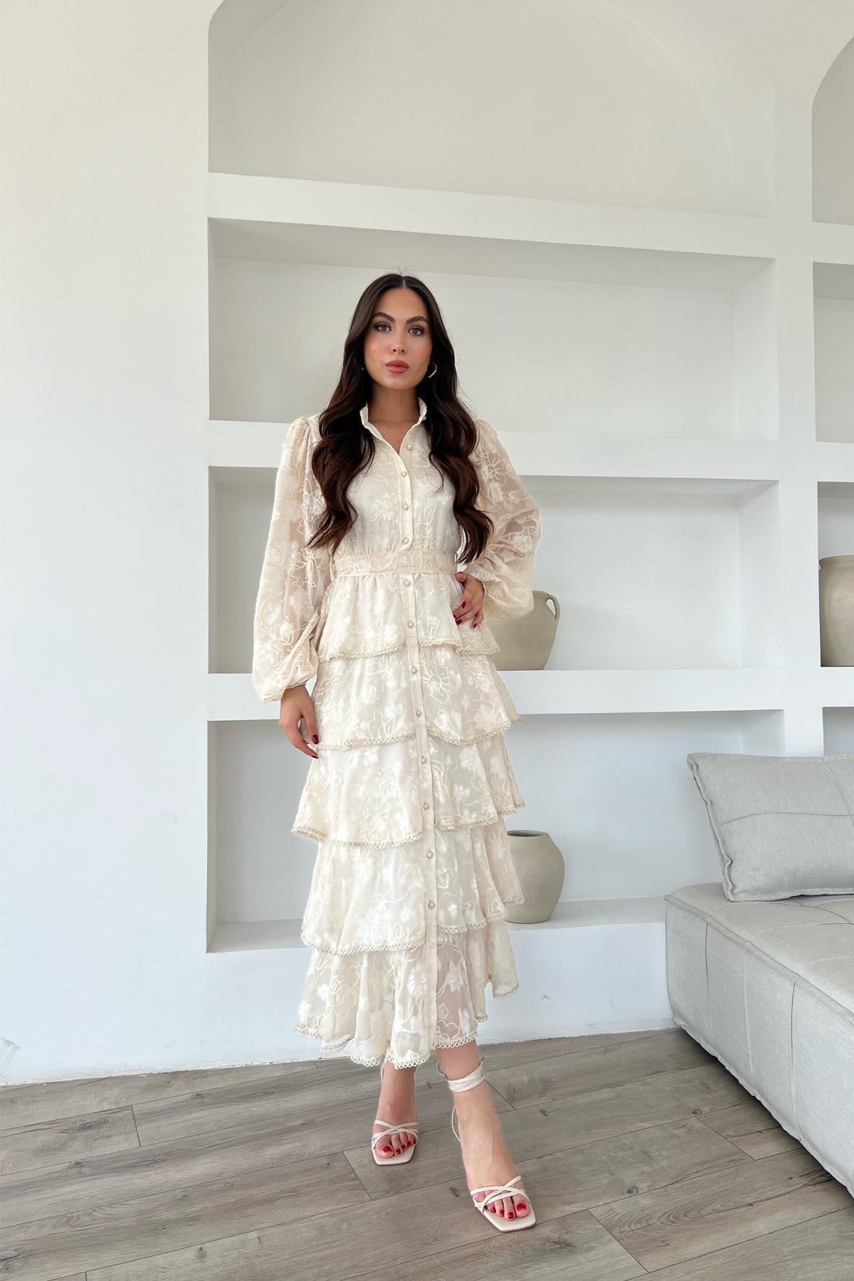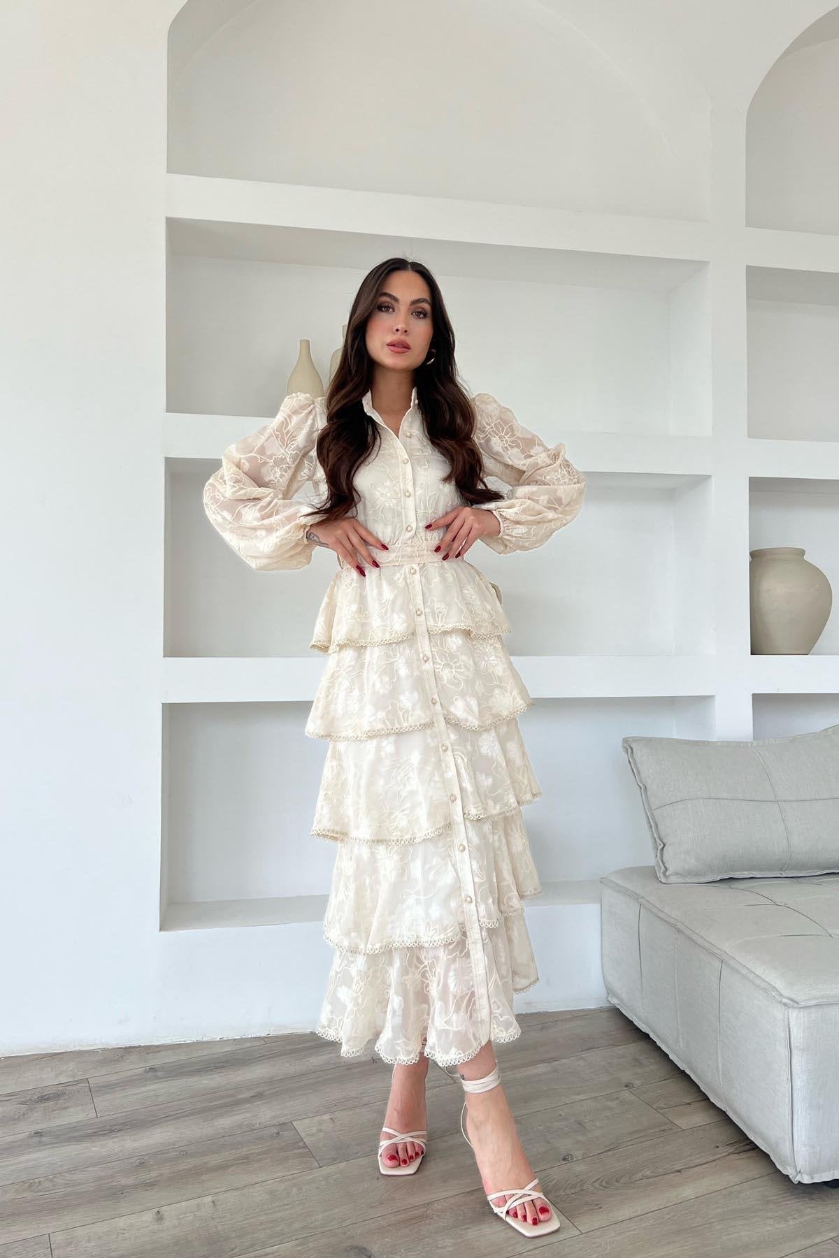 Bej Valonlu Şerit Detaylı Kat Kat Kuşaksız Elbise SY-2963-Bej