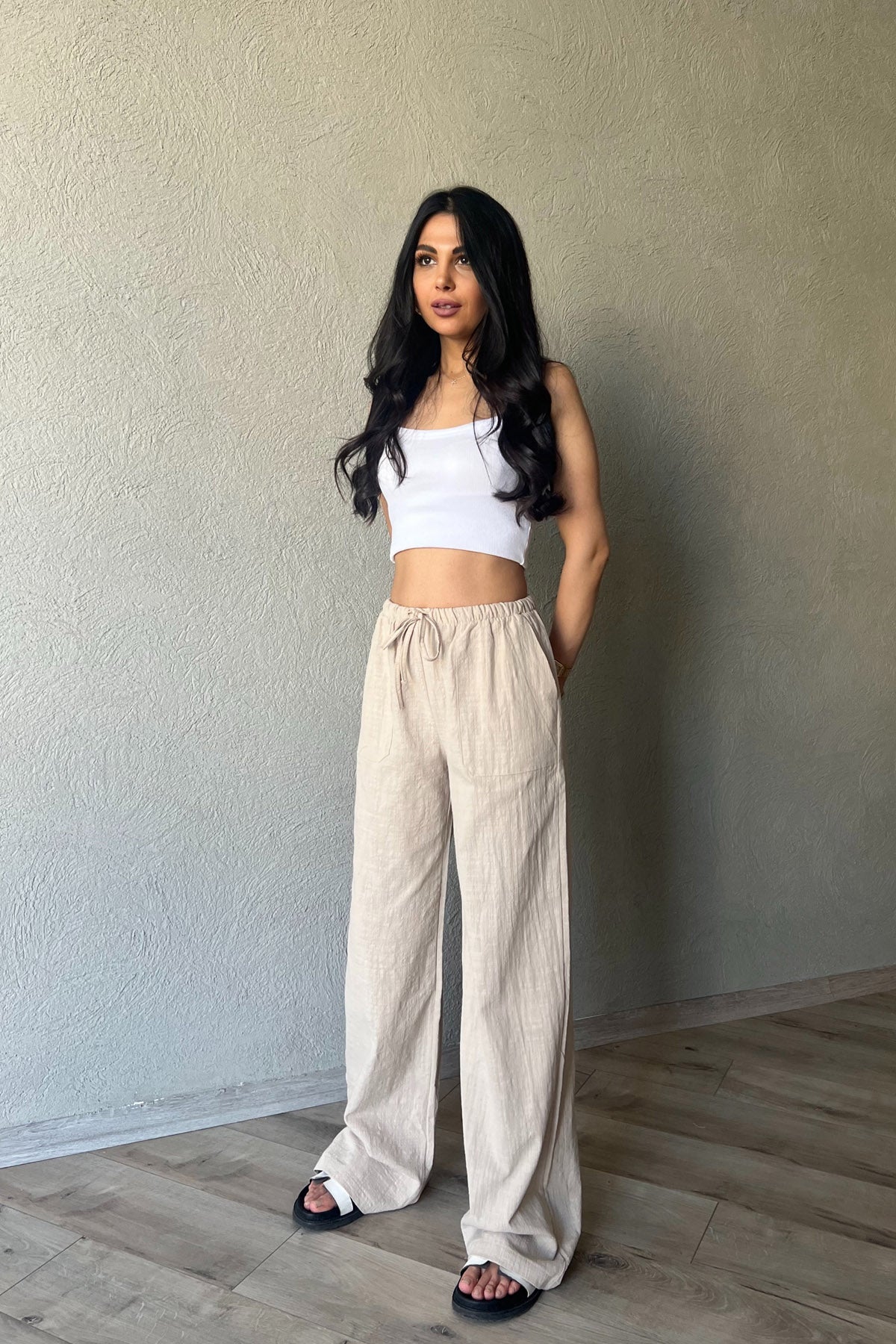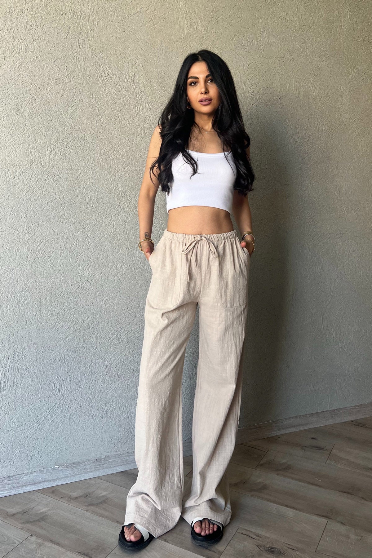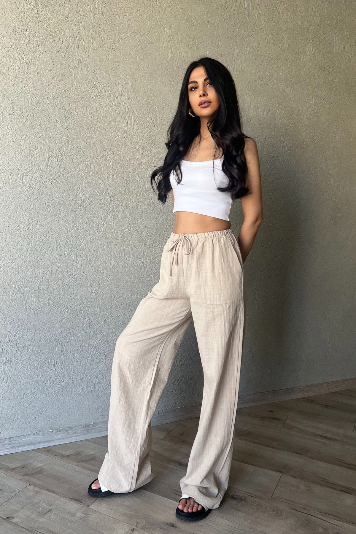 Ürün Özellikleri:Yama Cepli Beli Bağcıklı Bol Paça Keten Pantolon