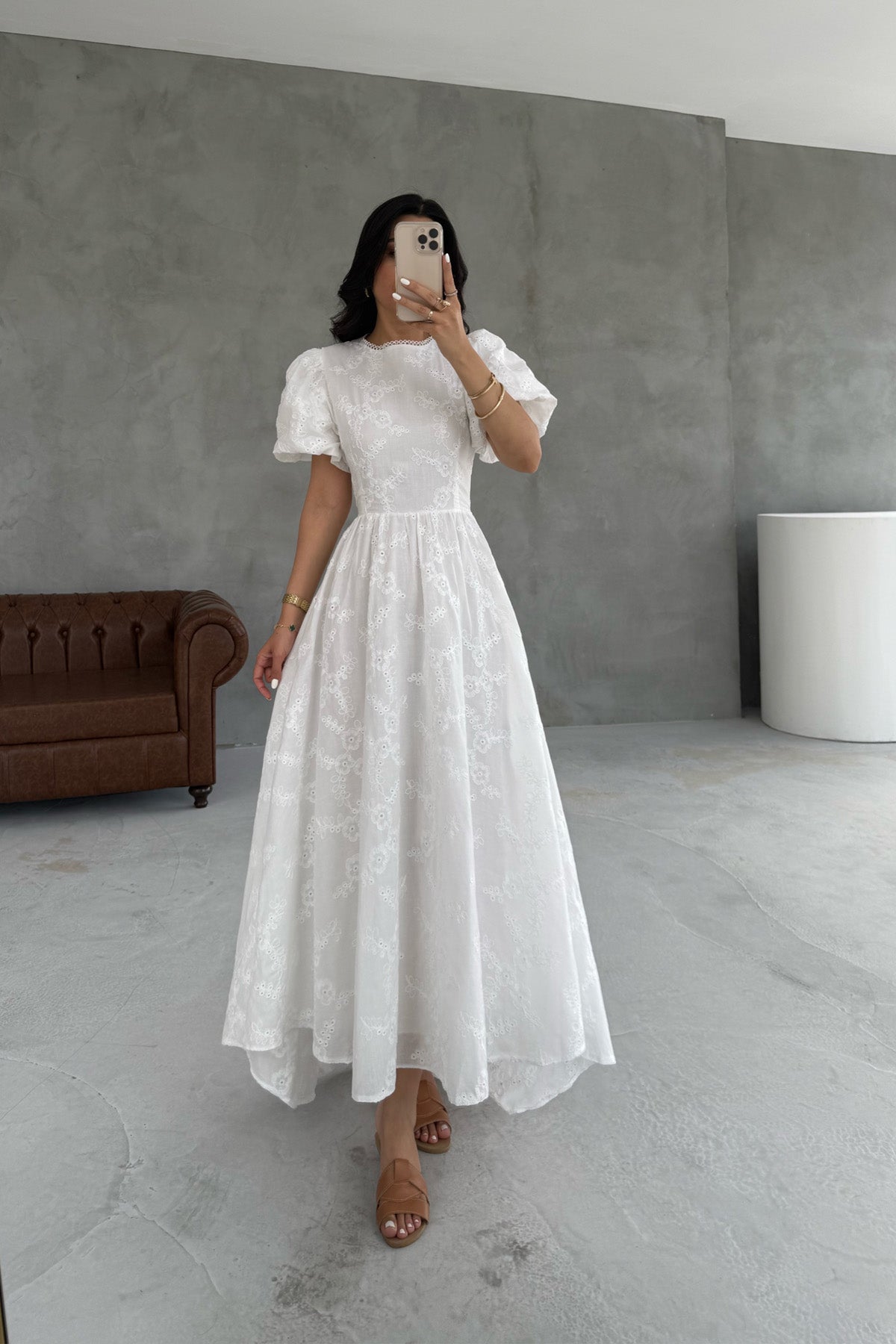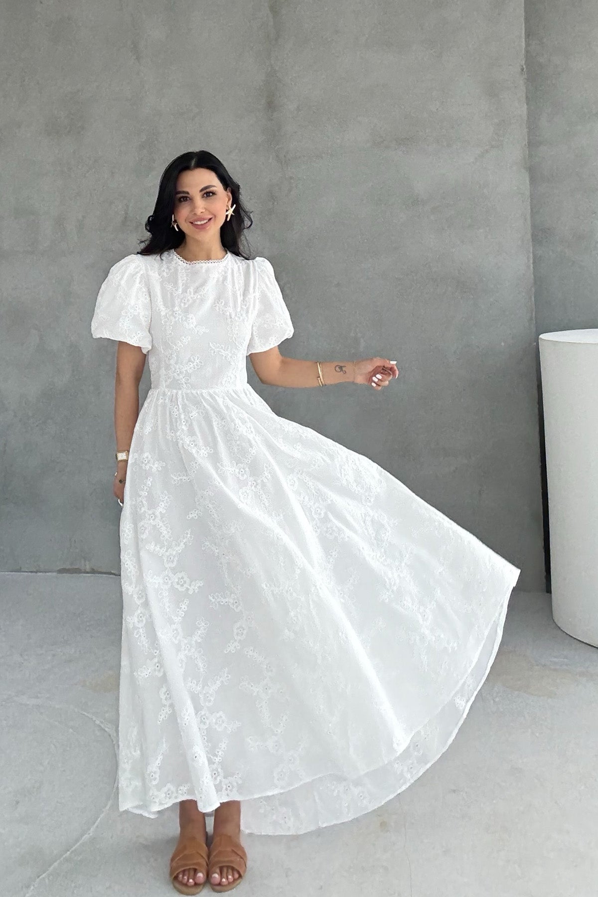 Ürün Detayları ; Beyaz Balon kol Arkası Bağlamalı Brode Elbise