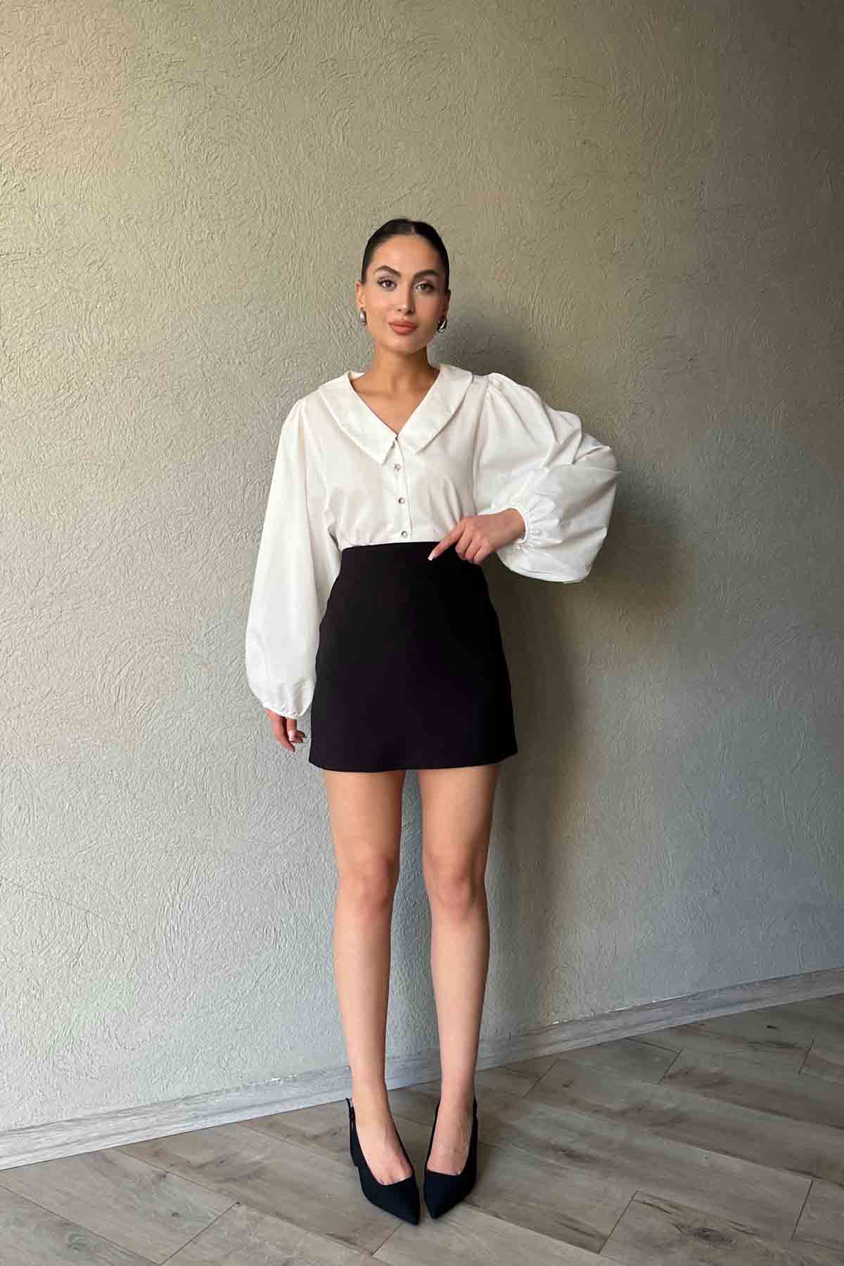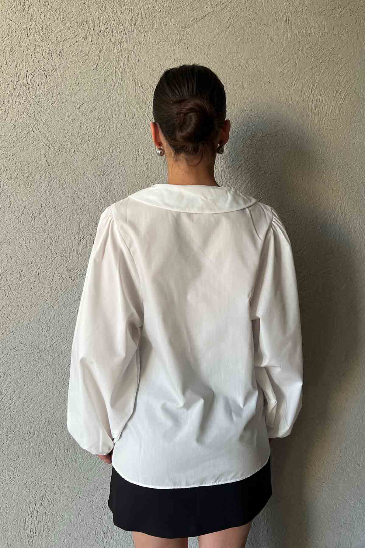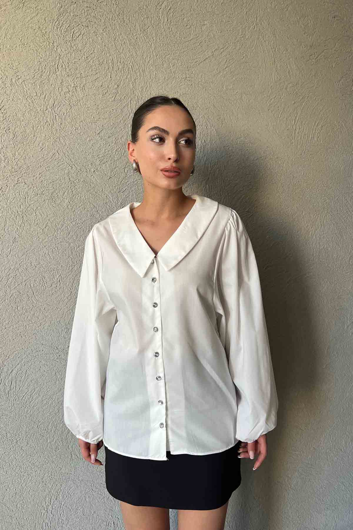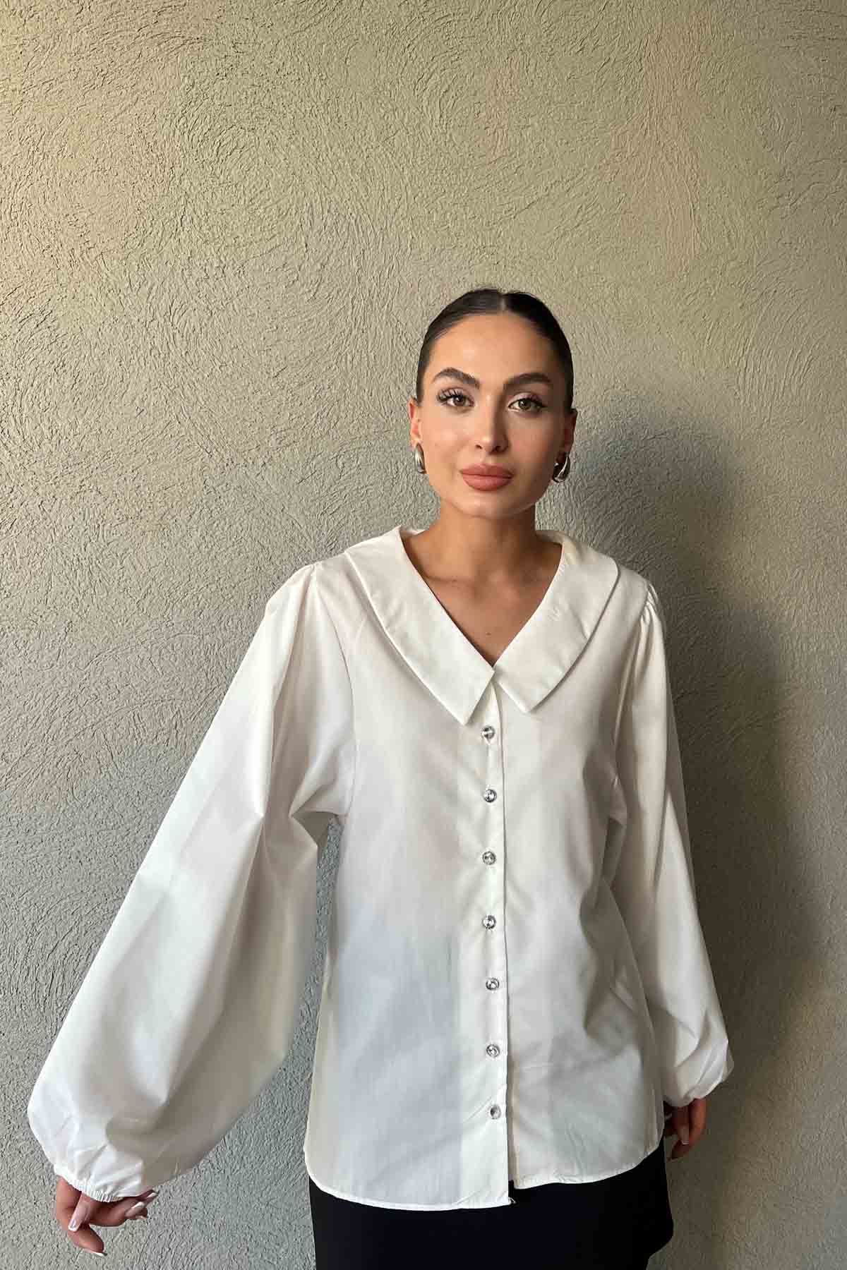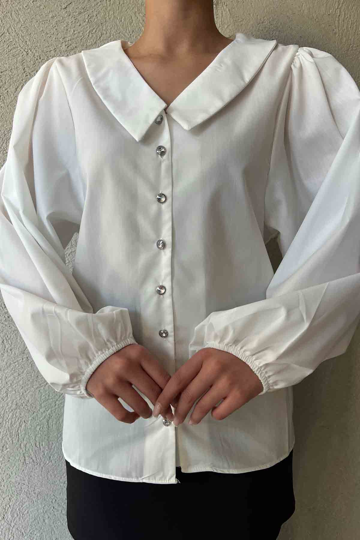 Beyaz Bebe Yaka Taş Düğme Detaylı Balon Kol Gömlek SY-1819-Beyaz
