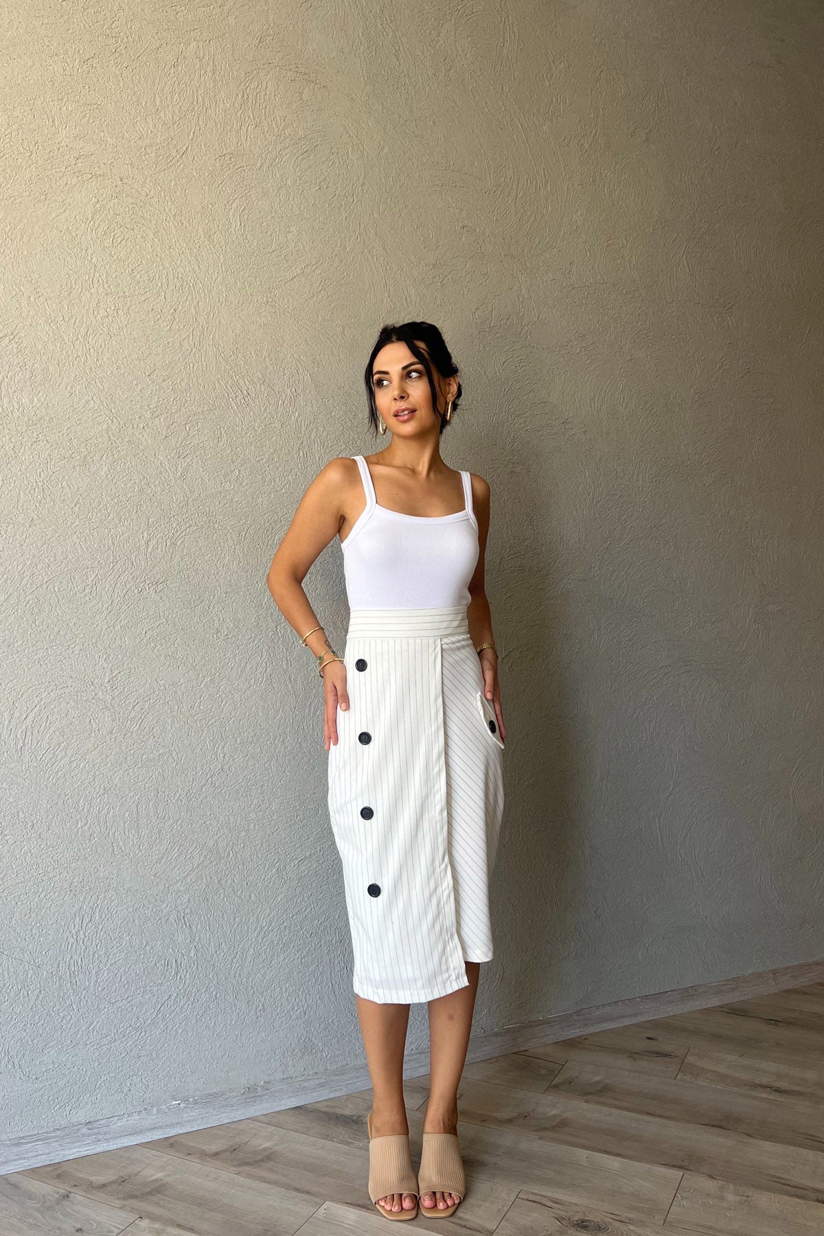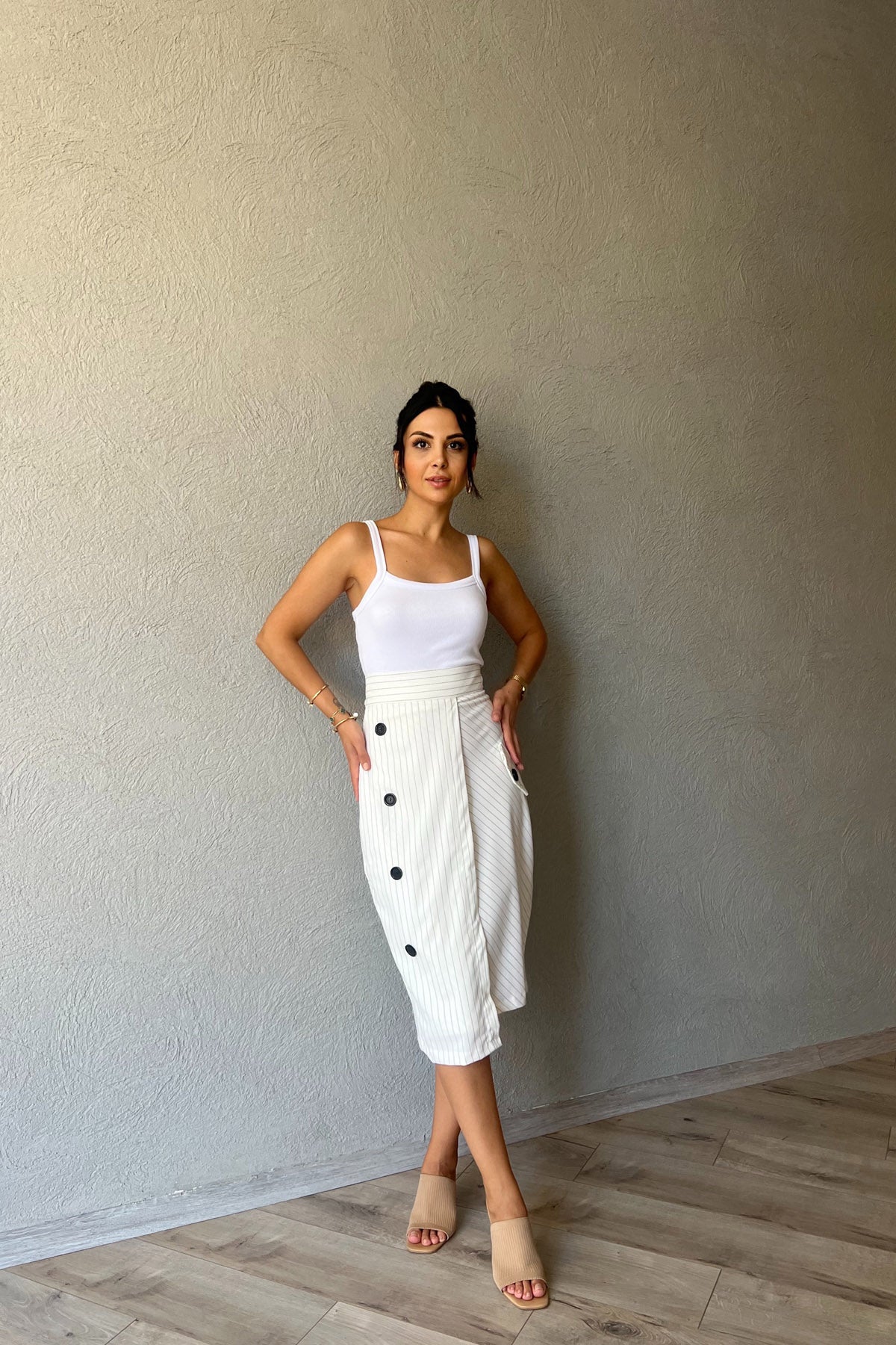 Ürün Detayları ; Beyaz Çizgili Midi Boy Etek